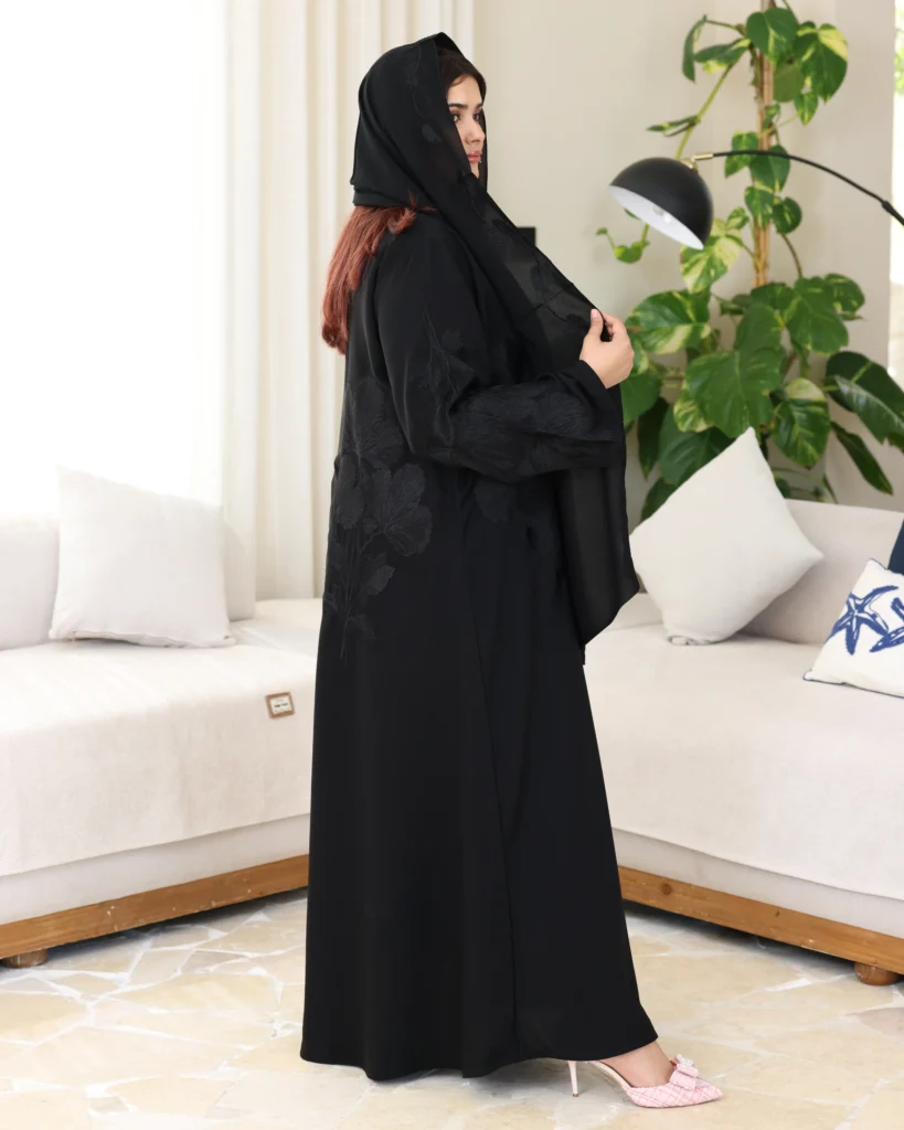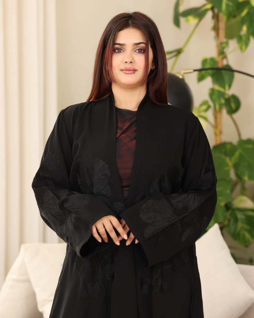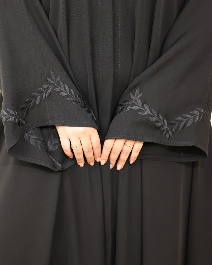 عباية فزة شك اسود ورق شجر من امام و اكمام