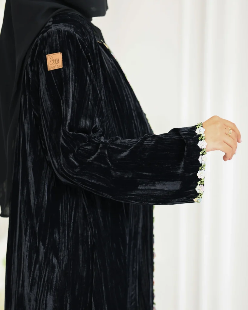 عباية قطيفة كامل باكمام منقشة بمخمل