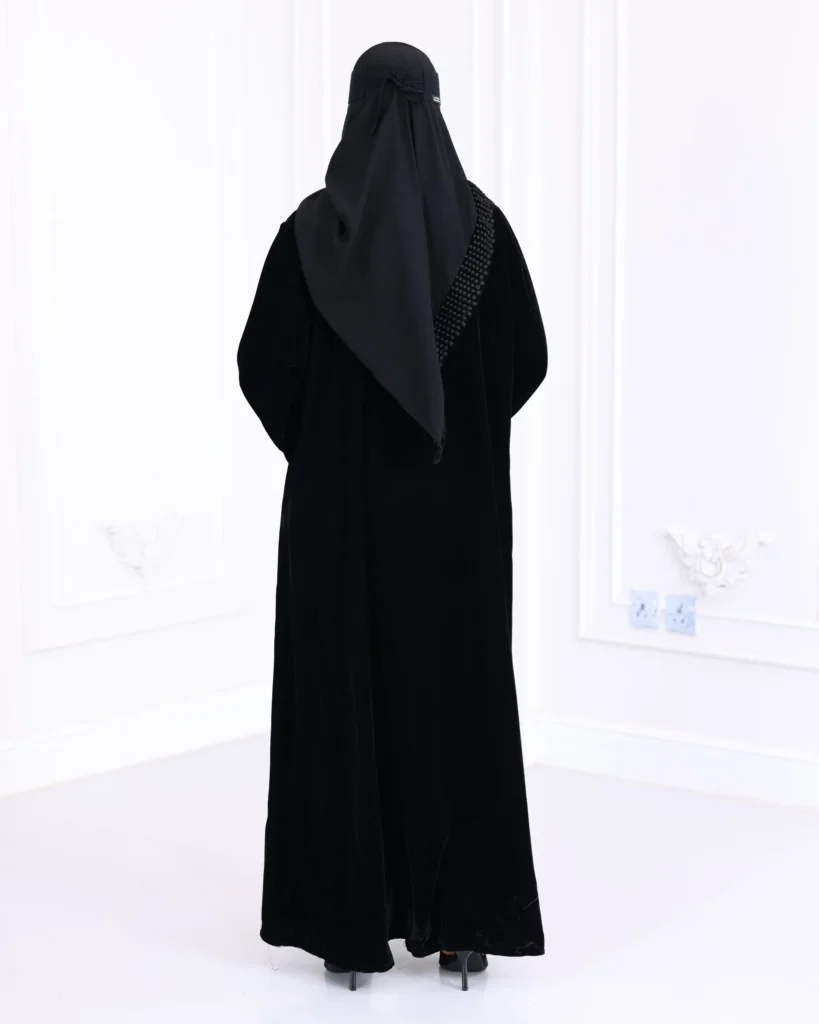 عباية مخمل مطرزة بدقات بلون اسود مع طرحة