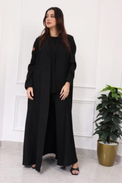 عباية ثلاث قطع أسود طقم (عباية + جاكيت + بنطلون) منسوجة من قماش كريب واقف