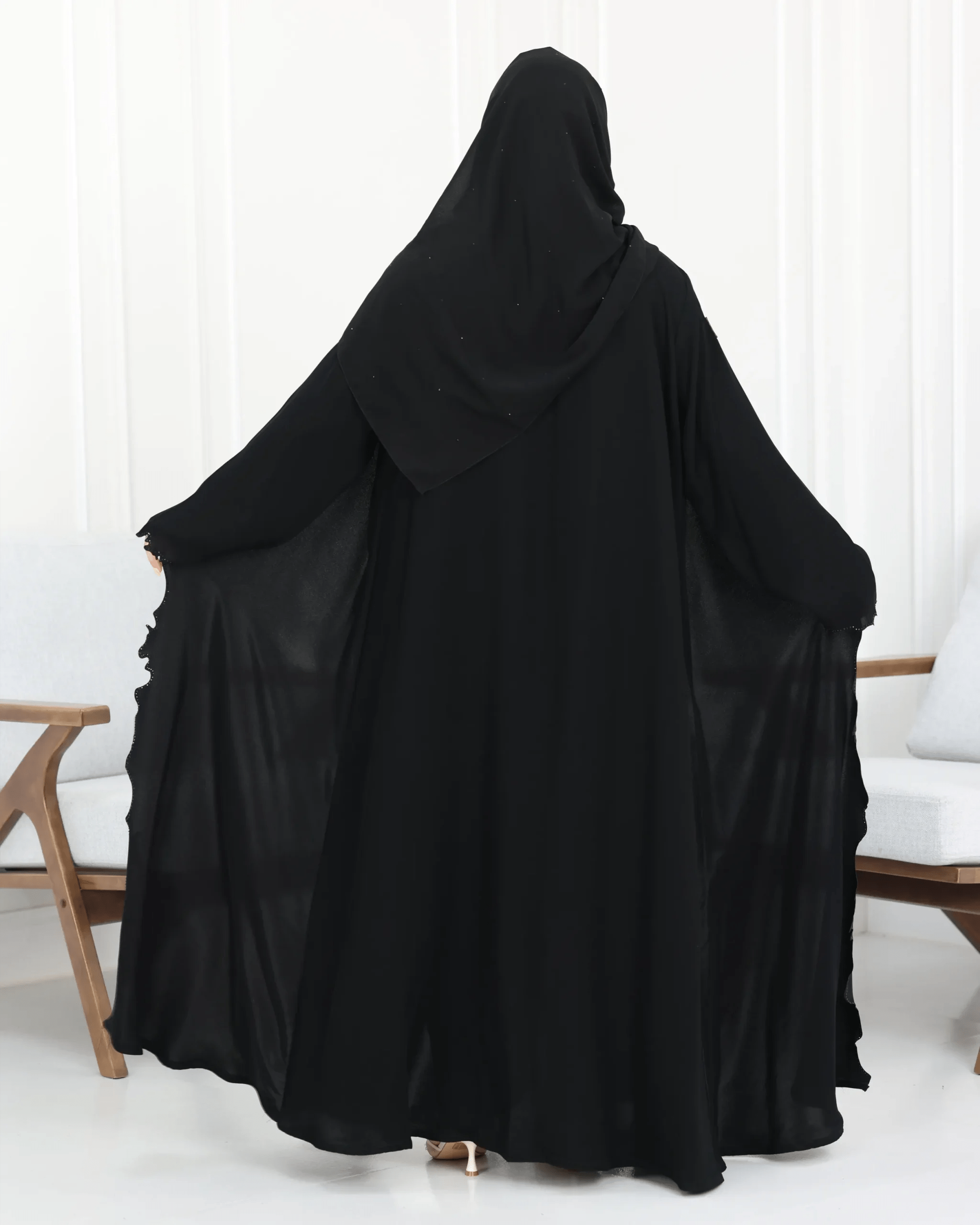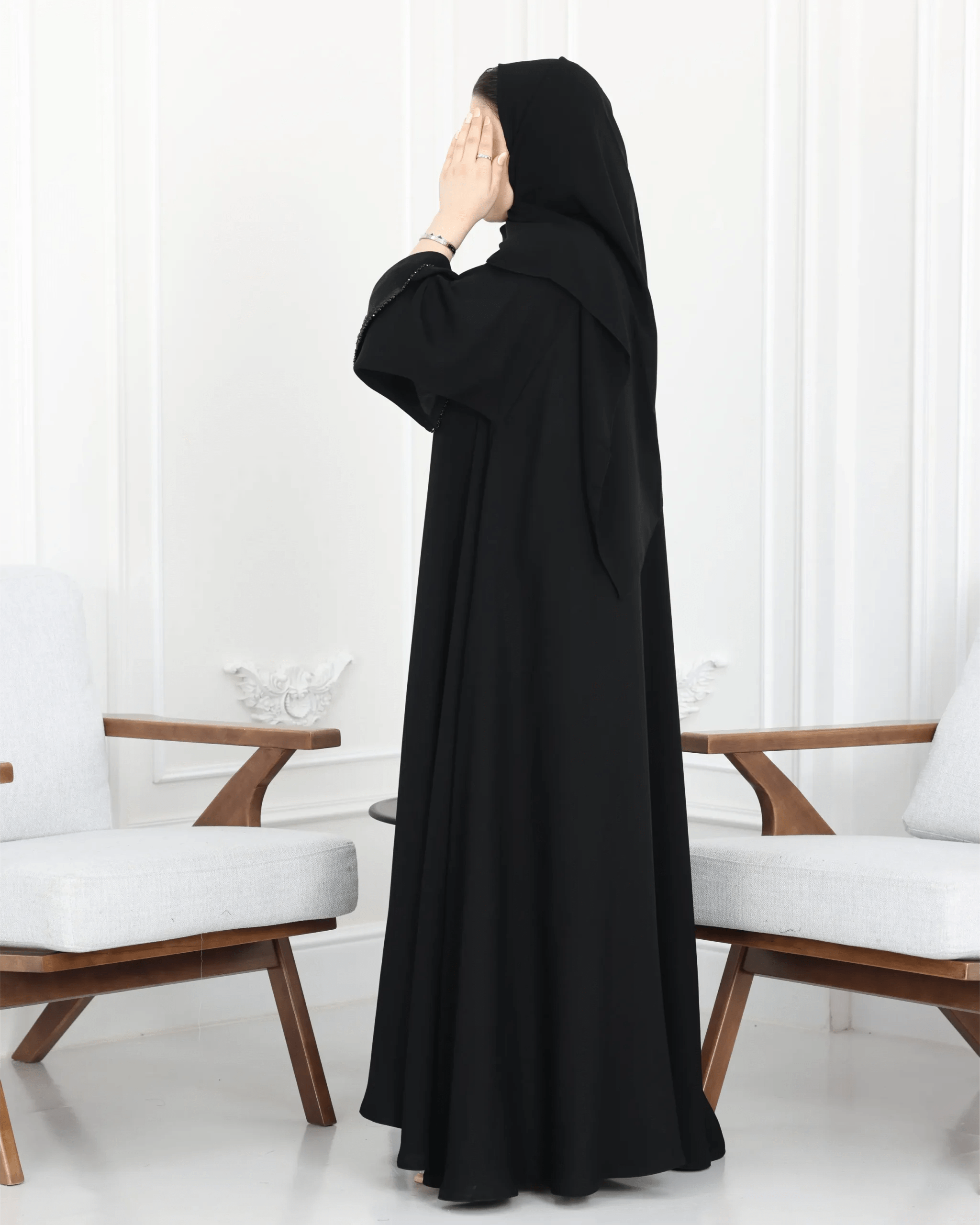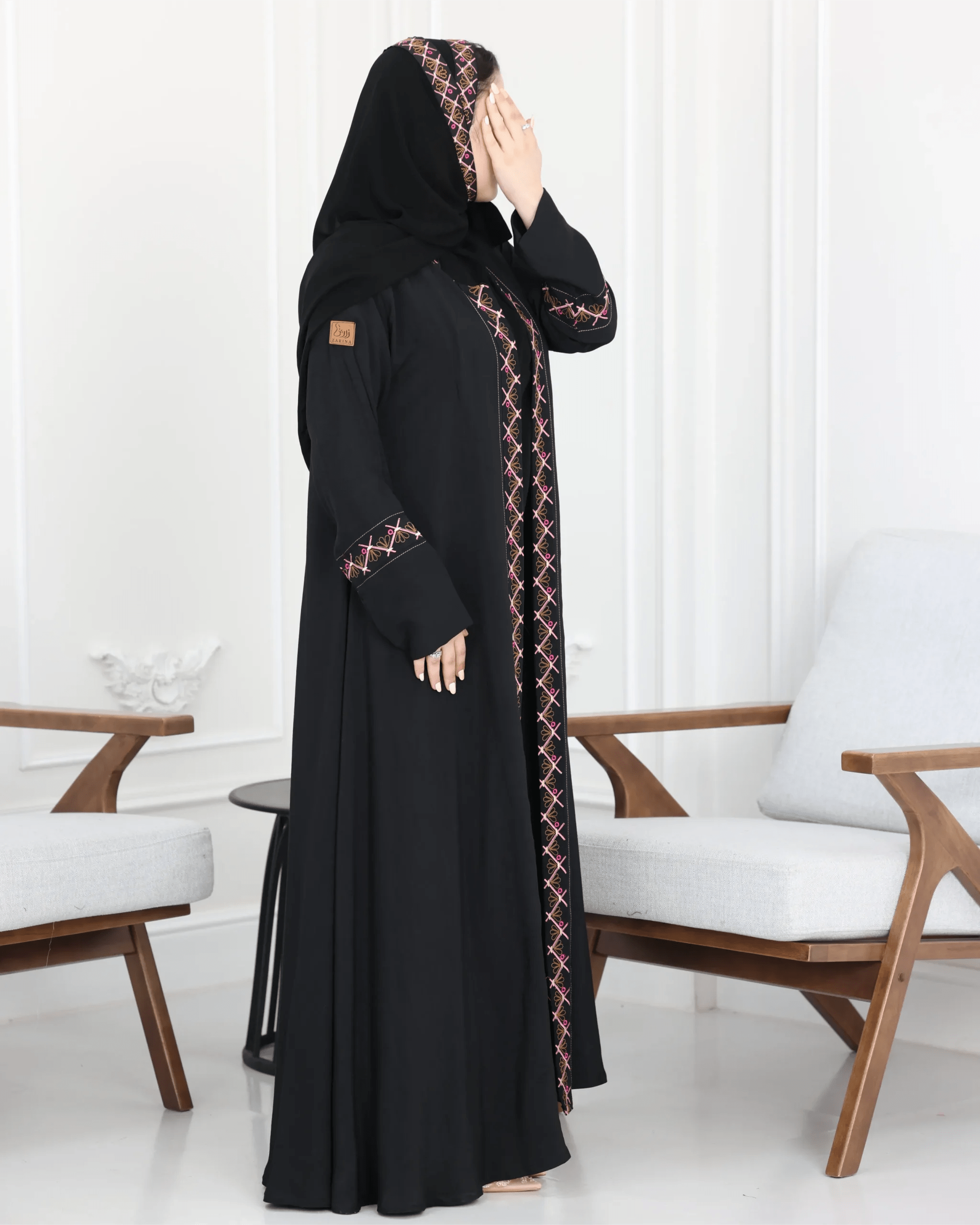عباية اسود كلوش بقماش باربي بتطريز لون بنك