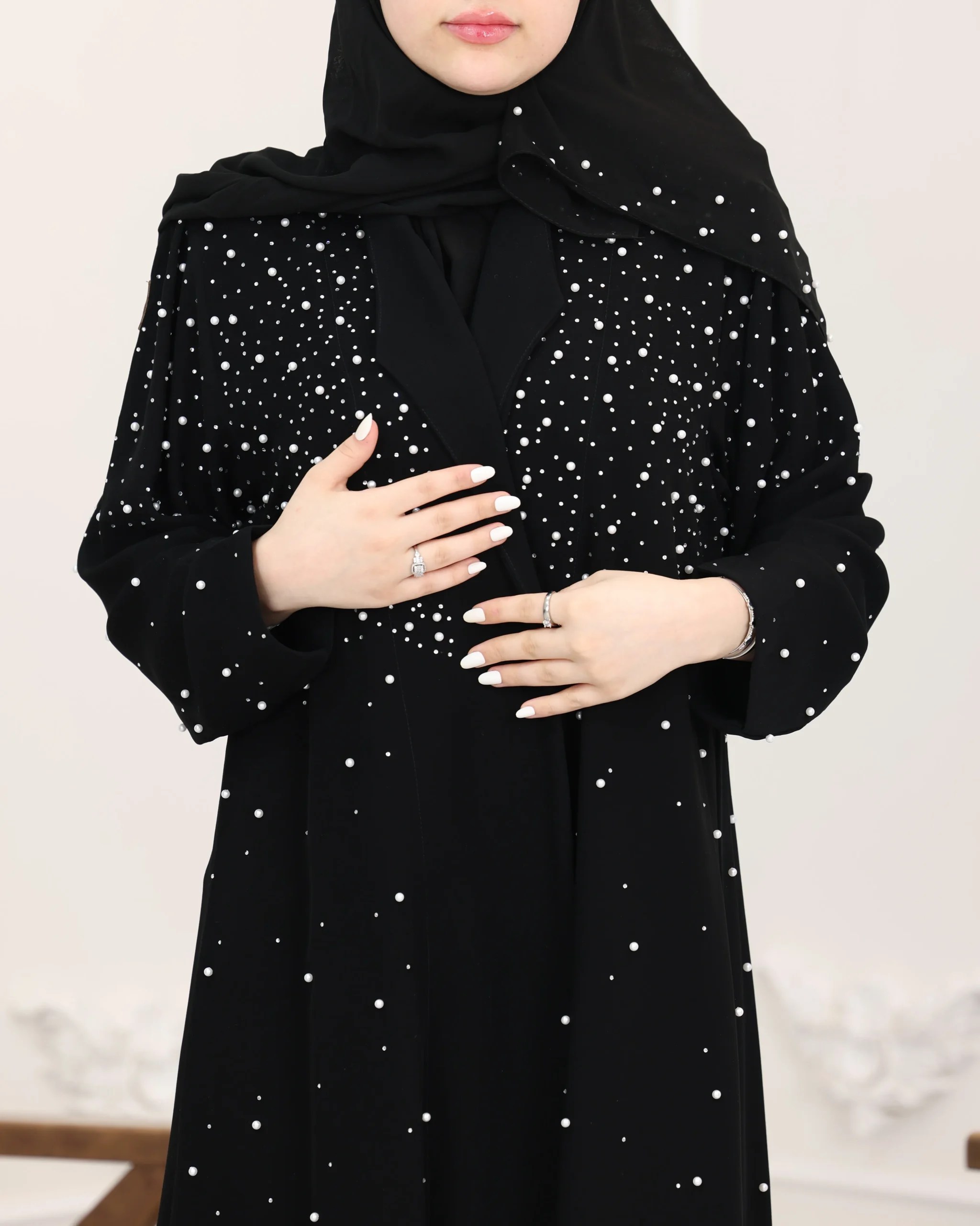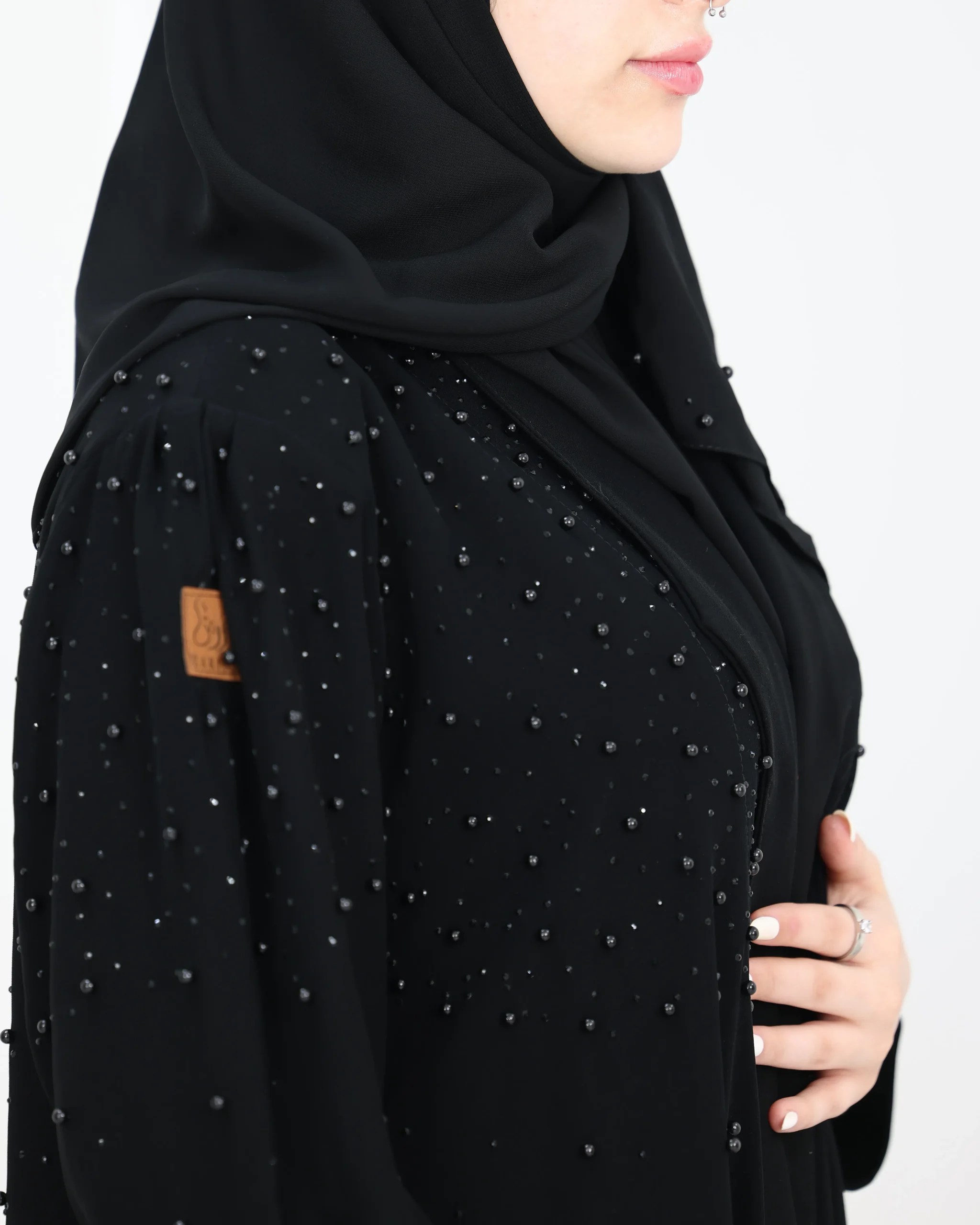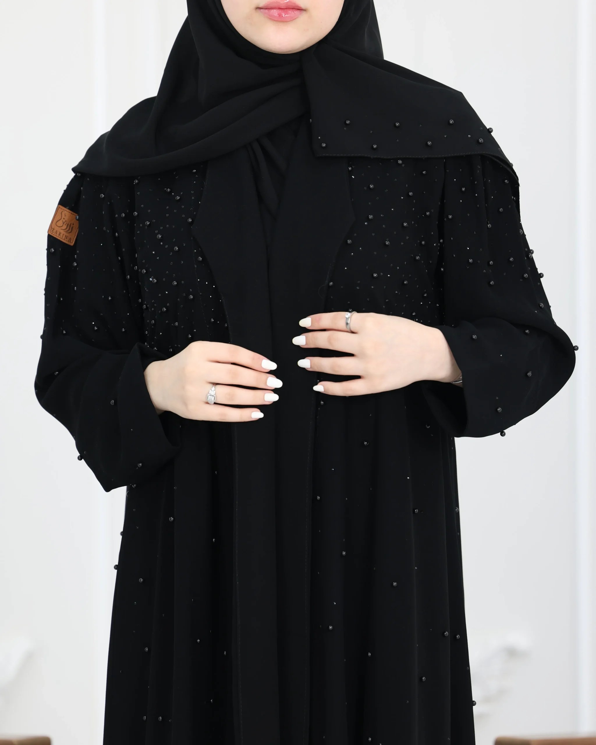 عباية اسود كلوش بقماش باربي بتطريز لون بنك