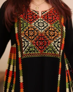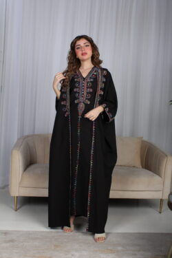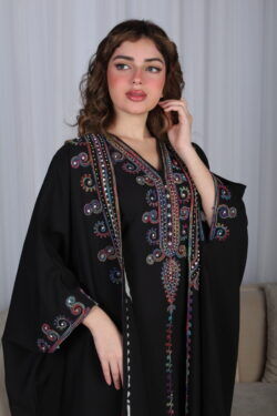 جلابية اسود ملكي قطعتين بتطريز دقات ملونة من الأمام و اكمام
