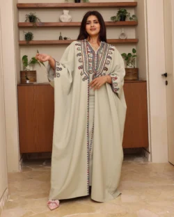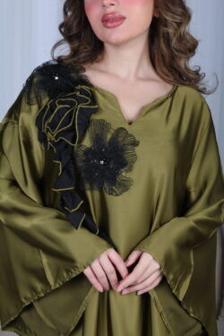 جلابية مخاوير زيتي مطرزة بوردة فخمة وأنيقة