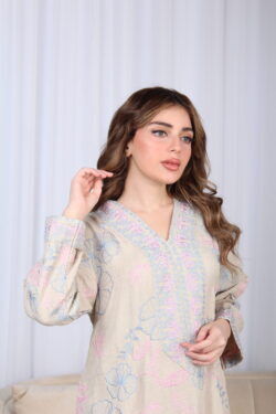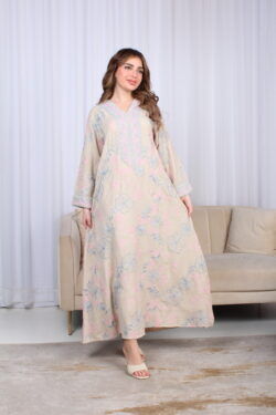 جلابية بيج مطرزة بوردي و رصاصي بدقاق مخفية