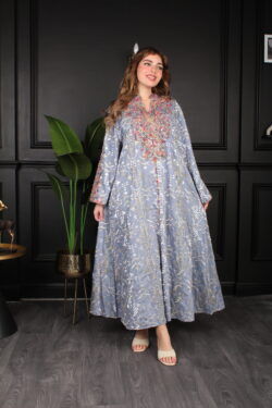 جلابية سماوي مزينه بدقات زرار من امام و فصوص