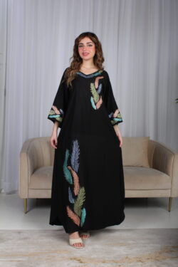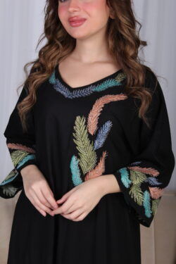 جلابية اسود مرسومه باوراق شجرة بالوان و مفصصة