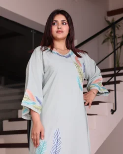 جلابية سماوي بتطريز دقات ملونة من الأمام و قماش لفتة