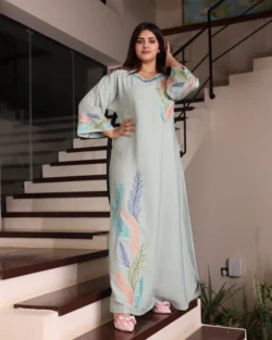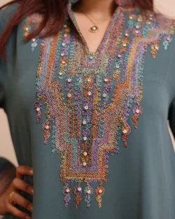 جلابية بياقة تركواز بترتر وتطريز كامل بورود