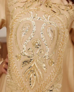جلابية بيج ملكي قطعتين بتطريز دقات ملونة من الأمام و اكمام