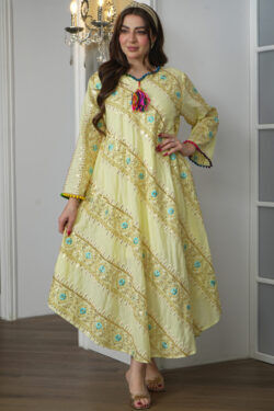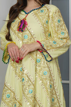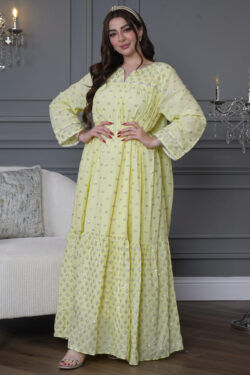 جلابيه اصفر بكلوش صغير و ترتر كامل على شكل ورود صغير