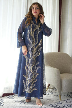 جلابيه كحلي خليجيه بلياقه بشك ترتر و فصوص ذهبي