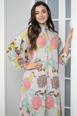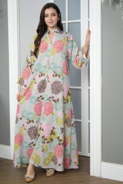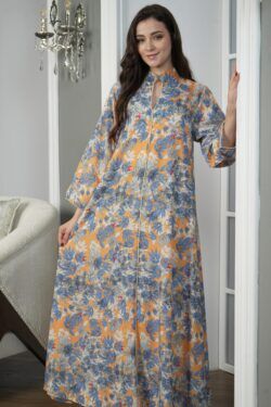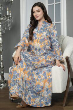 جلابيه سماوي قطن بلياقه مشجره بورود ملون (٥)