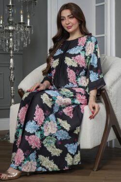 جلابيه اسود مرسومه بورود ملون و كبس لولو