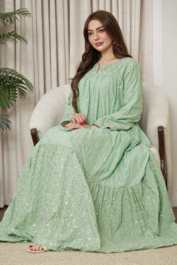 جلابيه تيفاني بكلوش صغير و ترتر كامل على شكل ورود صغير
