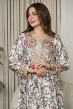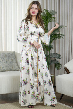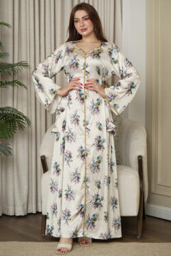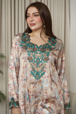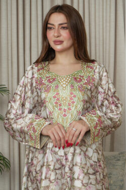 جلابيه بيج بلياقه مرسوم على شكل ورق شجر (3)
