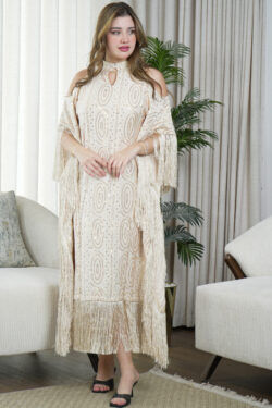 فستان بيج مطرز بترترة و هدب من الأطراف
