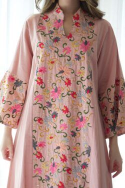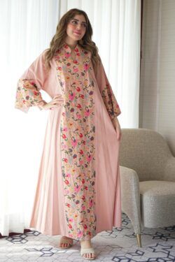جلابيه وردي خليجيه بلياقه مطرزه بورود ملونه من امام و خلف