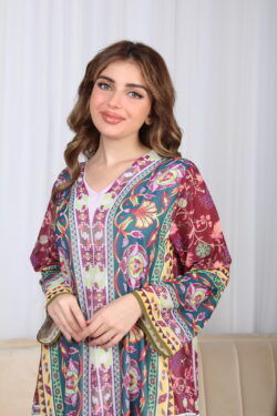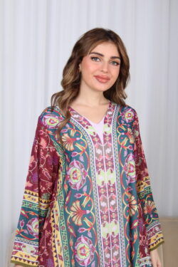 جلابية عنابي حرير بالوان مشجره و فصوص