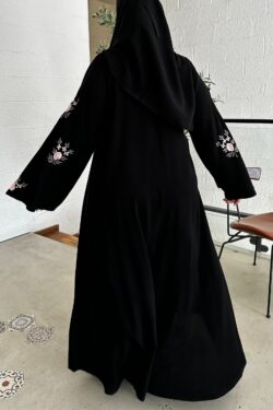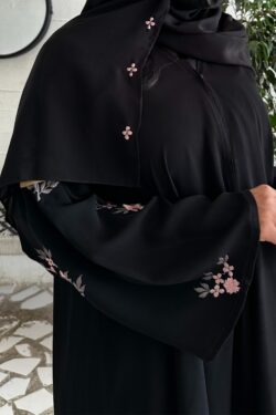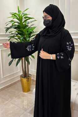 عبايه بخيوط بشك ملون على اكمام بشكل و رورد ملونه