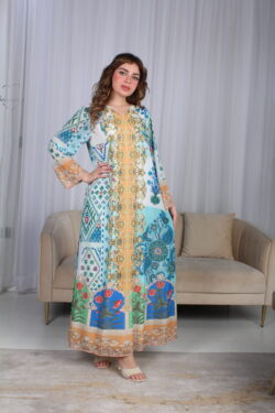 جلابية سماوي حرير بالوان مشجره و فصوص