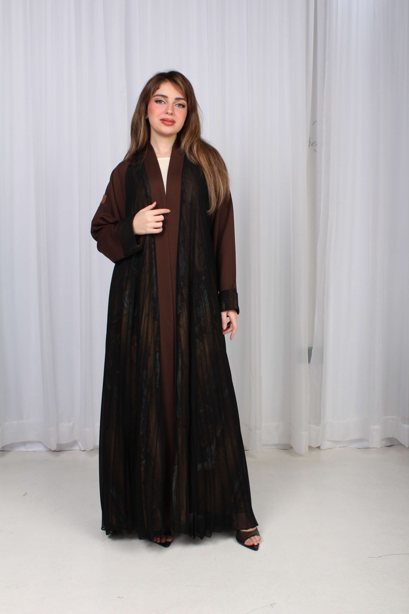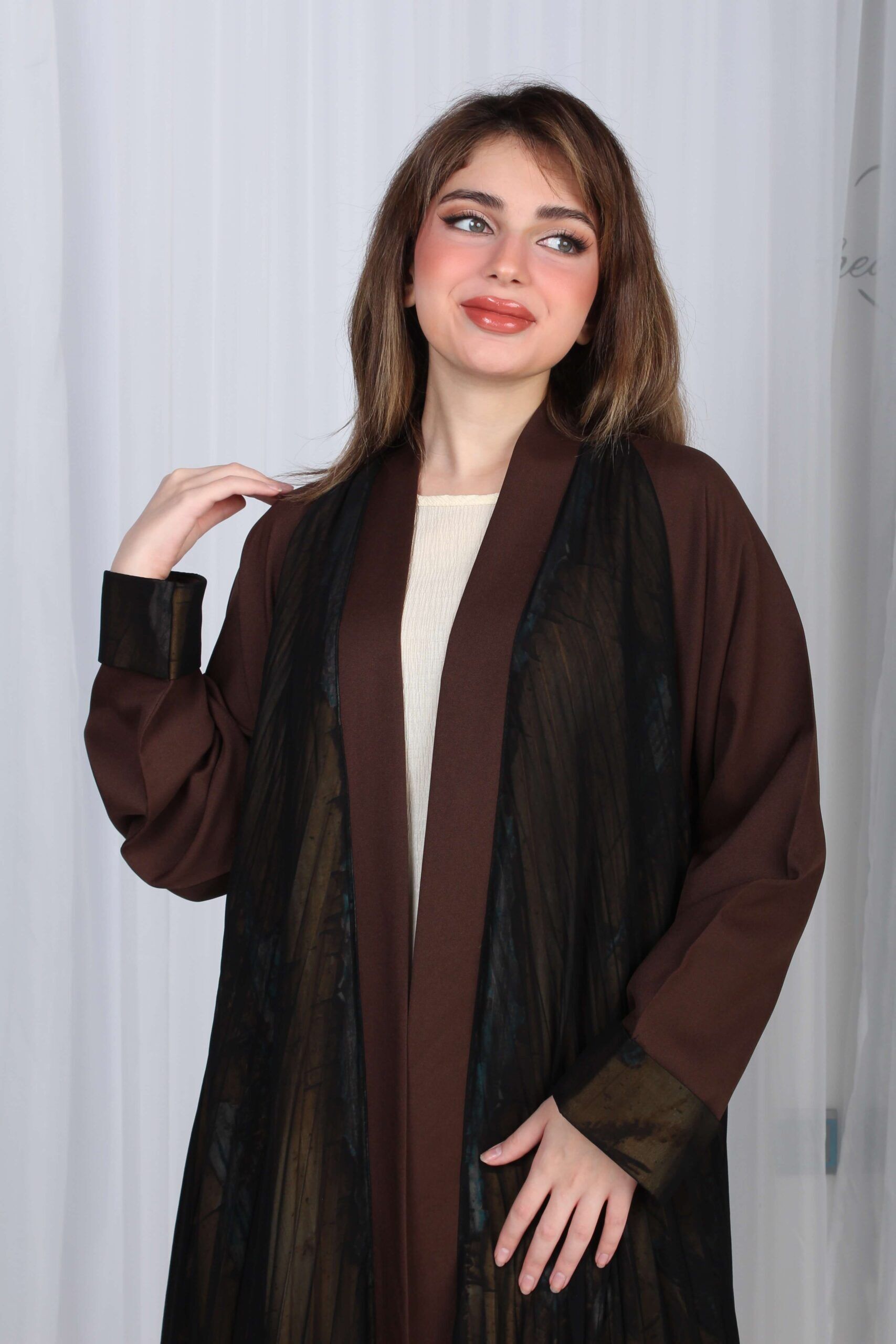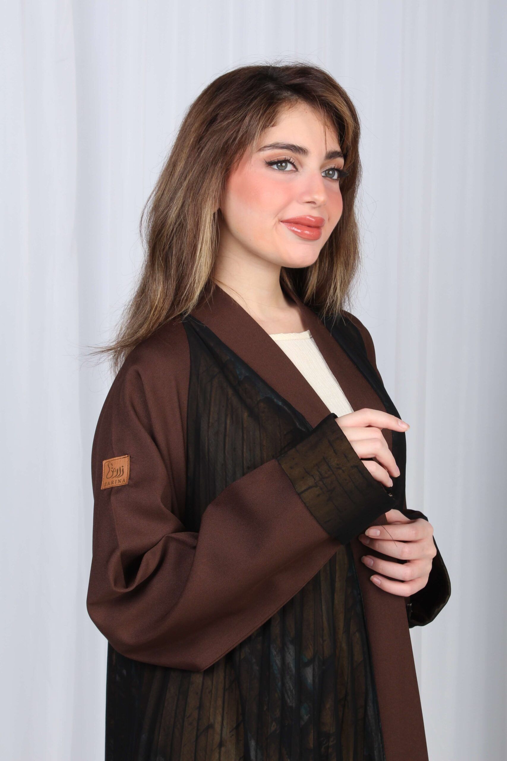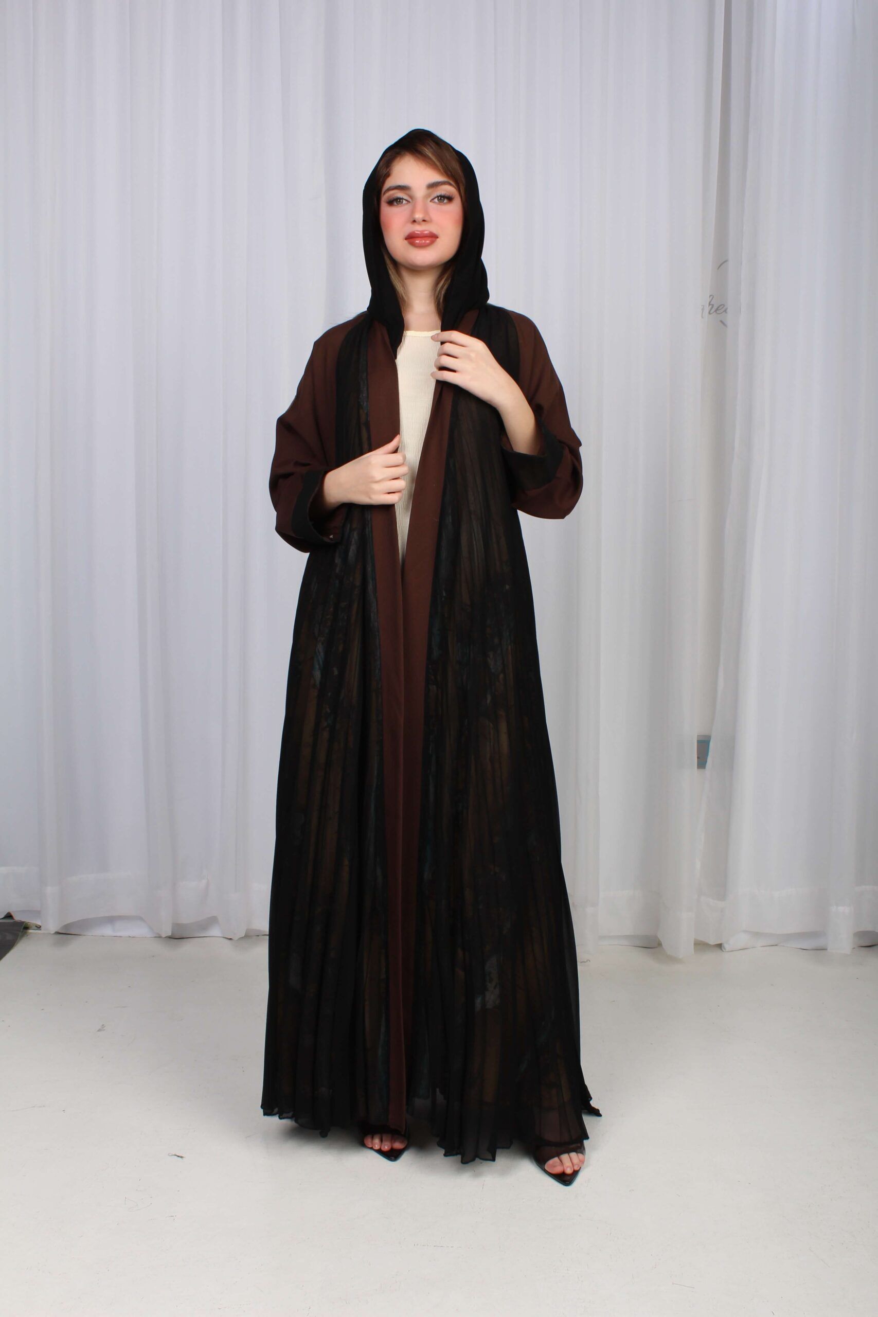 عباية بخامة شيفون مبطنة بخامة مريحة غير شفافه جاكار بني ناعم على عبايه كامل ، كما يمكنك لبسها وجهه الاخر ساده كامل صممت مفتوحة .اخترنا لها خامة شيفون من افضل الخامات العملية للبس والاستخدام اليومي