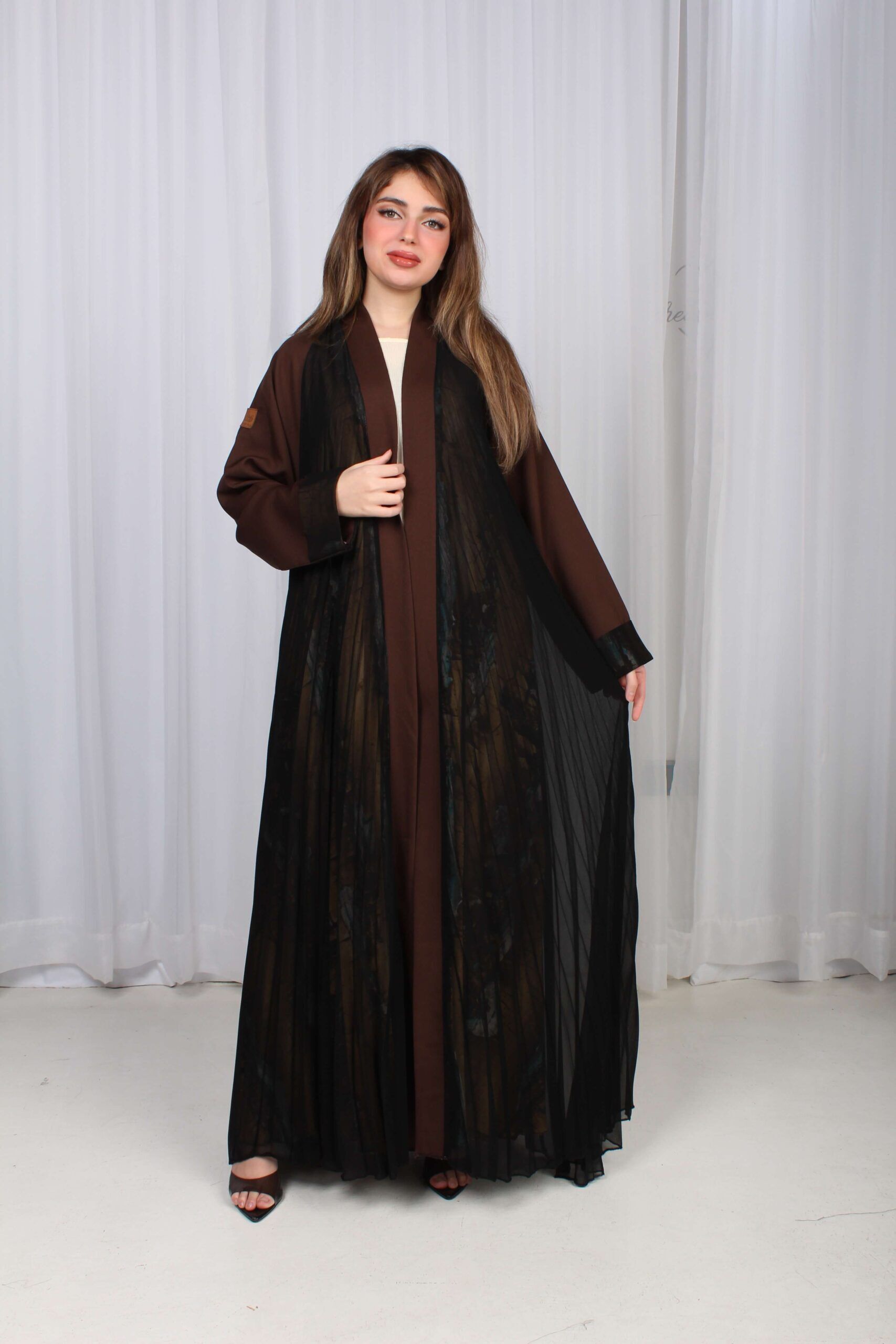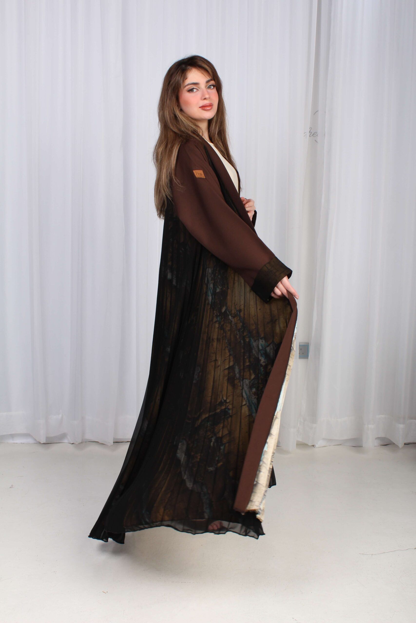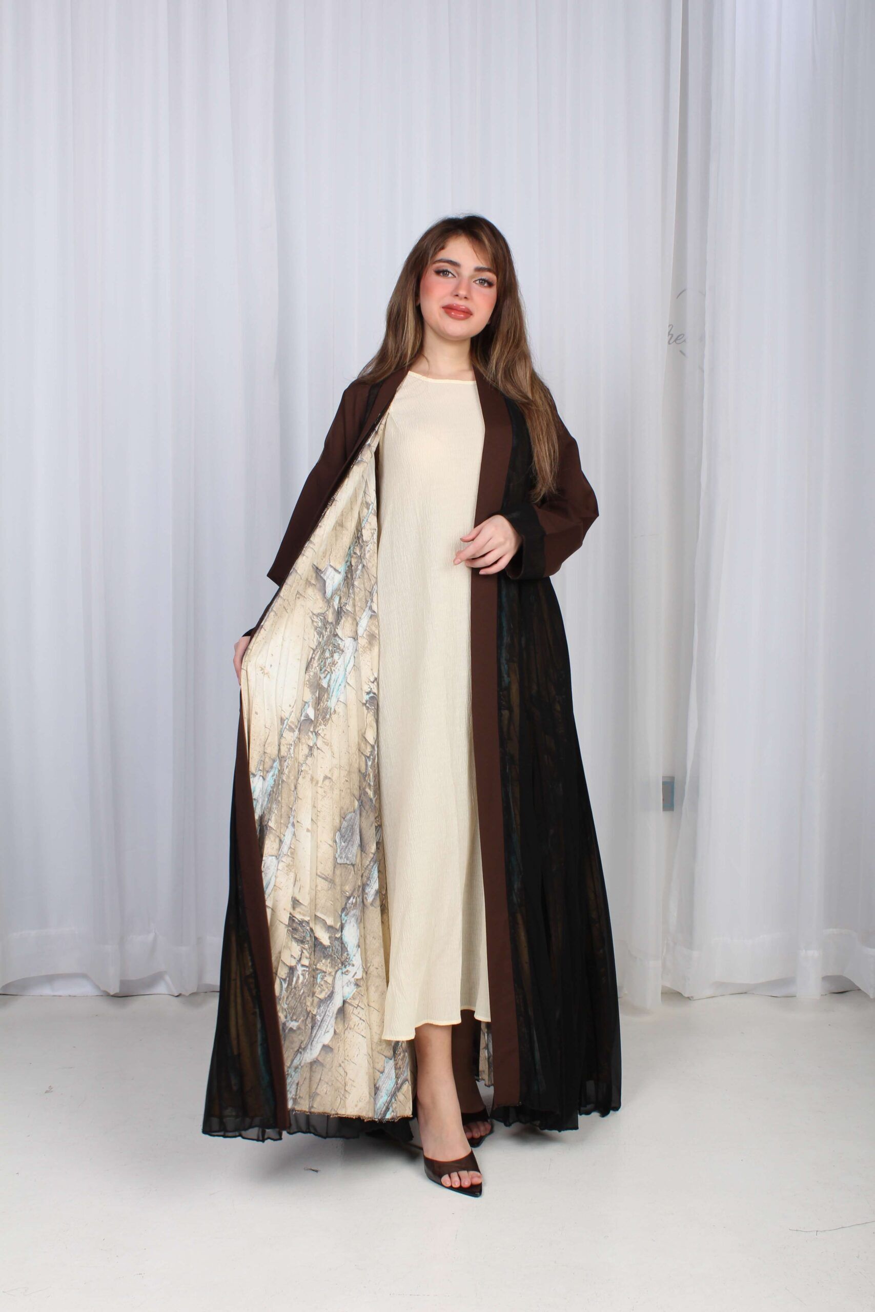 عباية بخامة شيفون مبطنة بخامة مريحة غير شفافه جاكار بني ناعم على عبايه كامل ، كما يمكنك لبسها وجهه الاخر ساده كامل صممت مفتوحة .اخترنا لها خامة شيفون من افضل الخامات العملية للبس والاستخدام اليومي