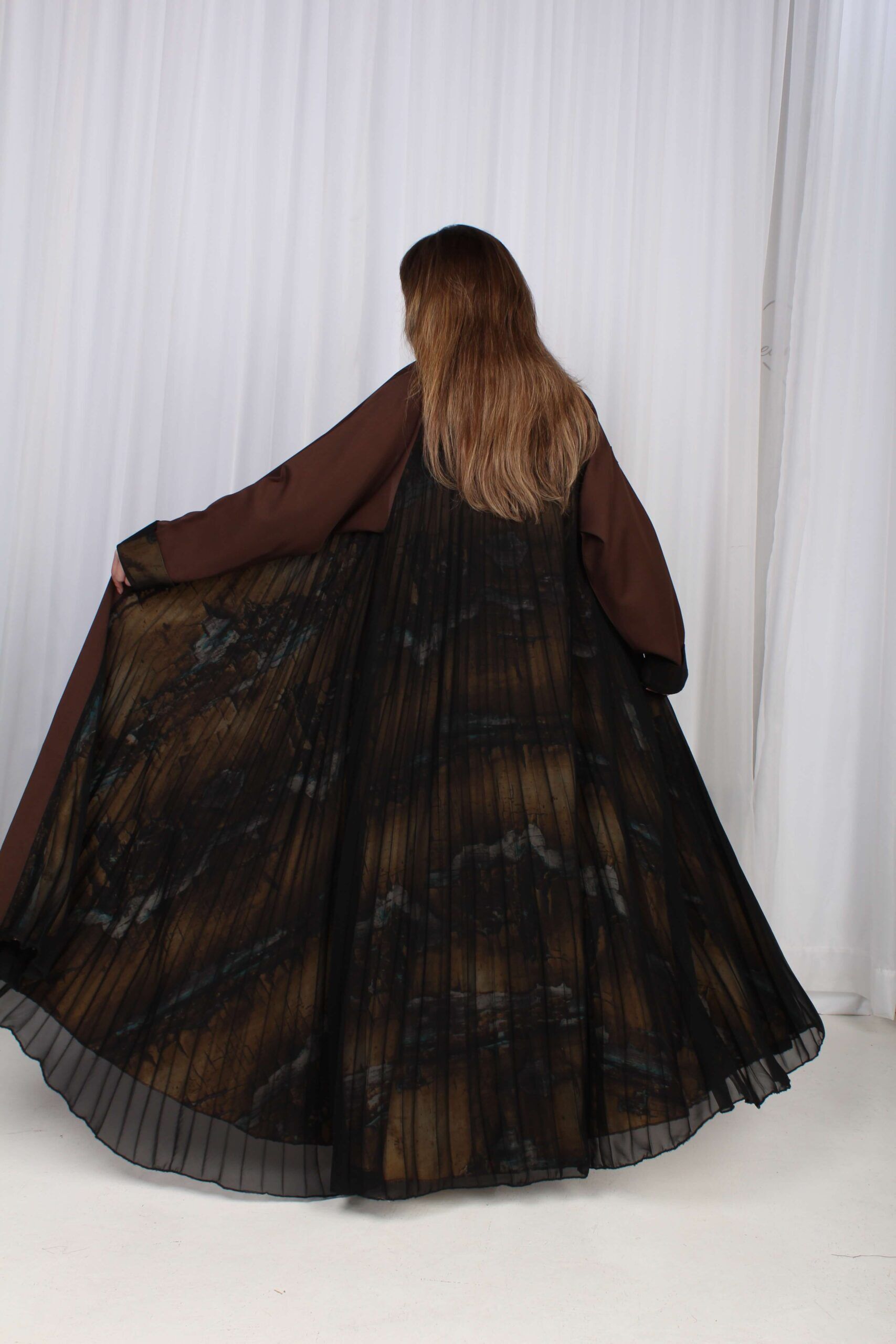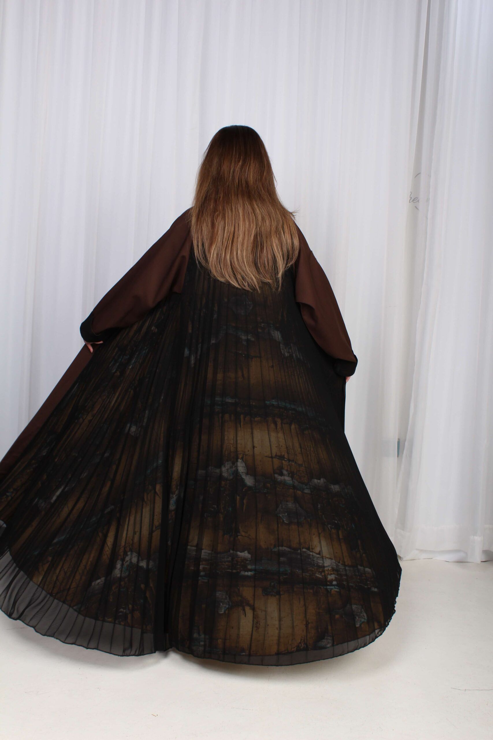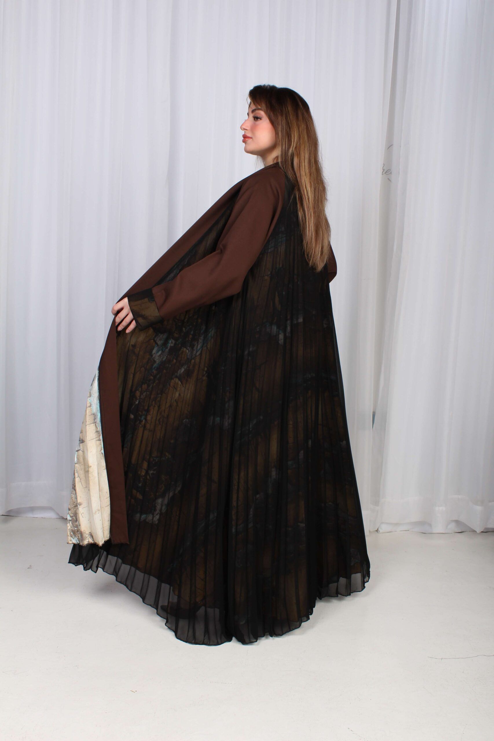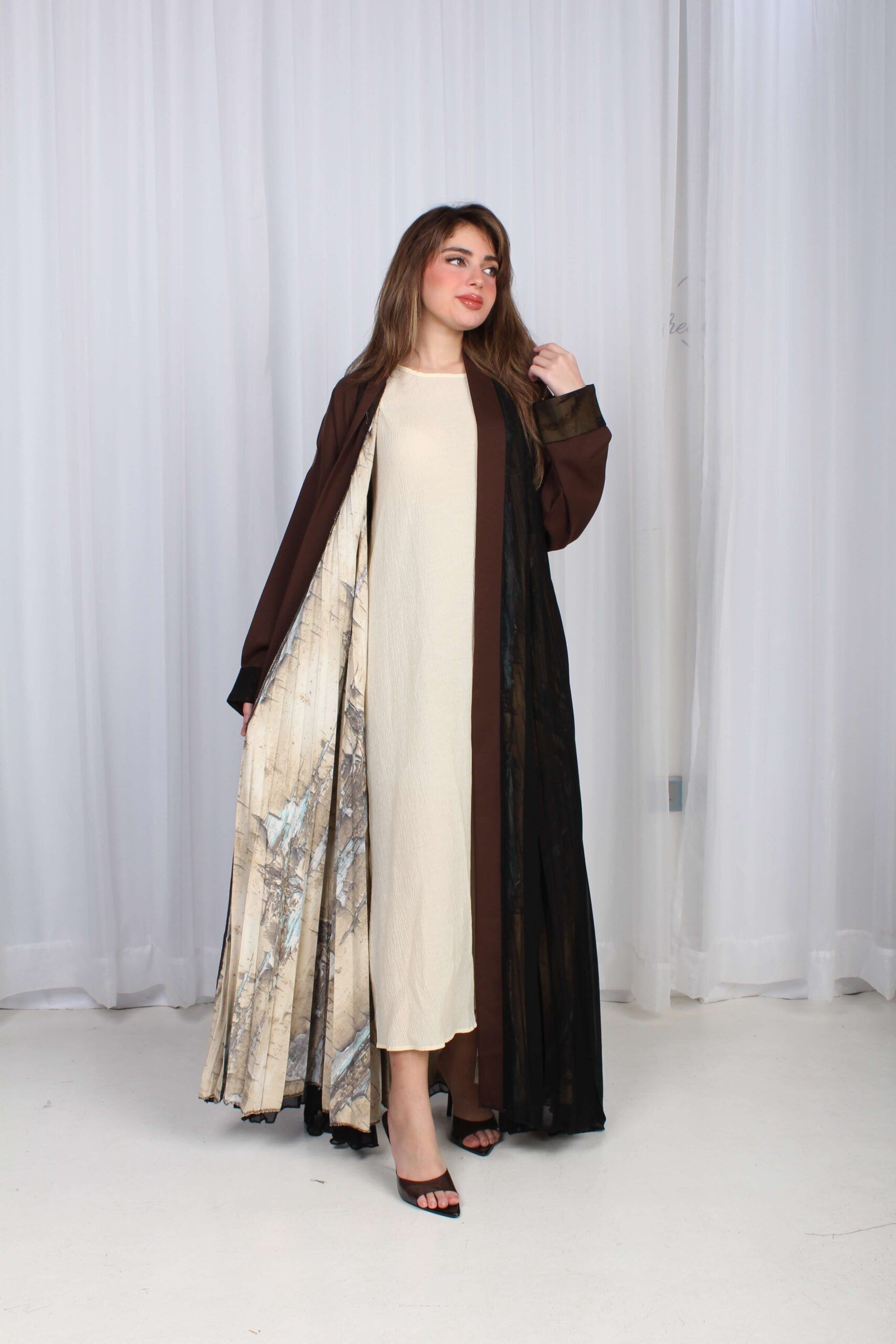 عباية بخامة شيفون مبطنة بخامة مريحة غير شفافه جاكار بني ناعم على عبايه كامل ، كما يمكنك لبسها وجهه الاخر ساده كامل صممت مفتوحة .اخترنا لها خامة شيفون من افضل الخامات العملية للبس والاستخدام اليومي