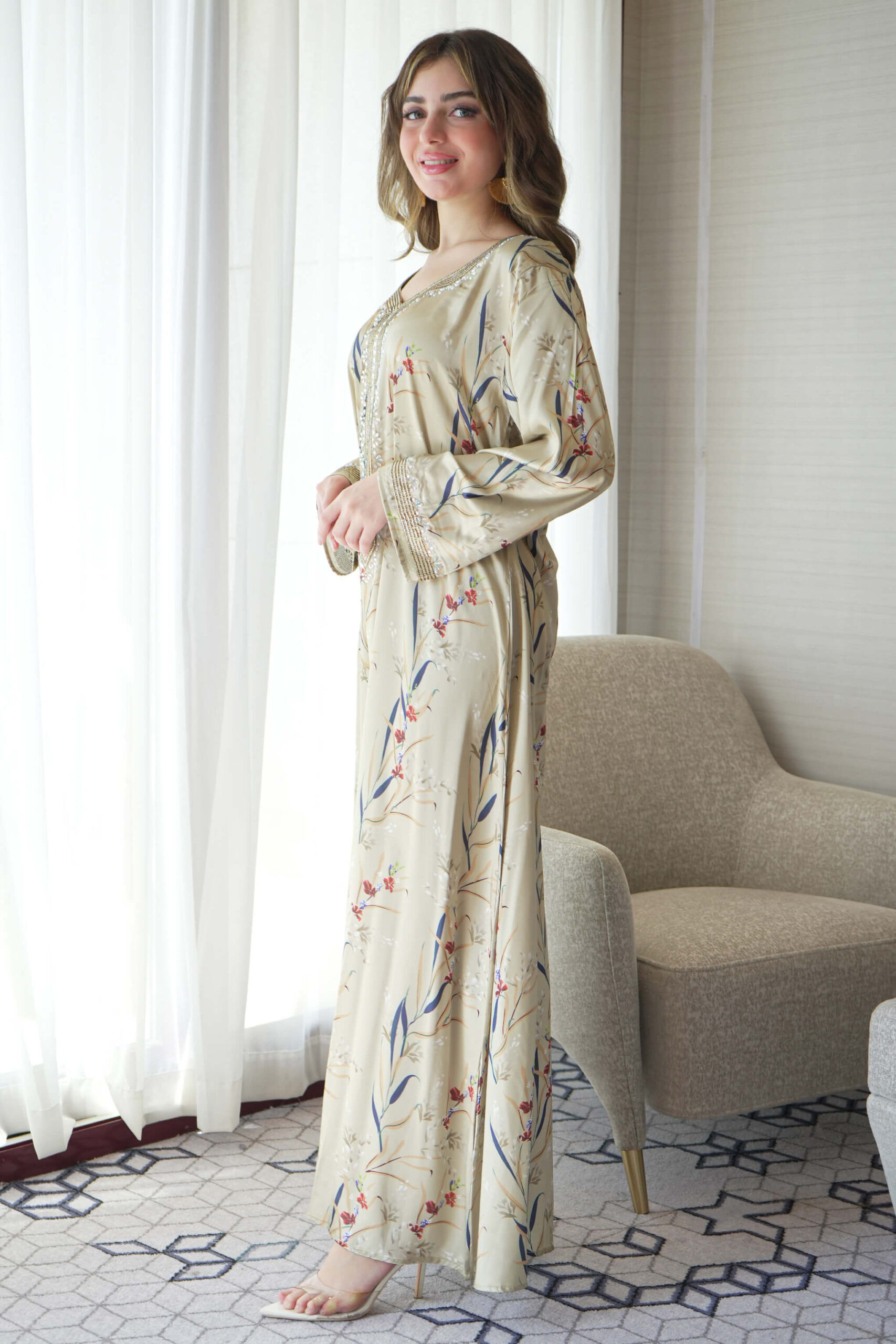 جلابيه تيفاني جميل بقماش حرير بكسرات من الأسفل