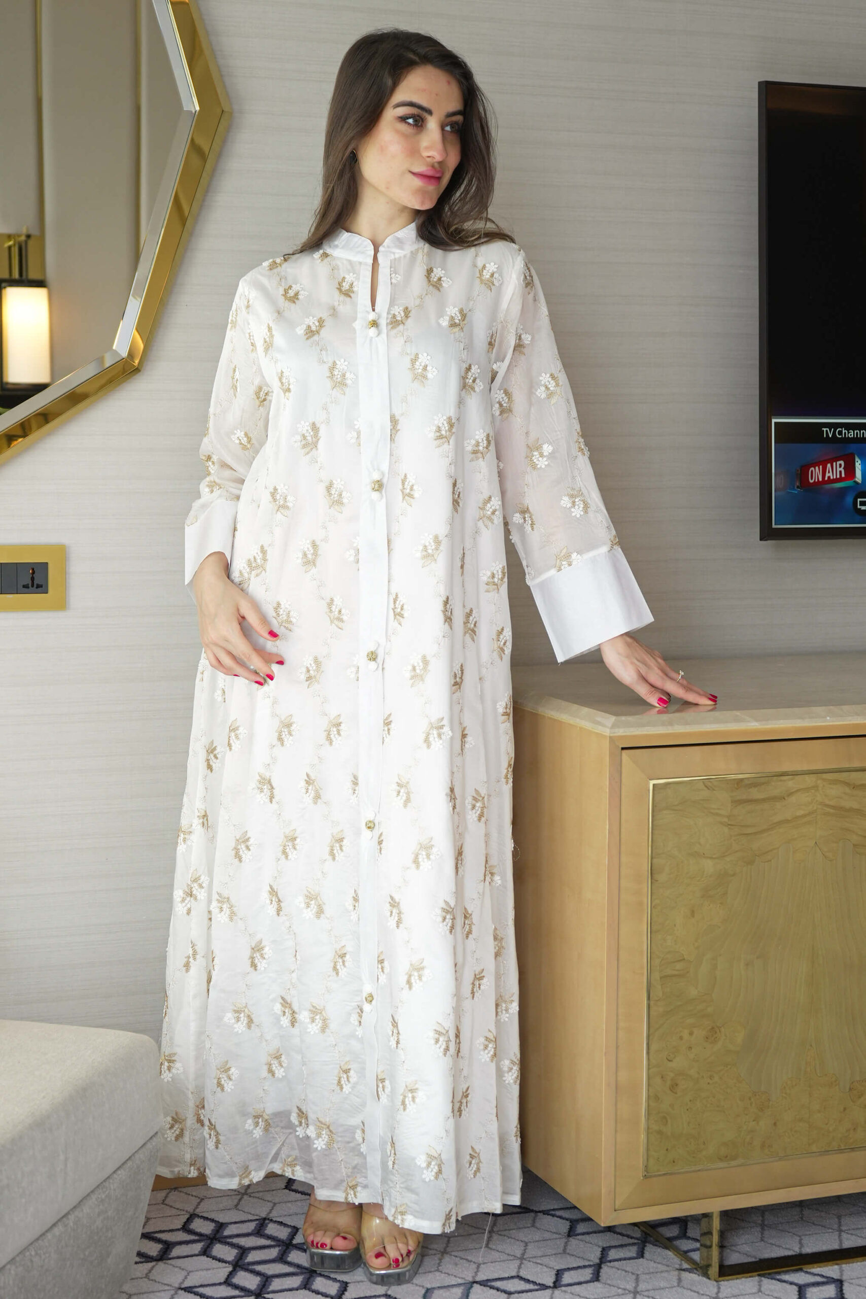 جلابية بدقات ورود ذهبي وابيض فخمة وانيقه لإطلالة تميز حضورك في المناسبات والجمعات العائلية.