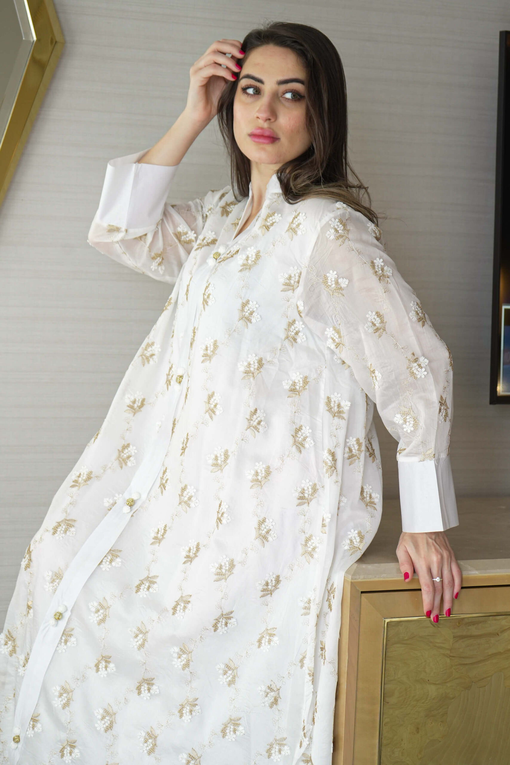 - الموديل:جلابية ابيض بدقات ورود ذهبي وابيض فخمة وانيقه لإطلالة تميز حضورك في المناسبات والجمعات العائلية.نسجت من خامة لنن ناعم