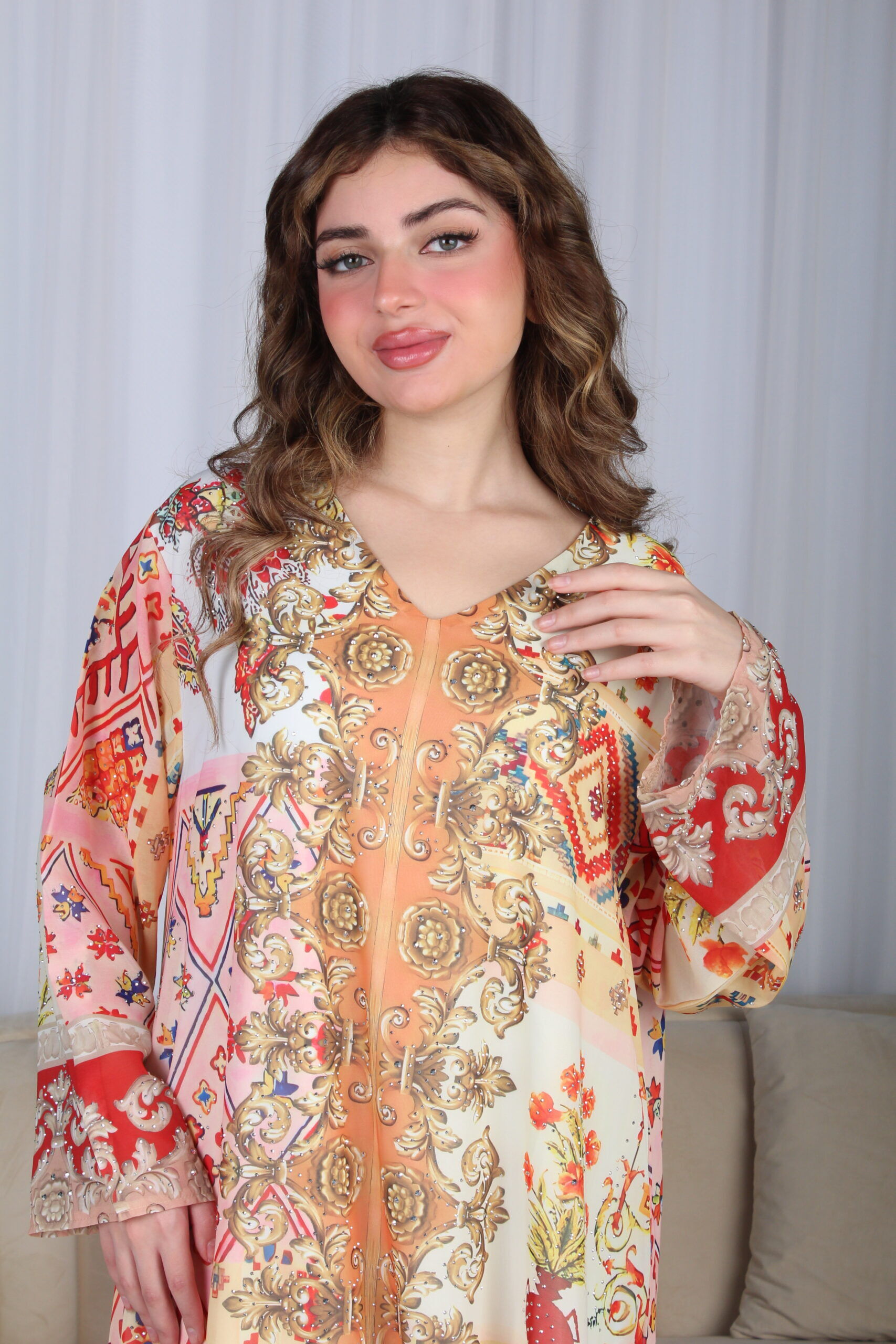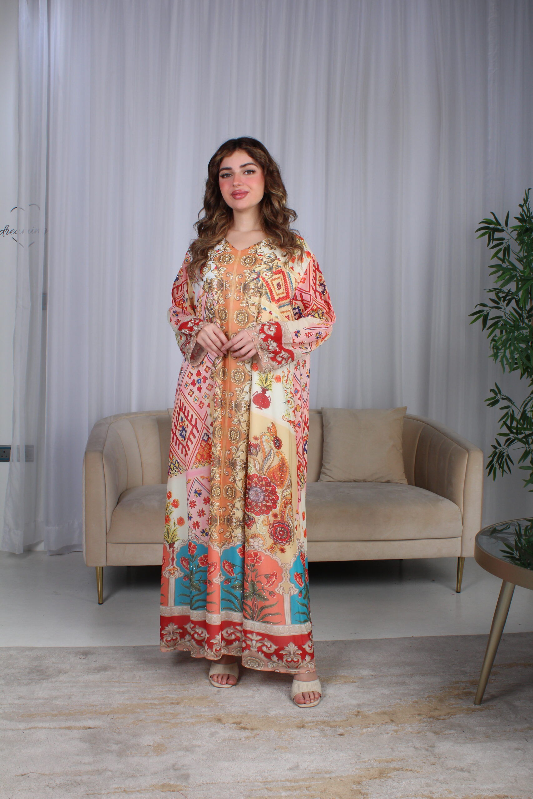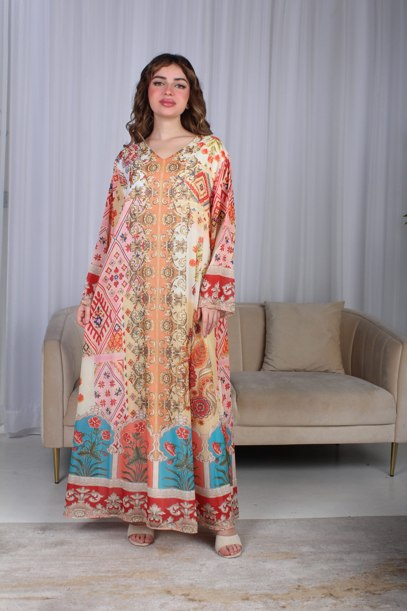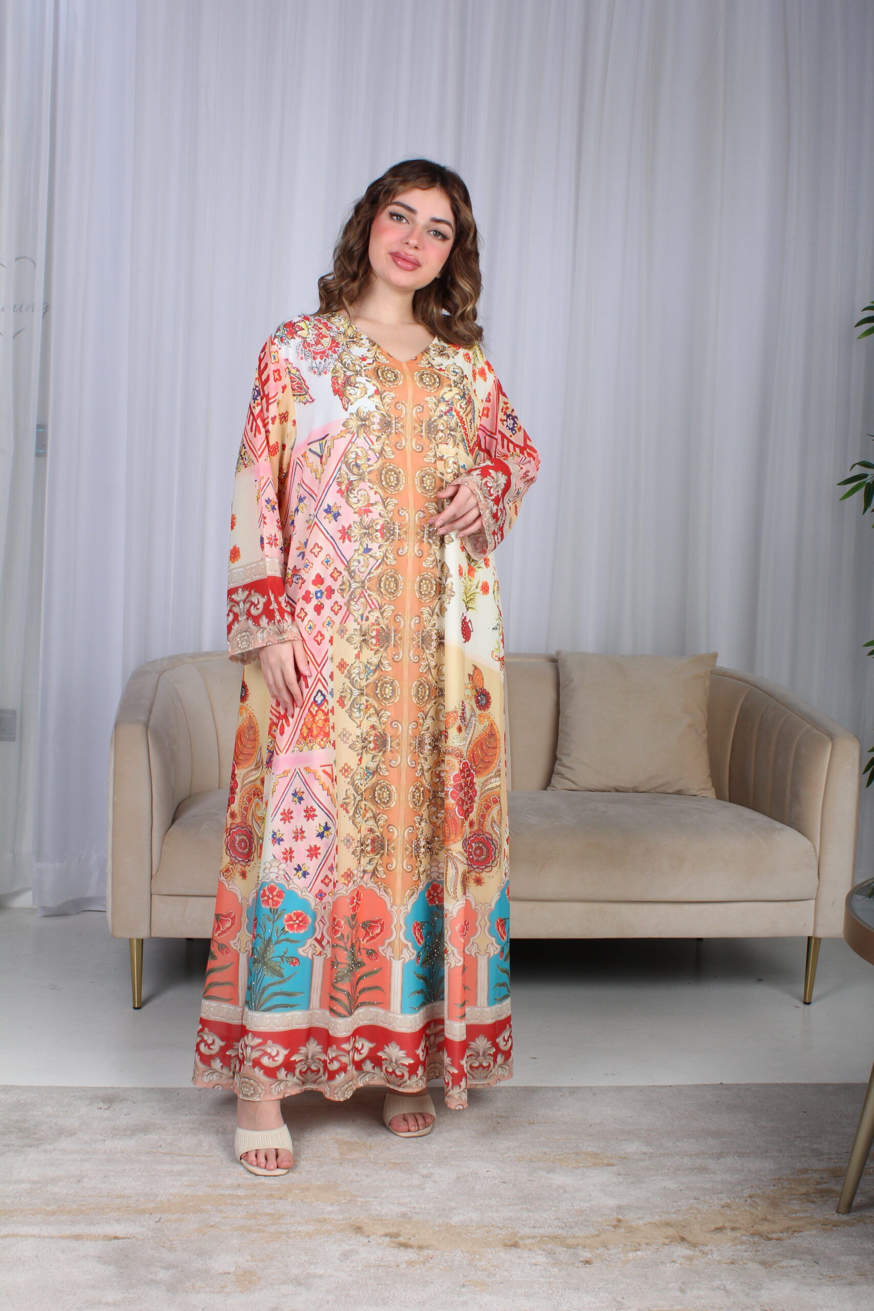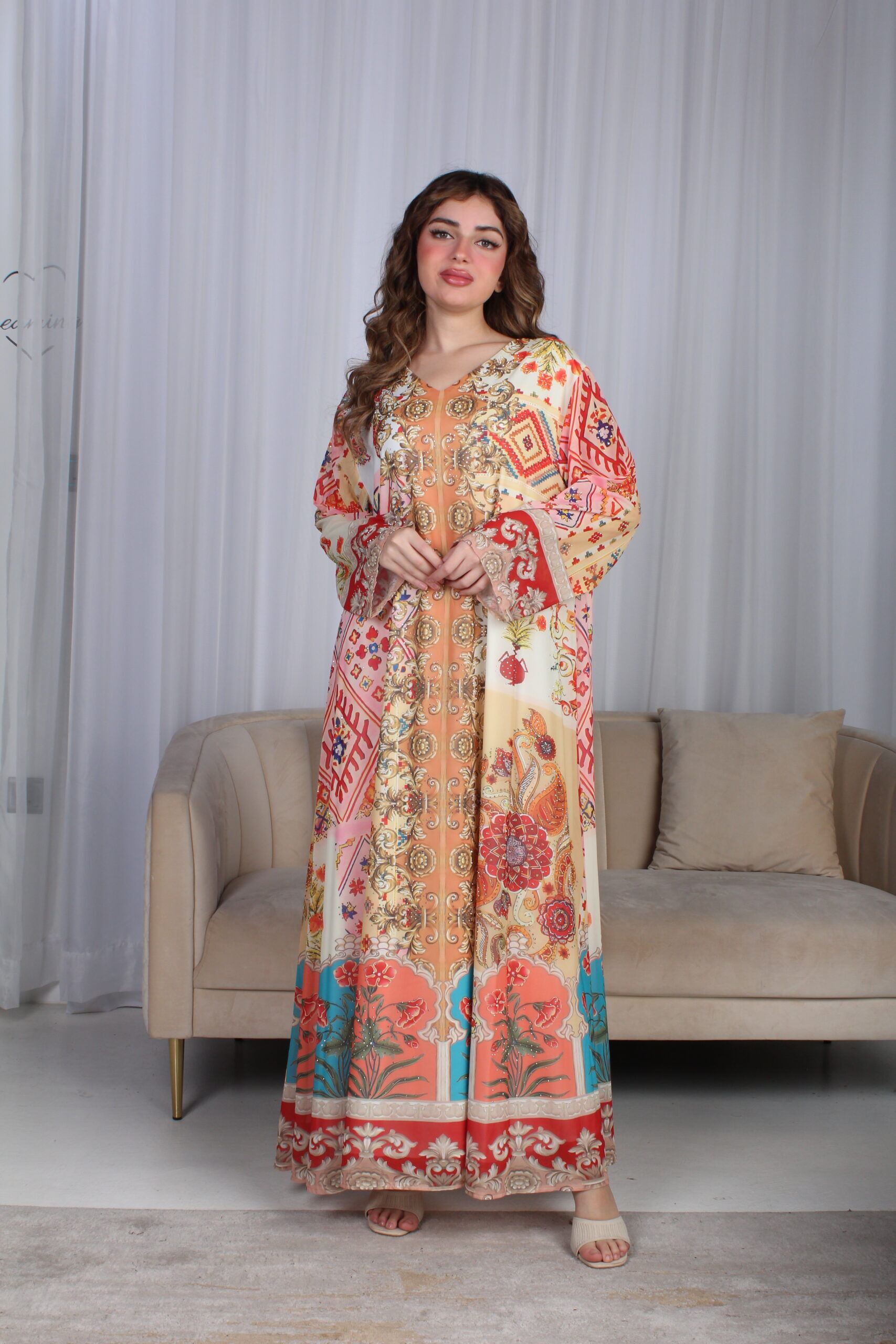 - الموديل: جلابية خربزي حرير بالوان مشجره و فصوص مخفية فخمة