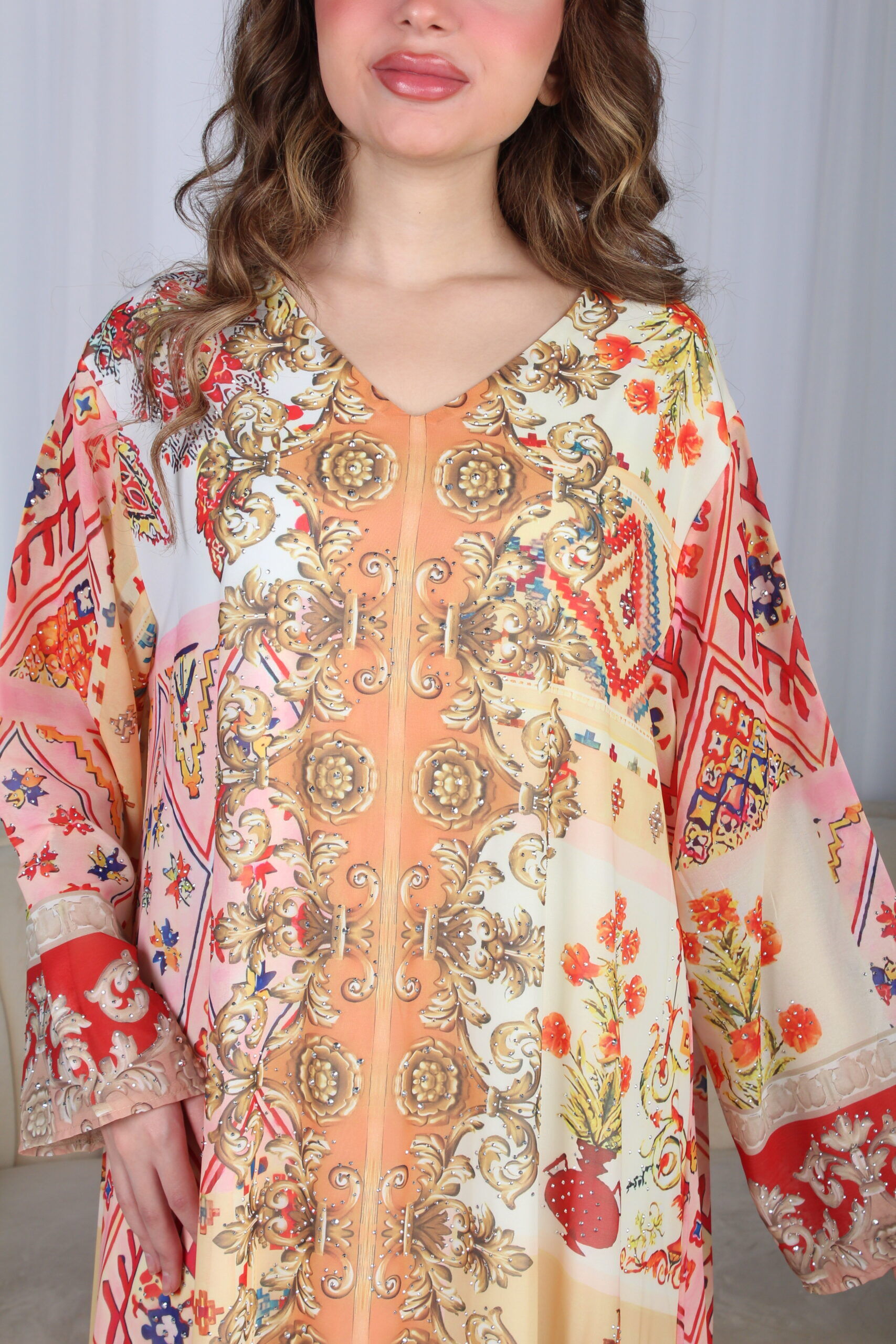 لابية خربزي حرير بالوان مشجره و فصوص كامل فخمة تميز وجودك بين الحضور، خليها بخزانتك للمناسبات والجمعات العائلية.