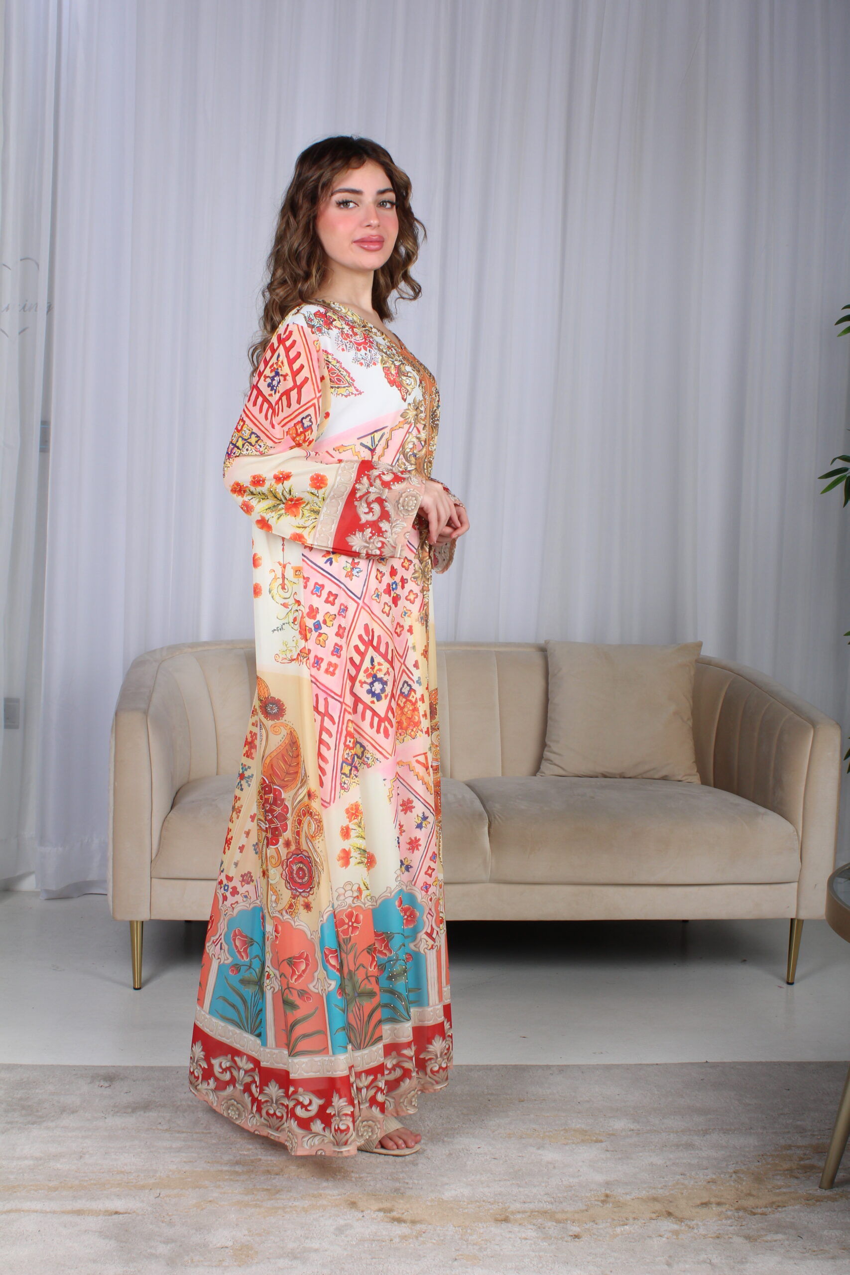جلابية احمر حرير بالوان مشجره و فصوص