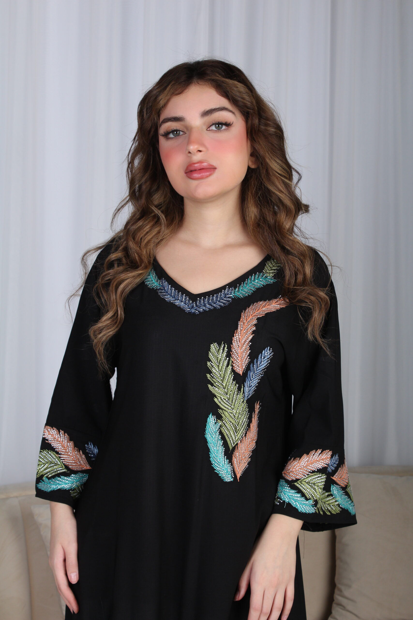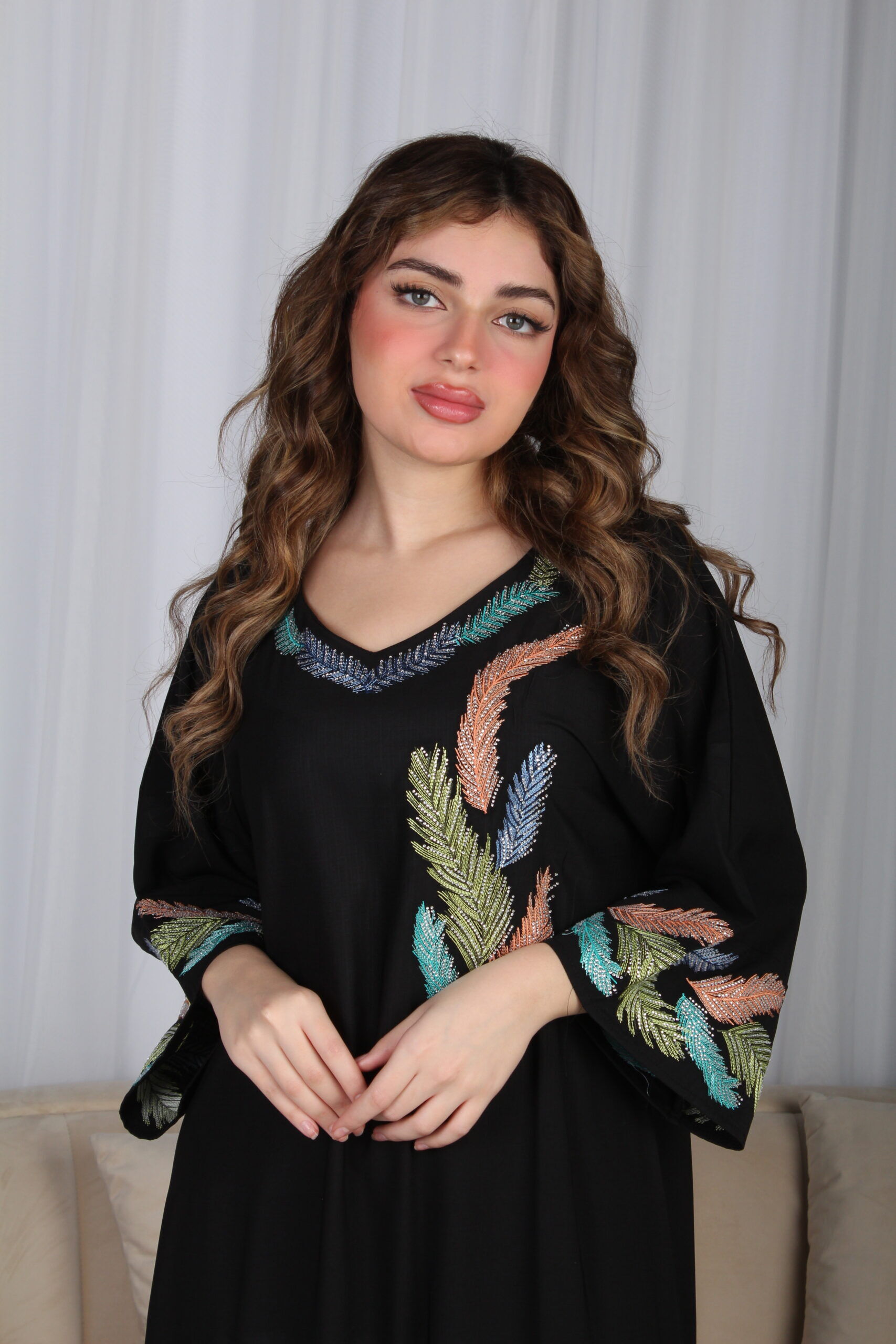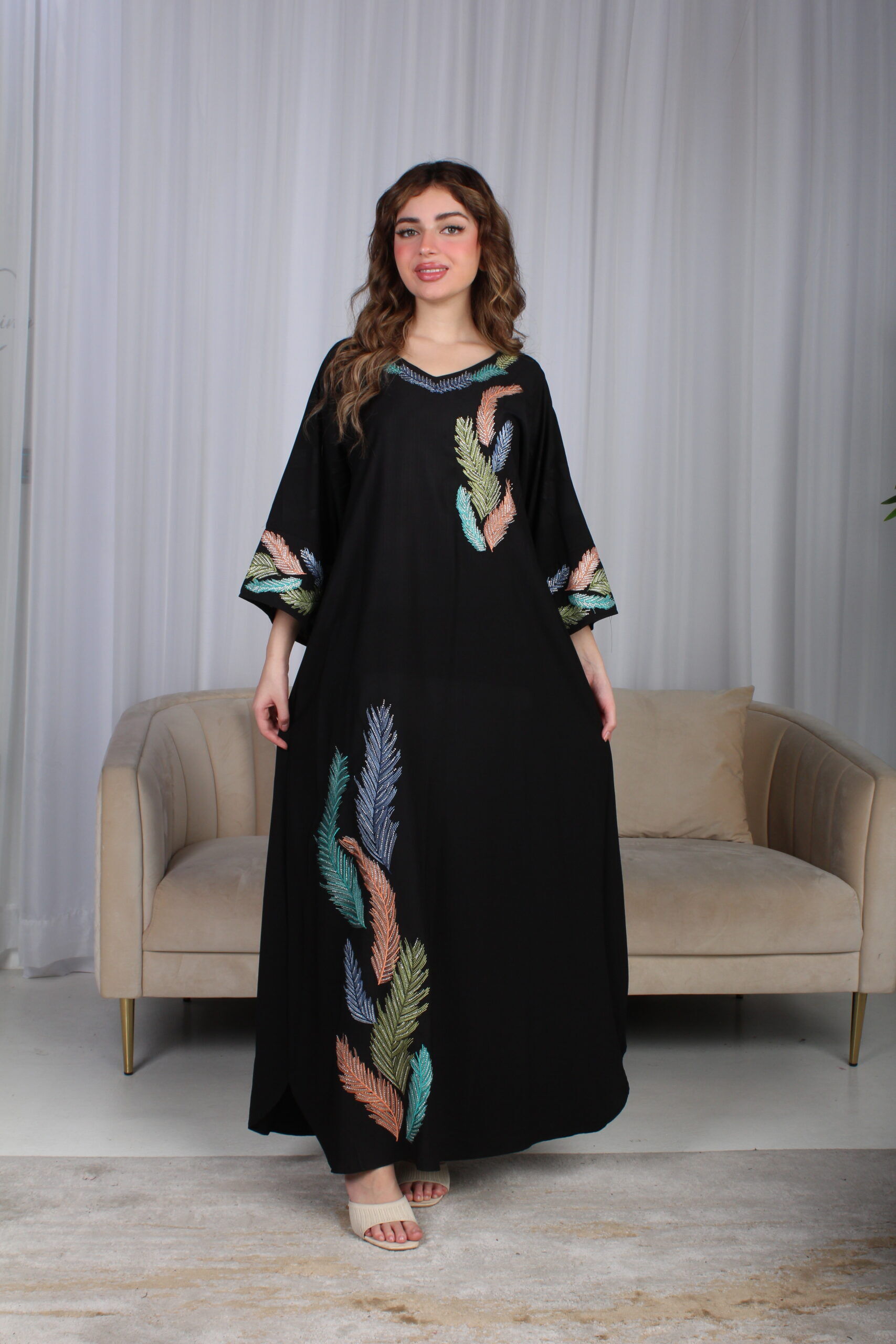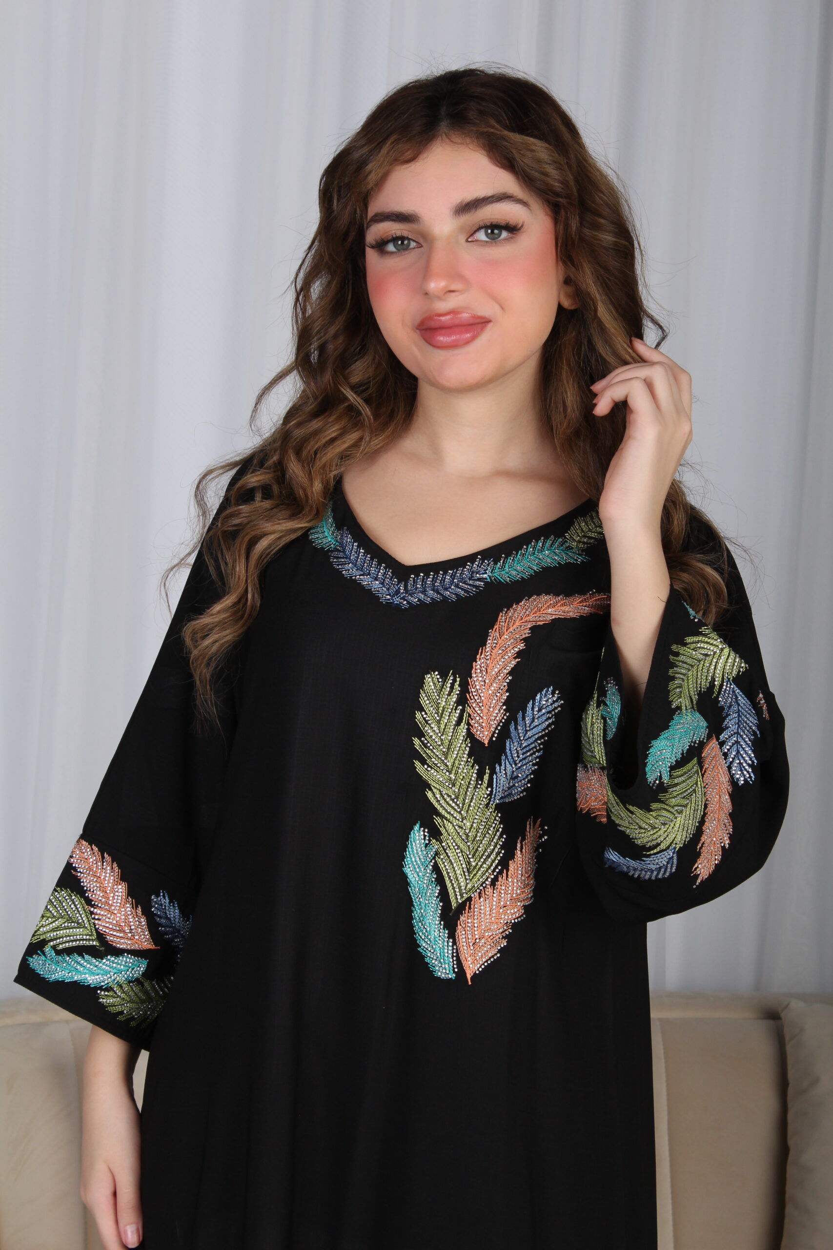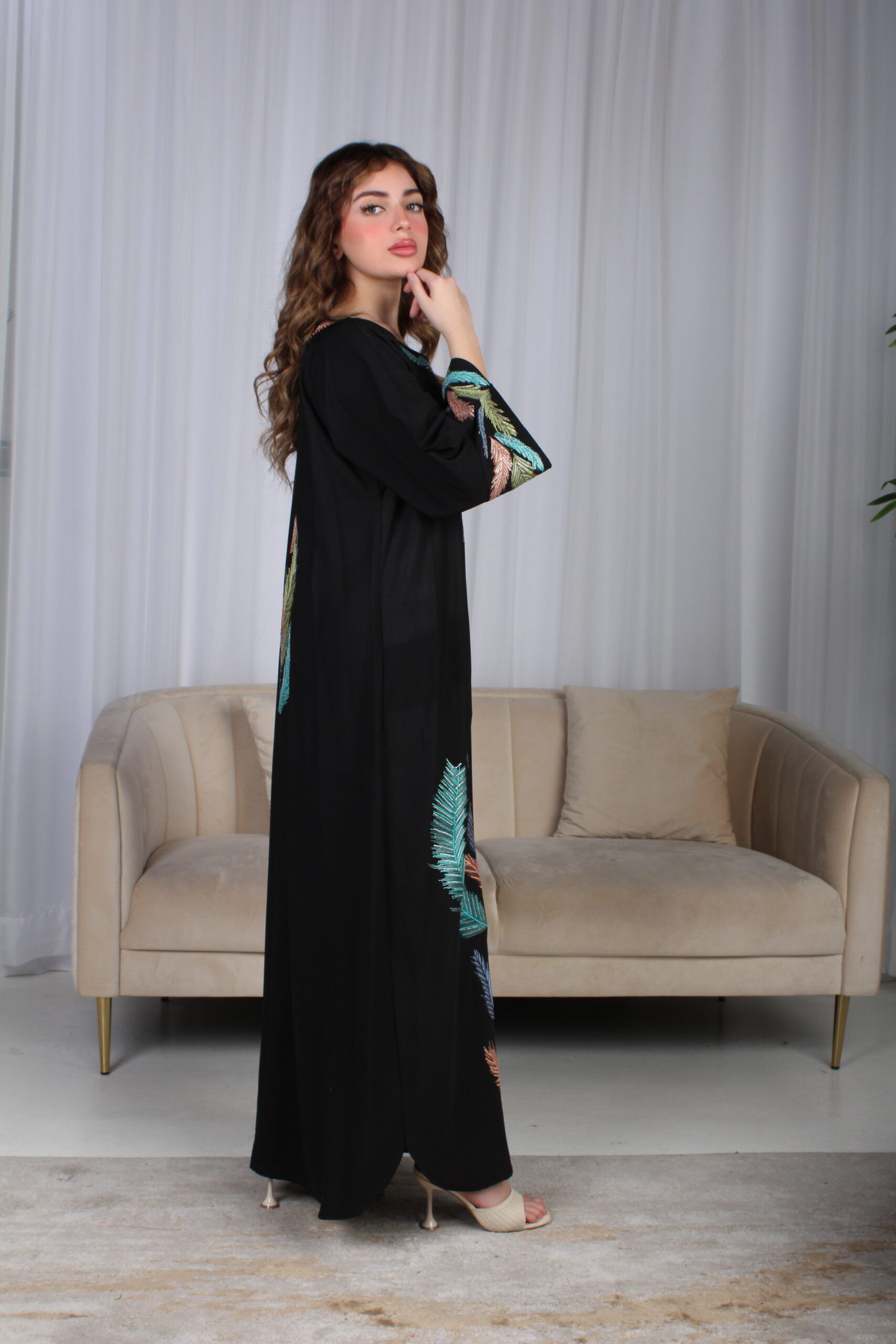 - الموديل: جلابية اسود مرسومه باوراق شجرة بالوان و مفصصة فخمة وأنيقة