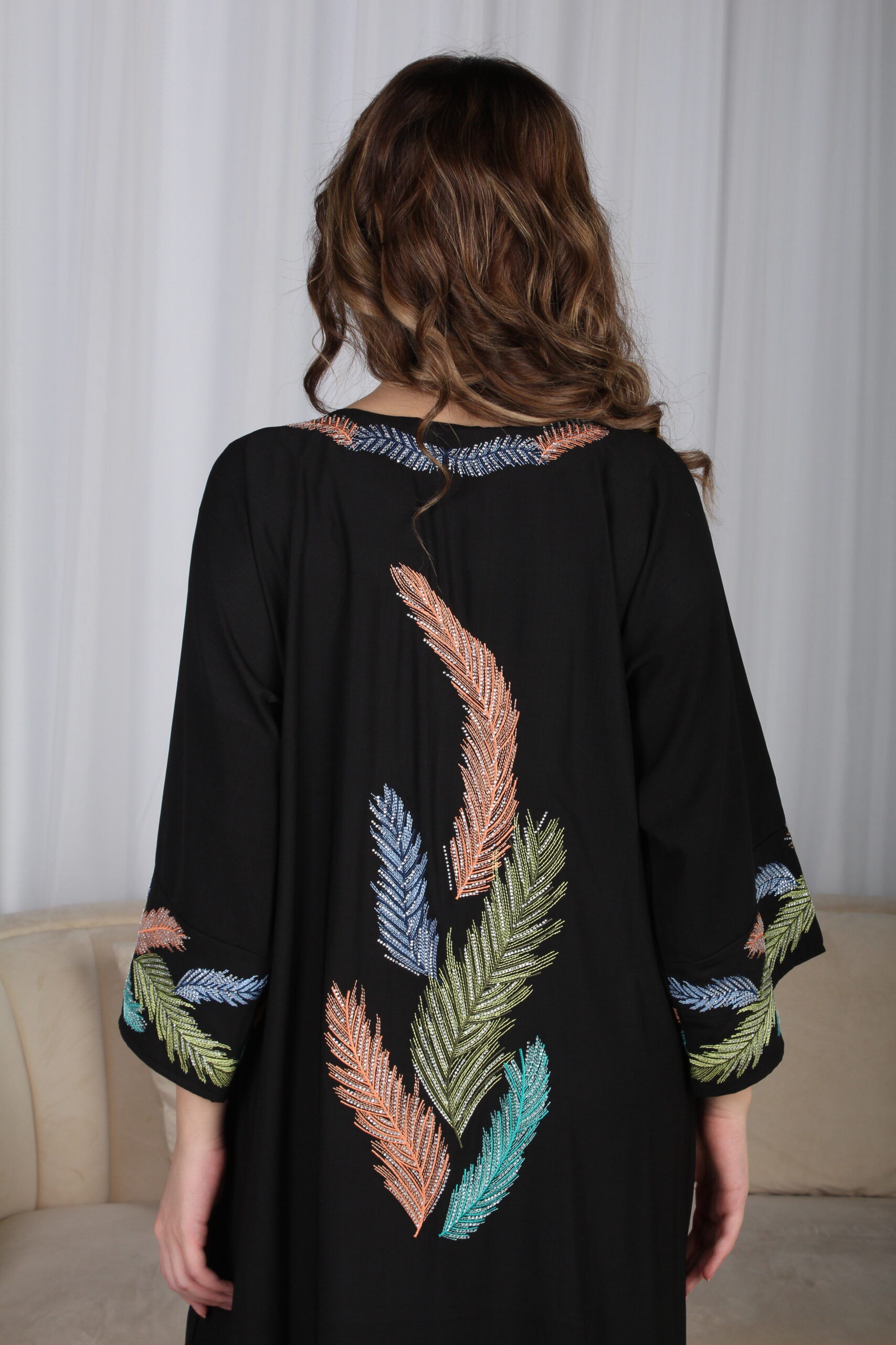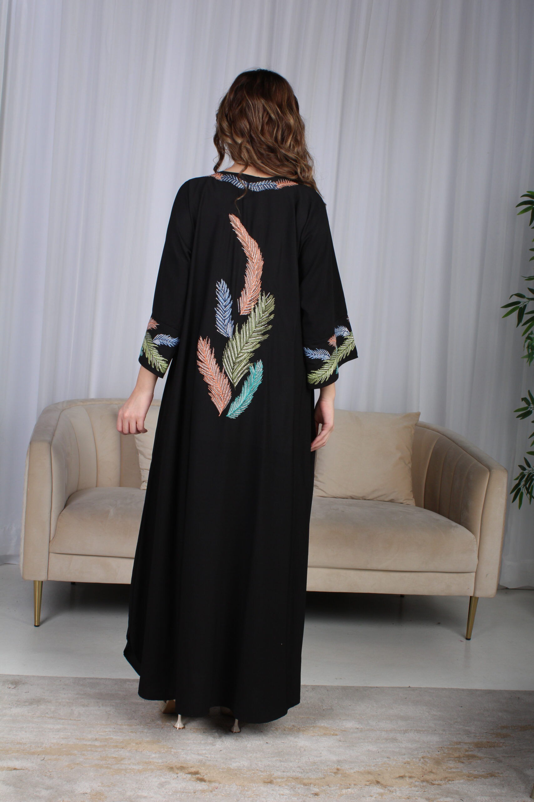 جلابية اسود مرسومه باوراق شجرة بالوان و مفصصة