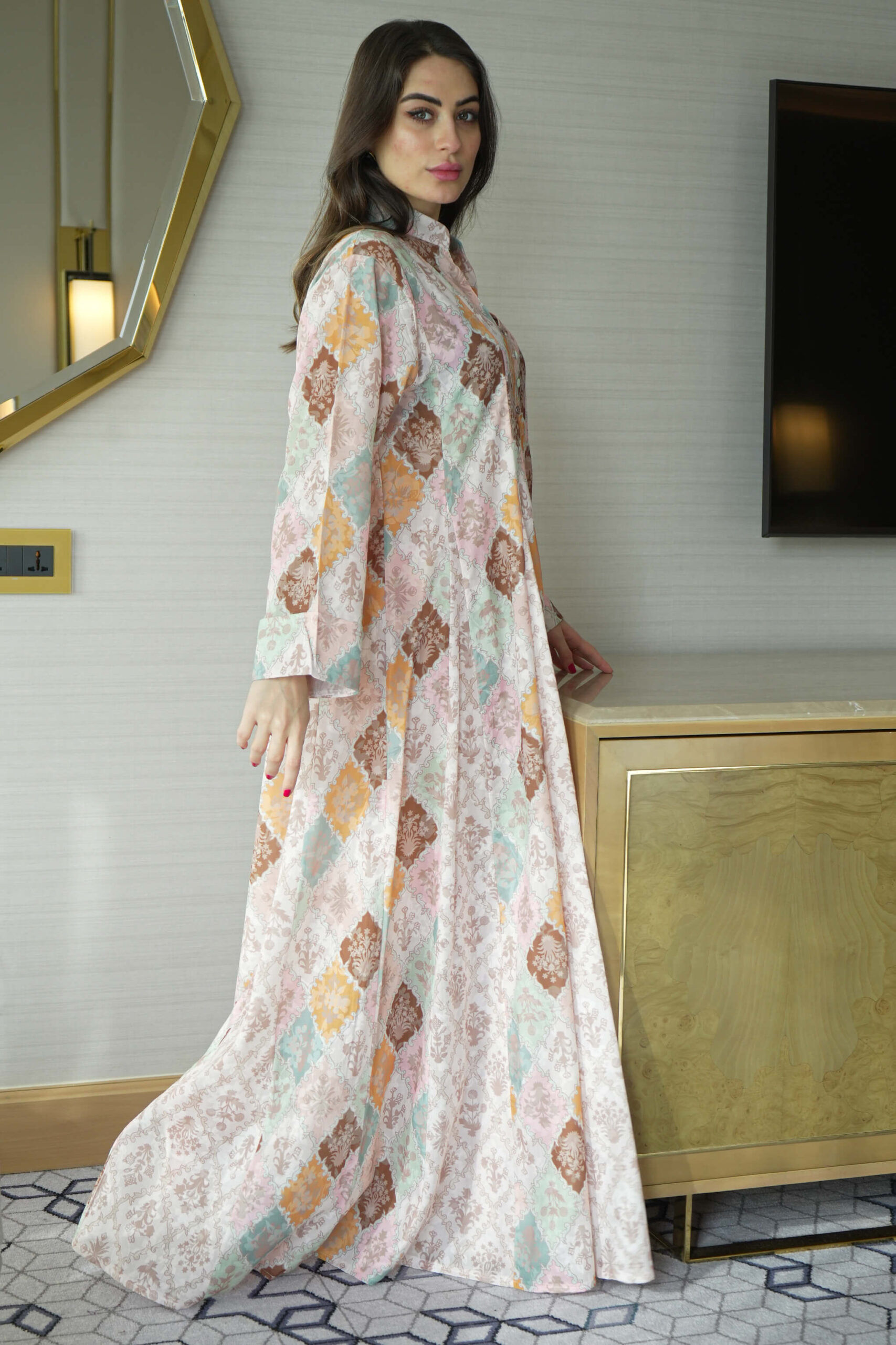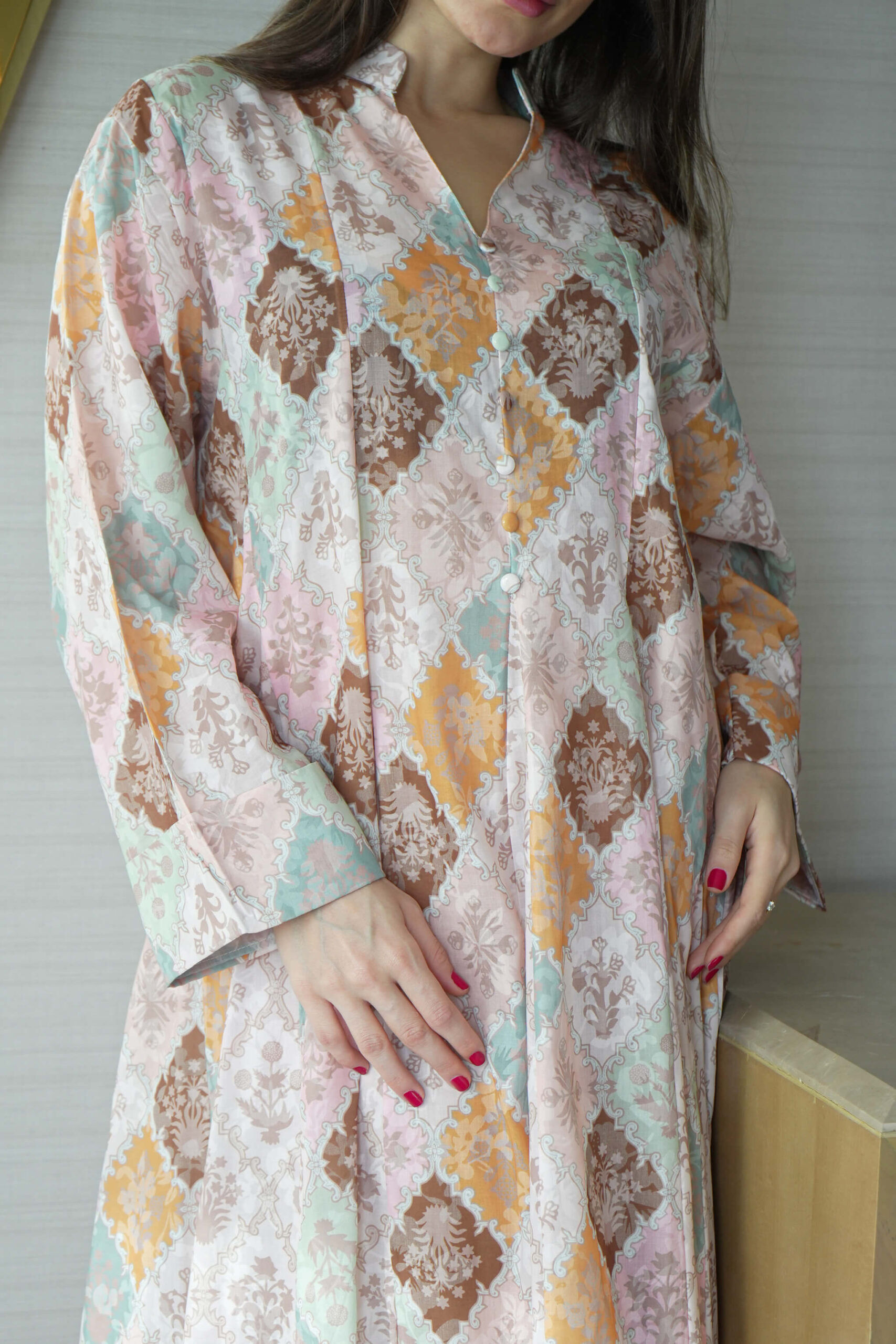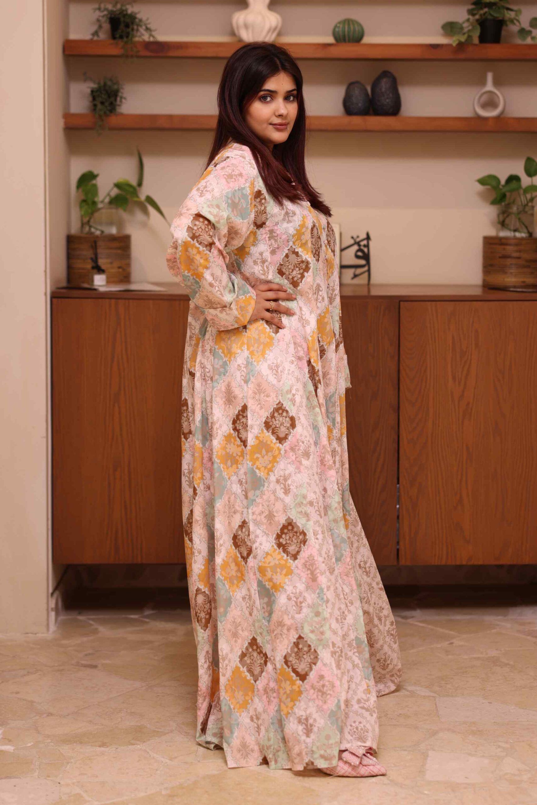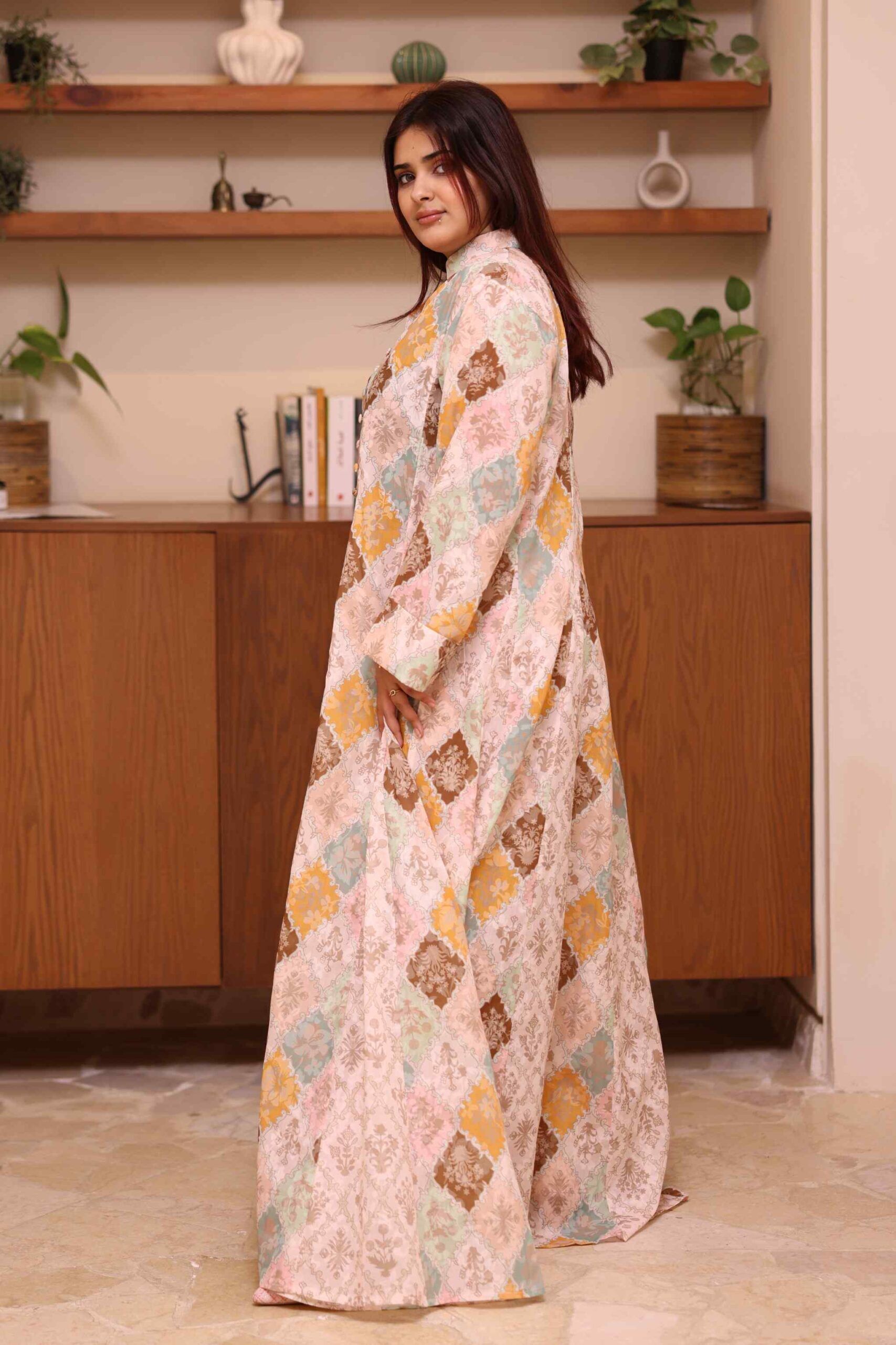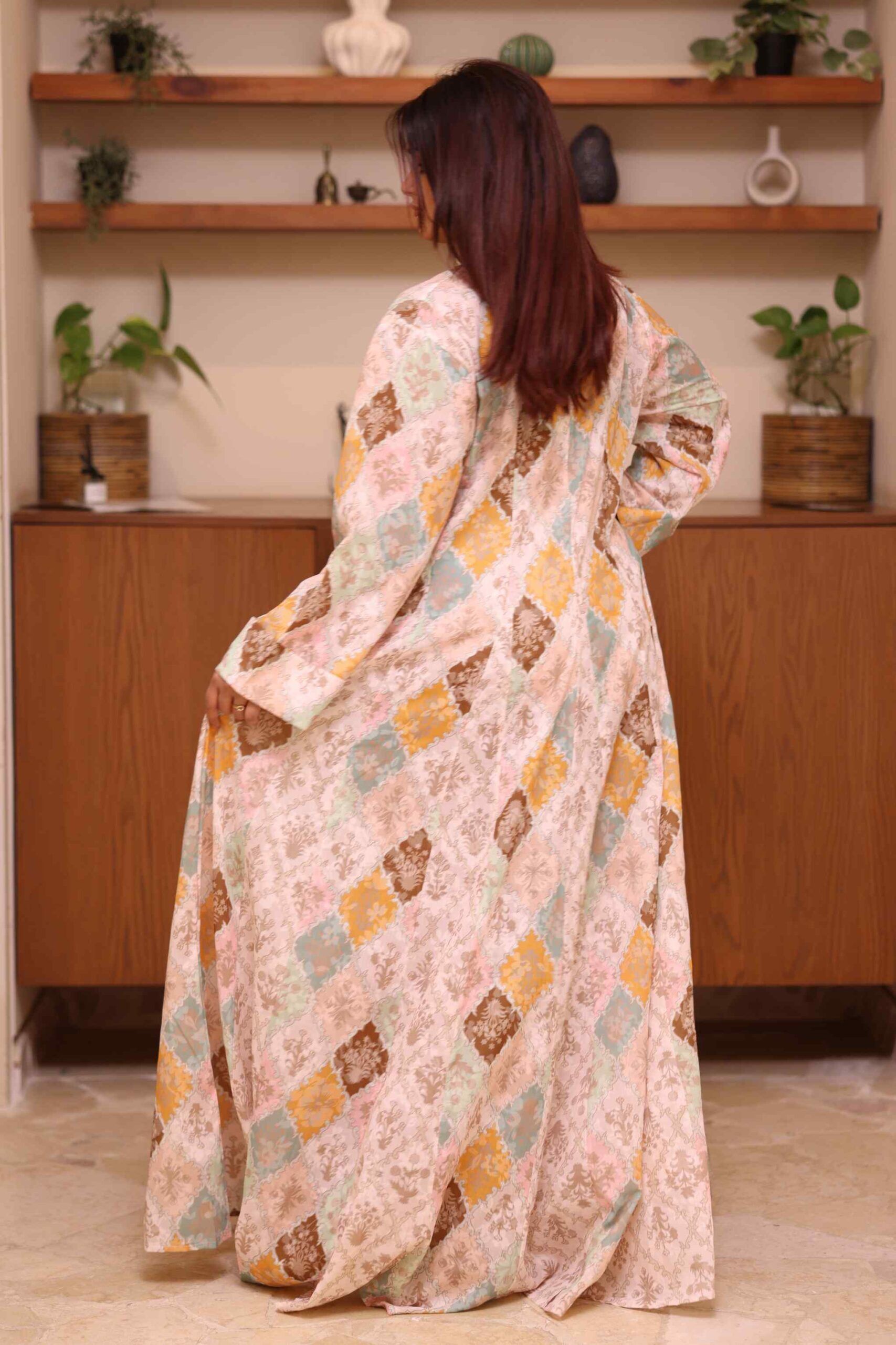 الجلابية أنيقة باللون بني ، مصممة بقصة ربع كلوش عملية و مزينه بزراير على حلق ، اخترنا لها خامة من افضل الخامات قطن والعملية لتمنحك الراحه والأناقة في وقت واحد.