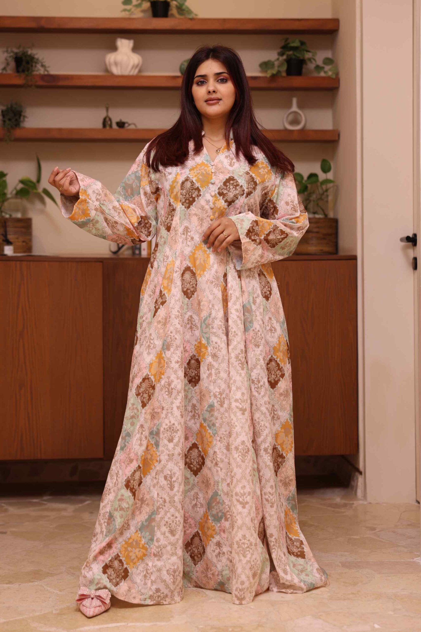 جلابية خربزي مزينه بدقات زرار من امام