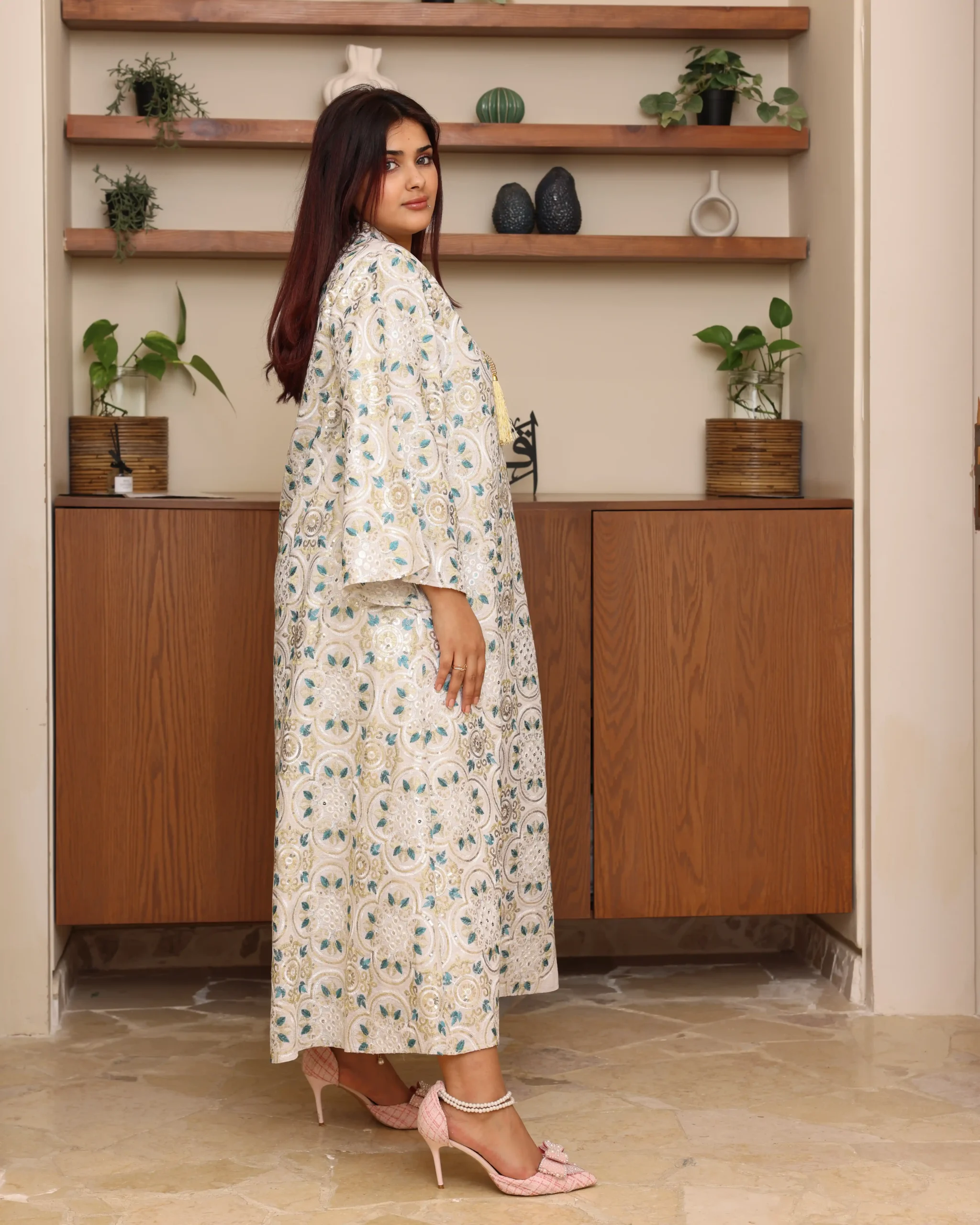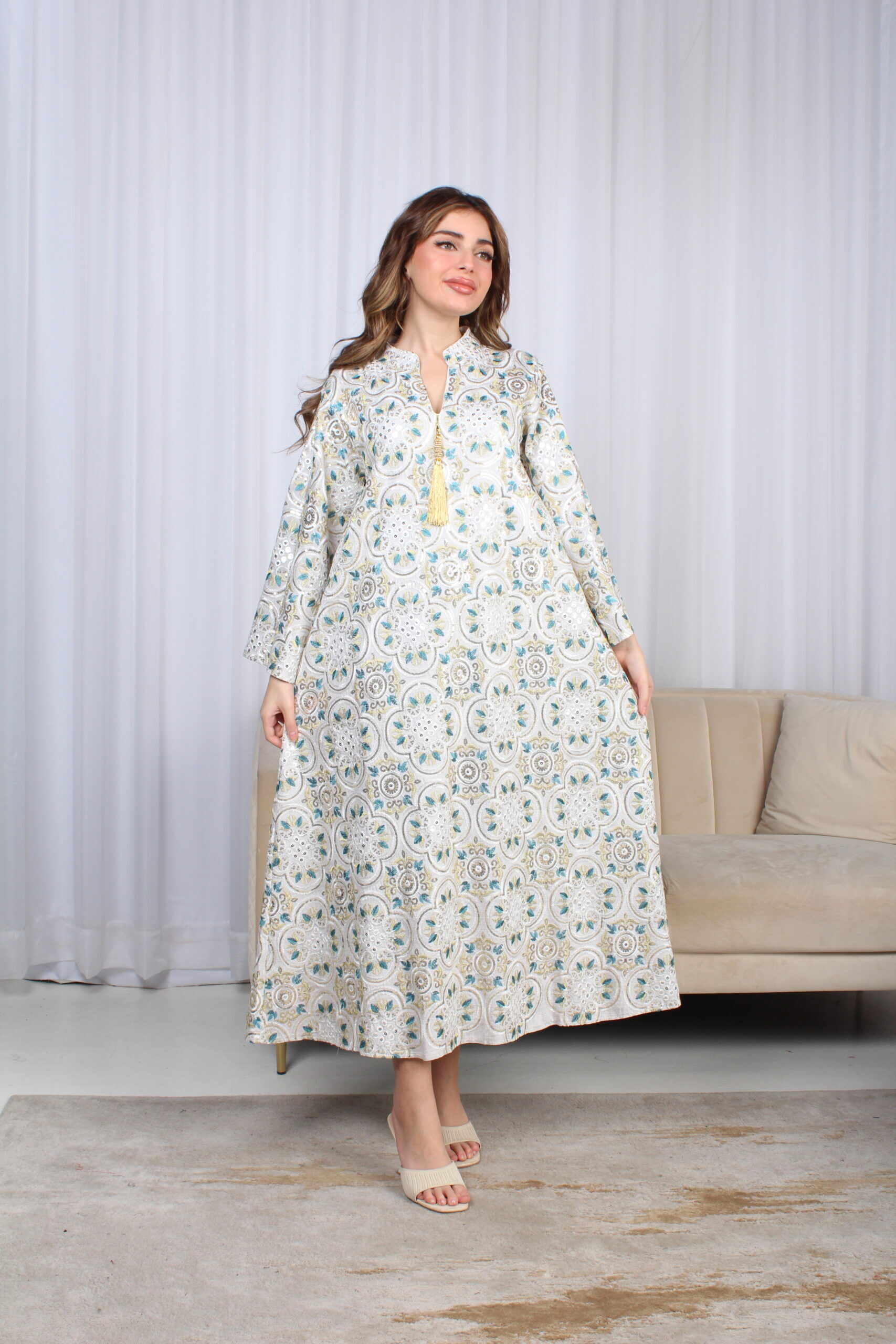 جلابية تيفاني لنن قطعتين مشجره بشك و ترتر من اجناب