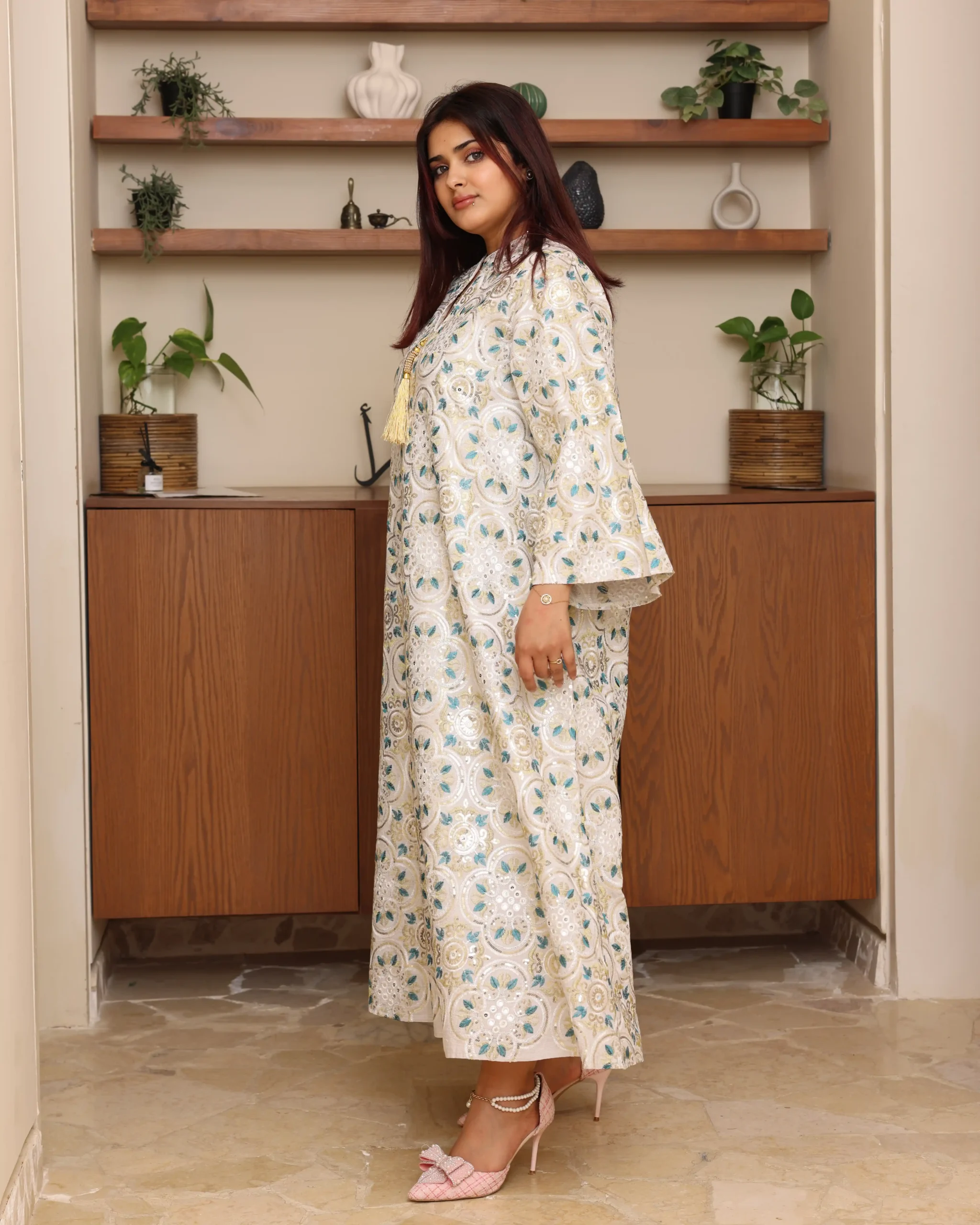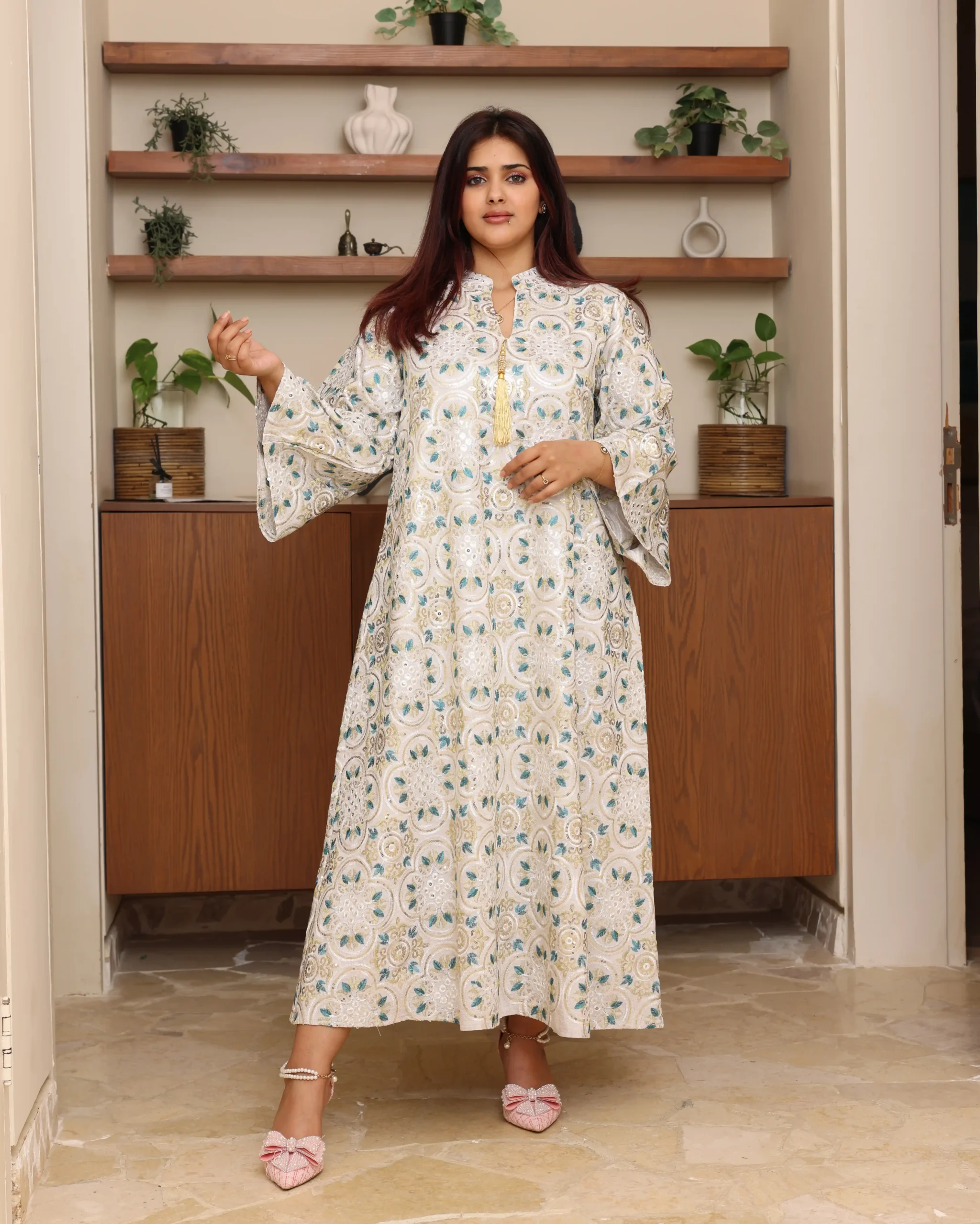 جلابية بياقة تيفاني بترتر وتطريز كامل بورود