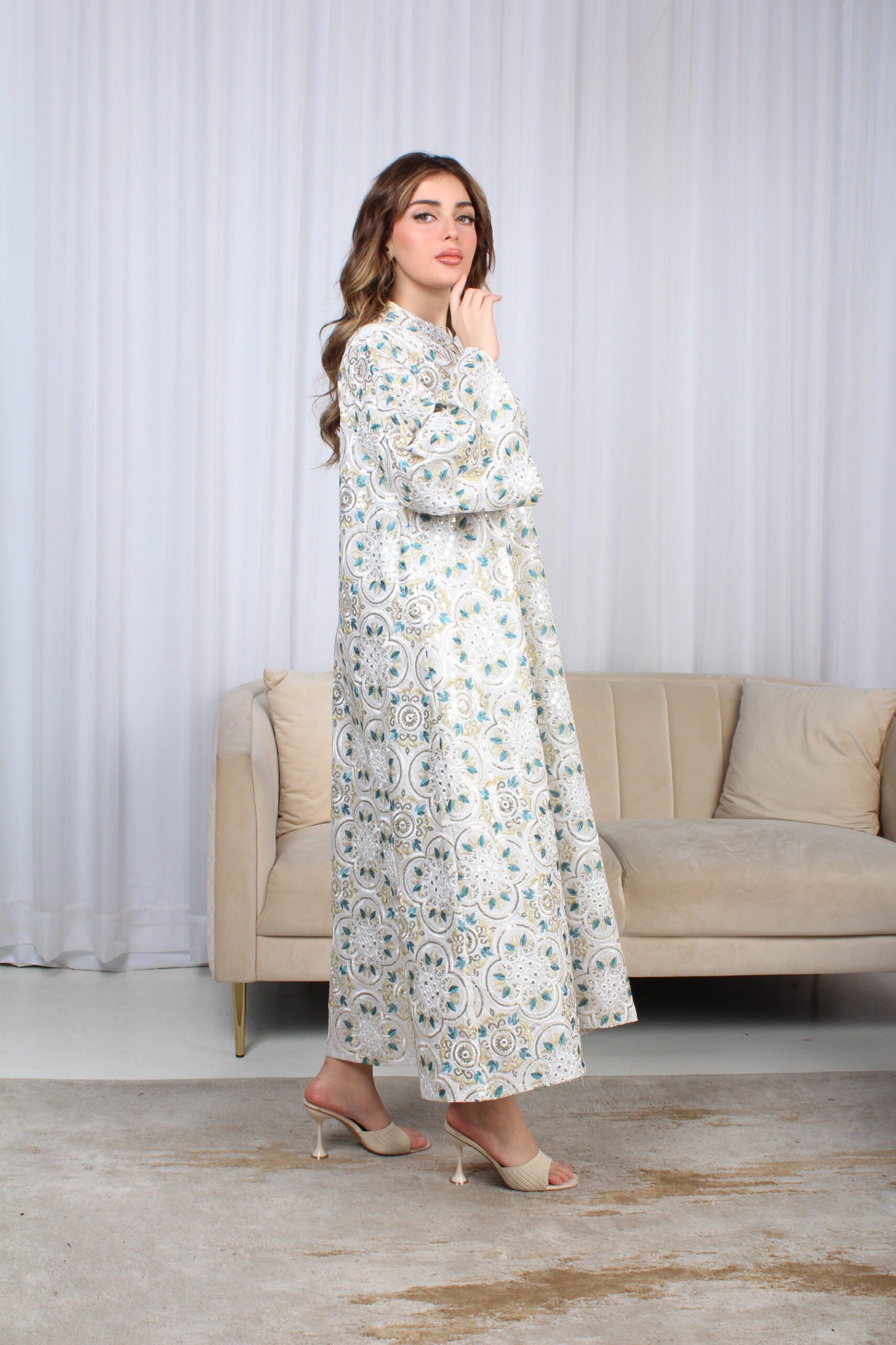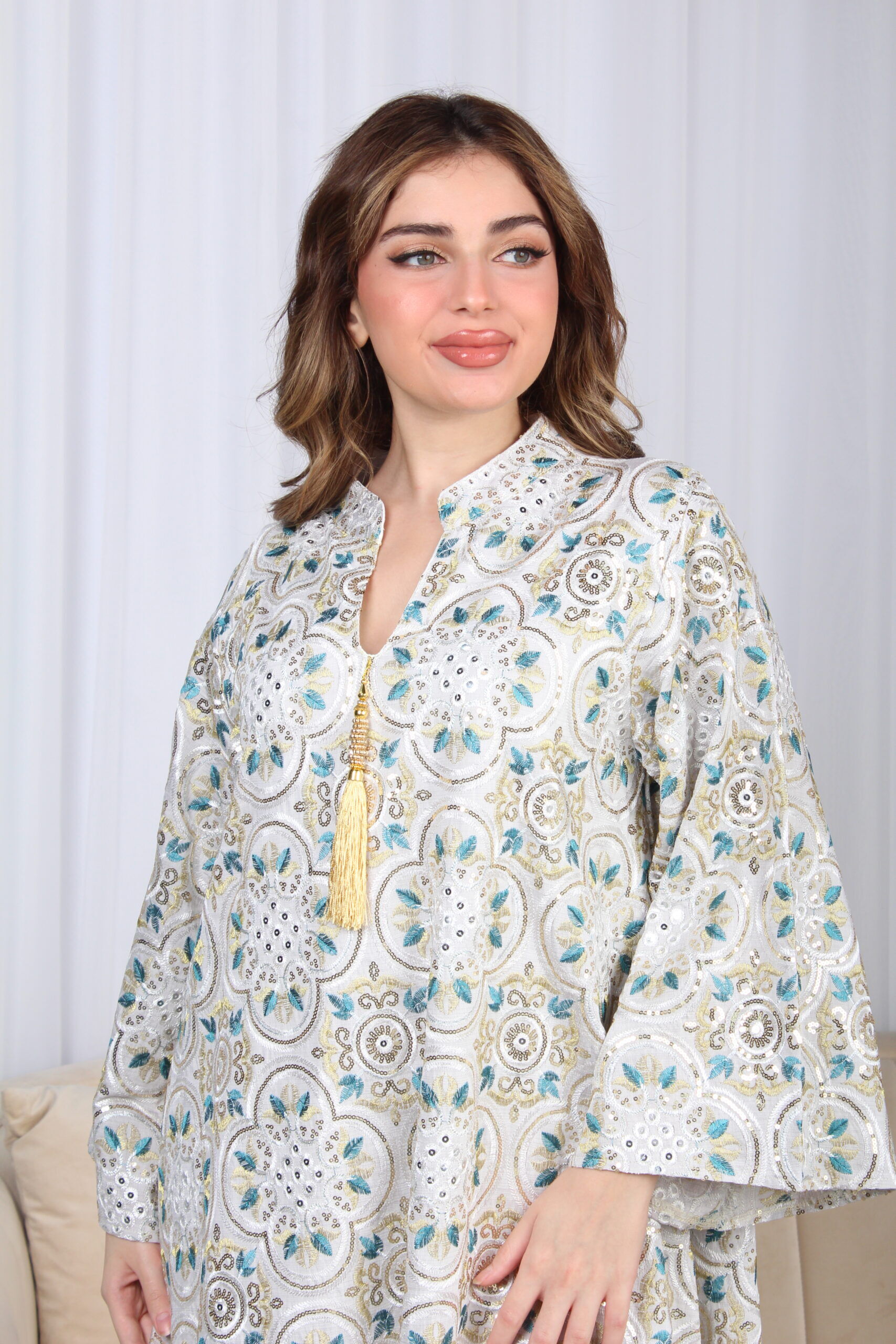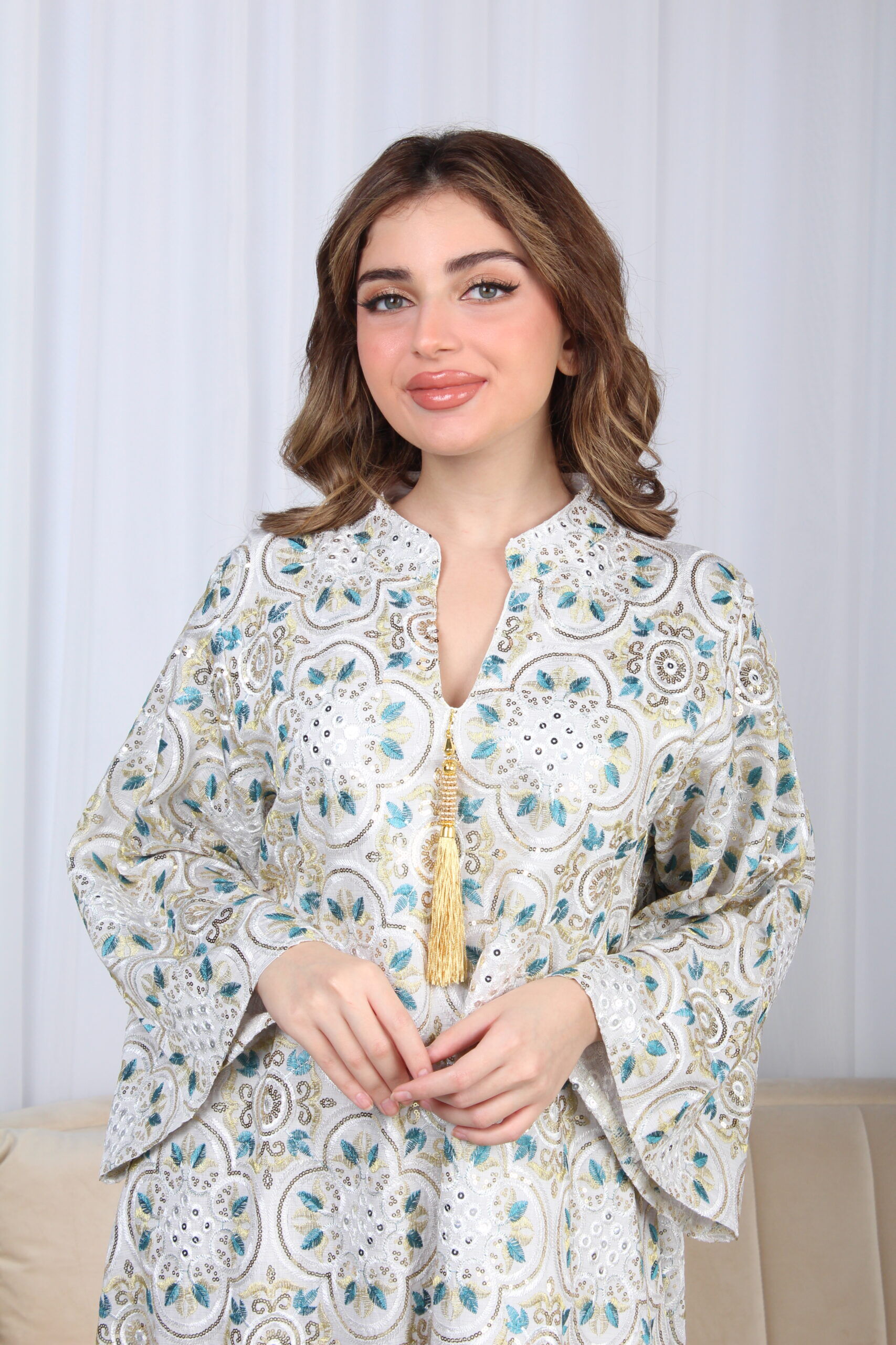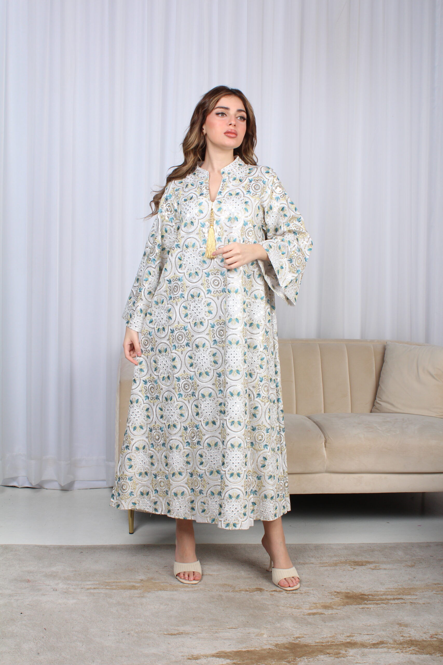 جلابية بياقة تركواز بترتر وتطريز كامل بورود