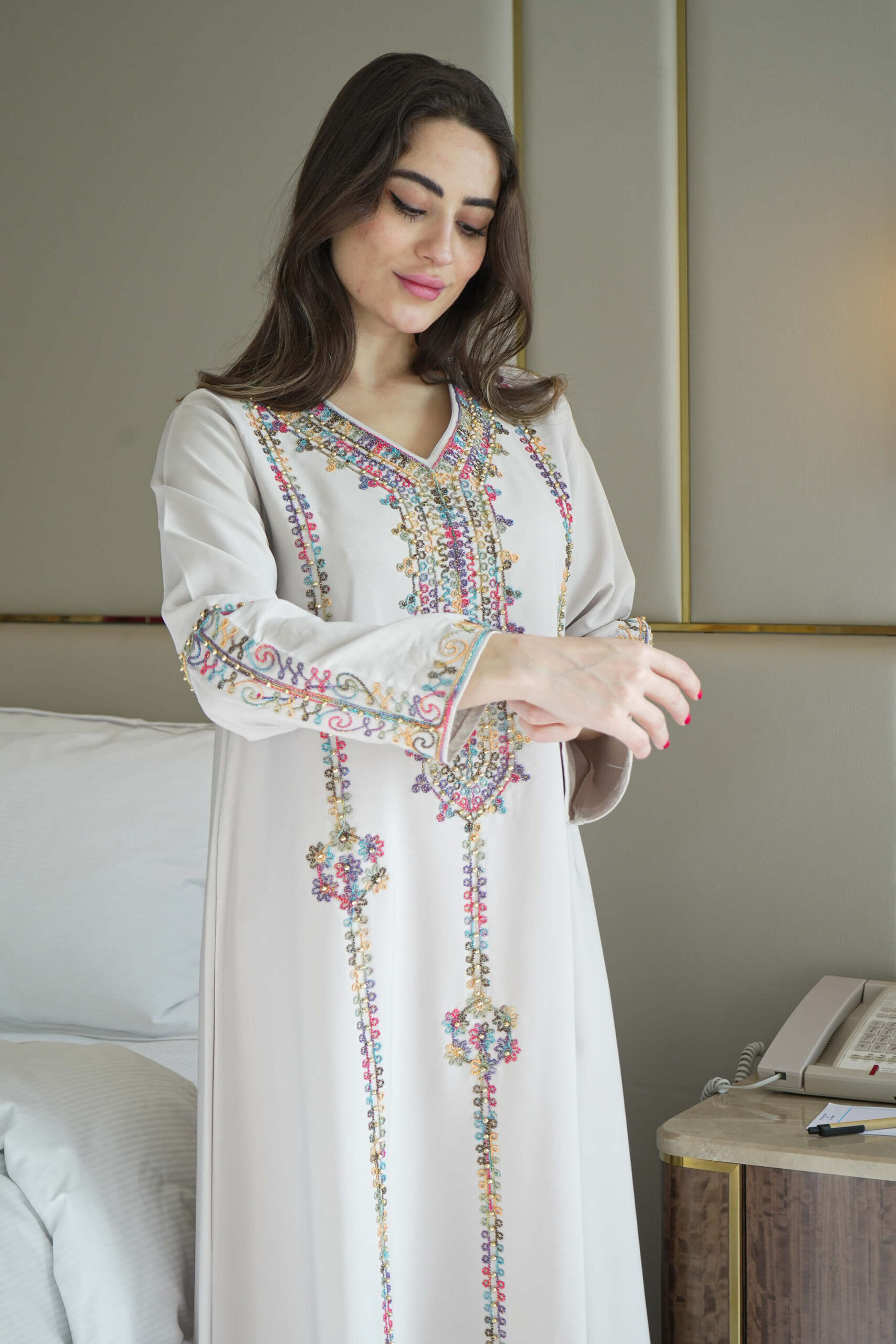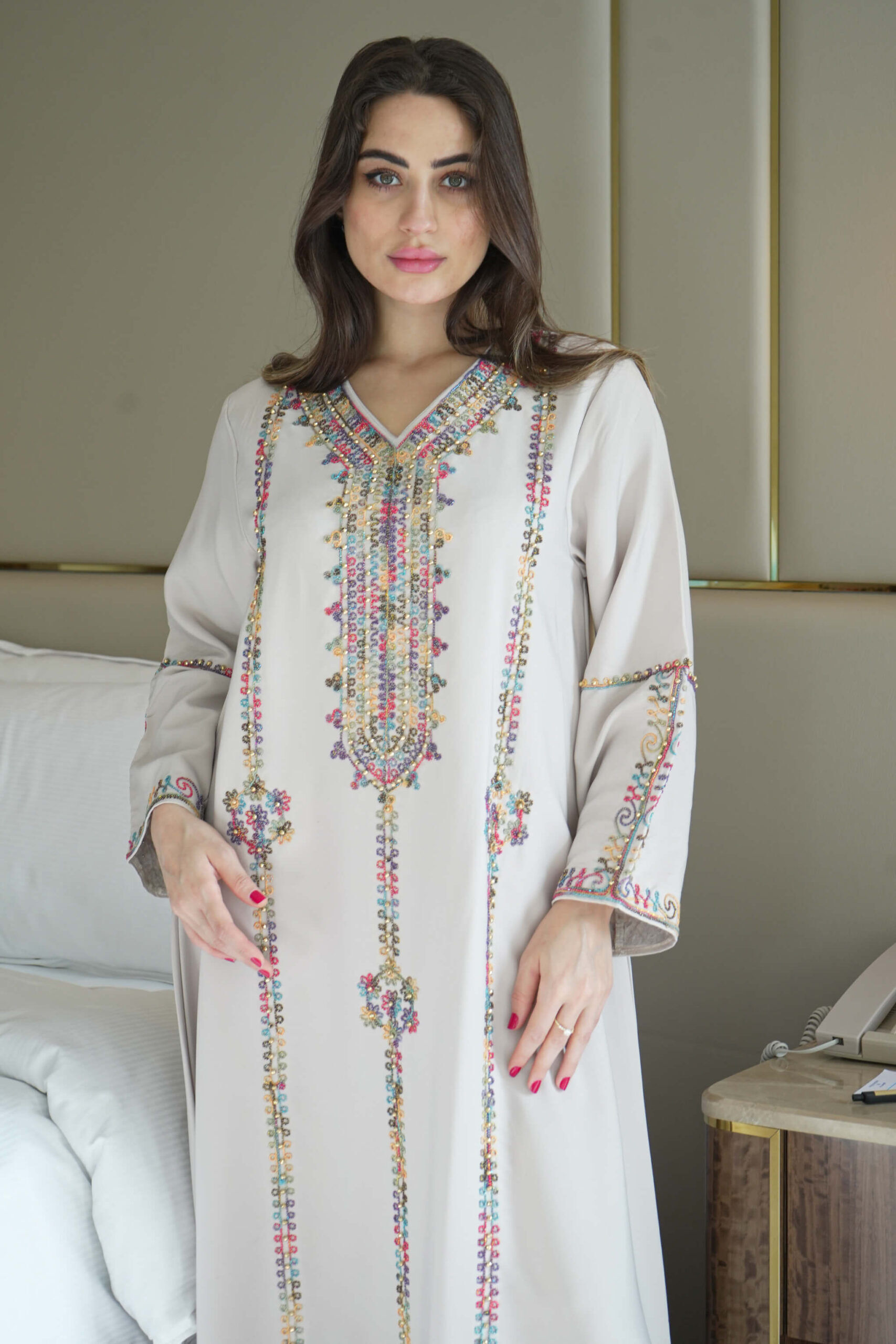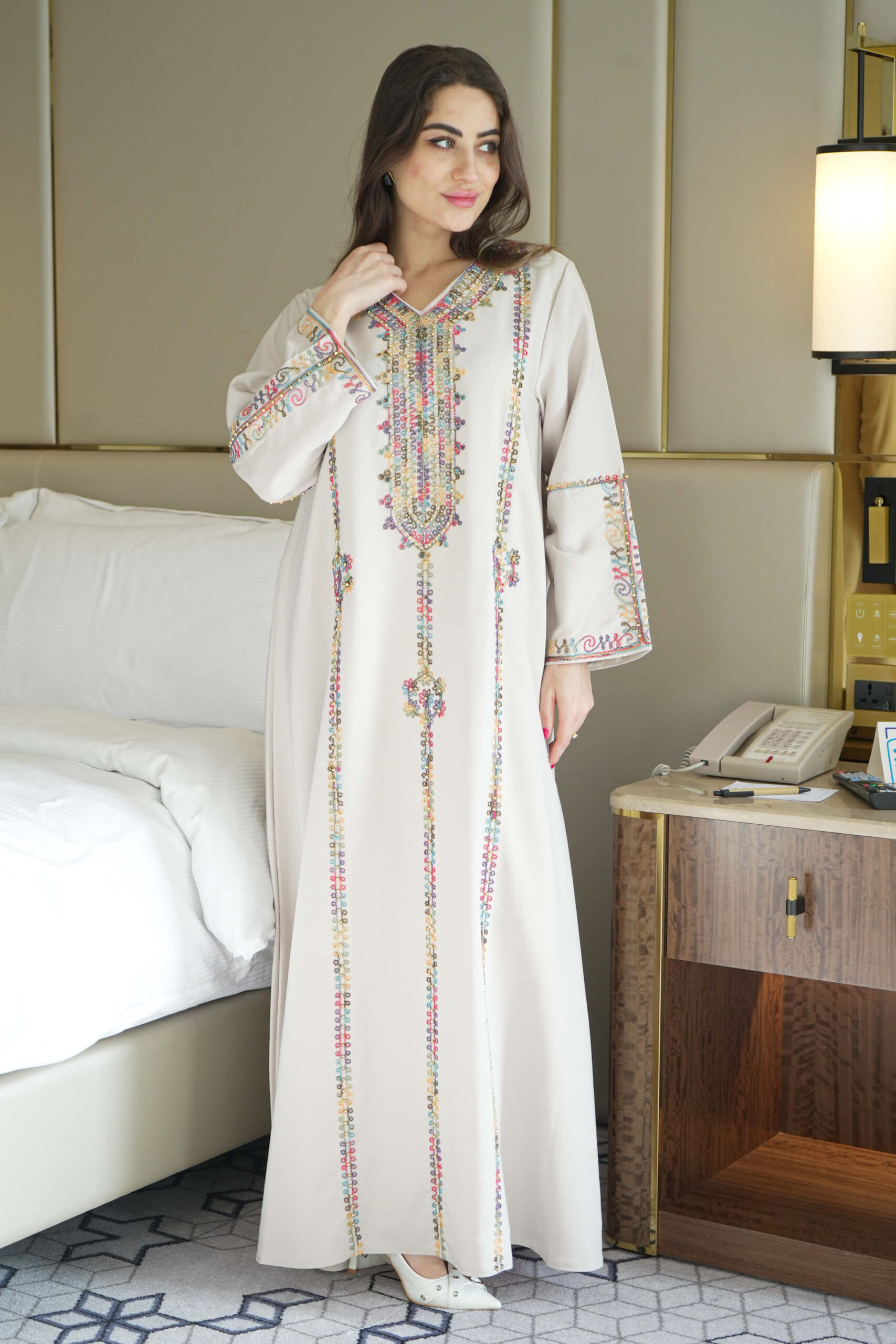 جلابية بلون بيج ساترة و محتشمة بتطريز على الصدر بدقات ملونه و فصوص وعلى الاكمام عندك مناسبة مهمة !