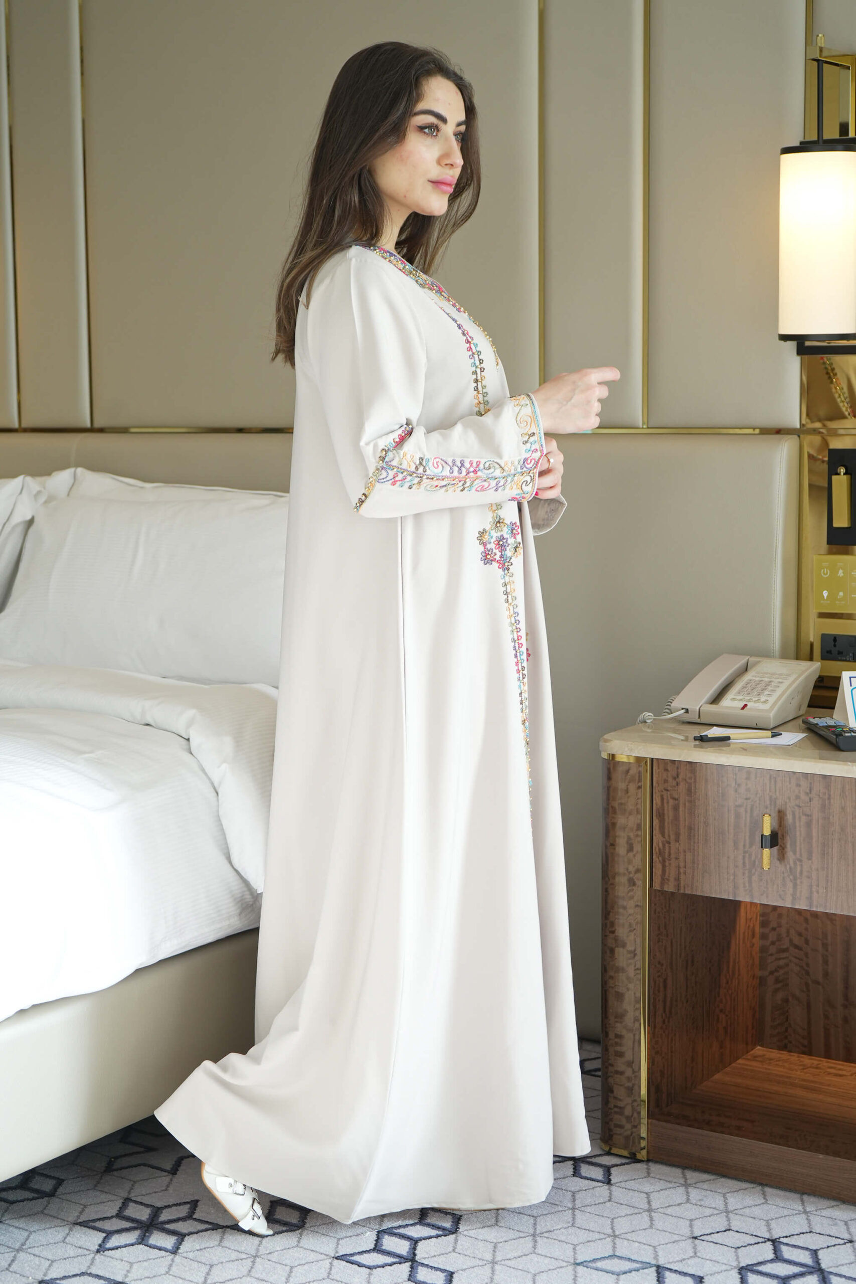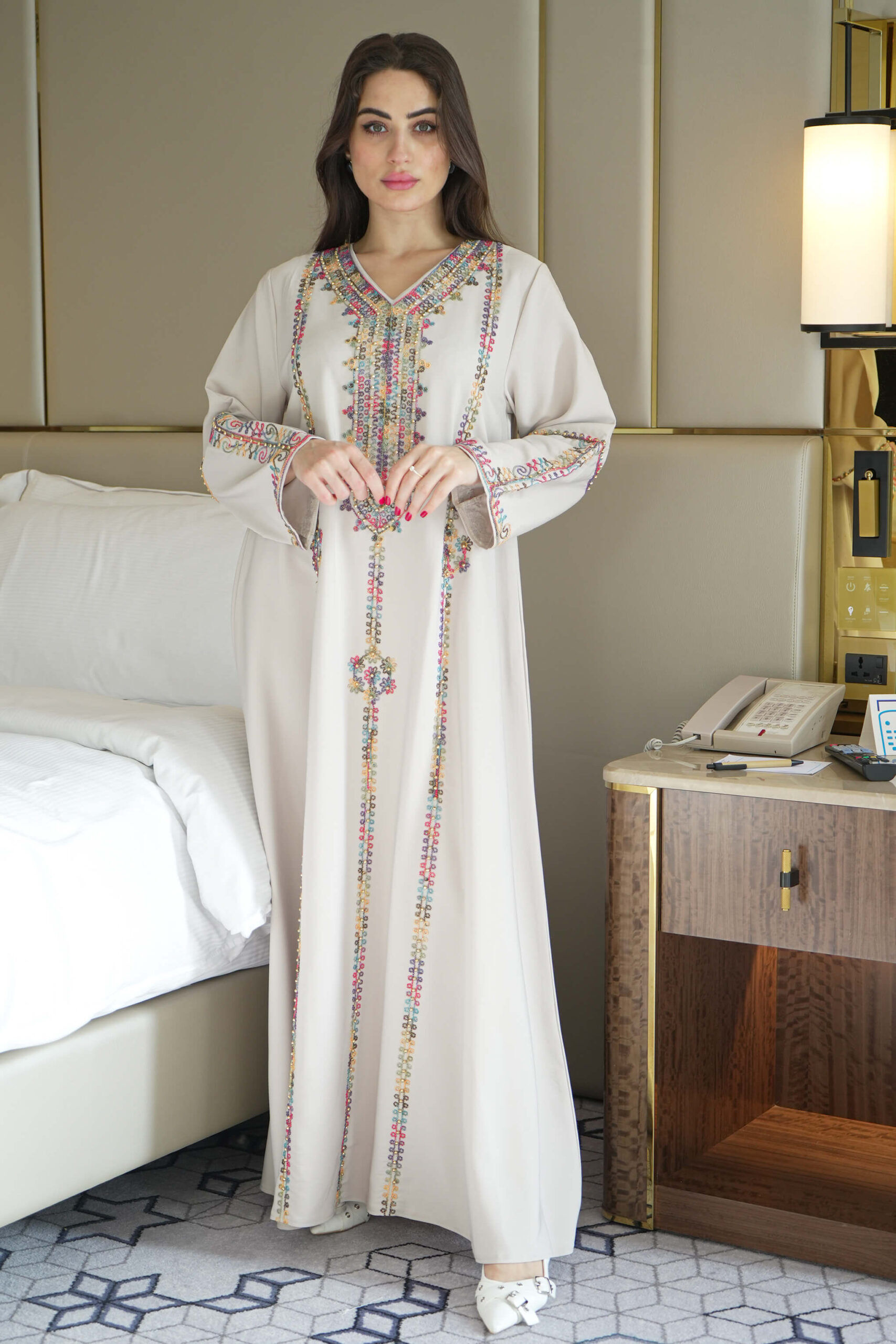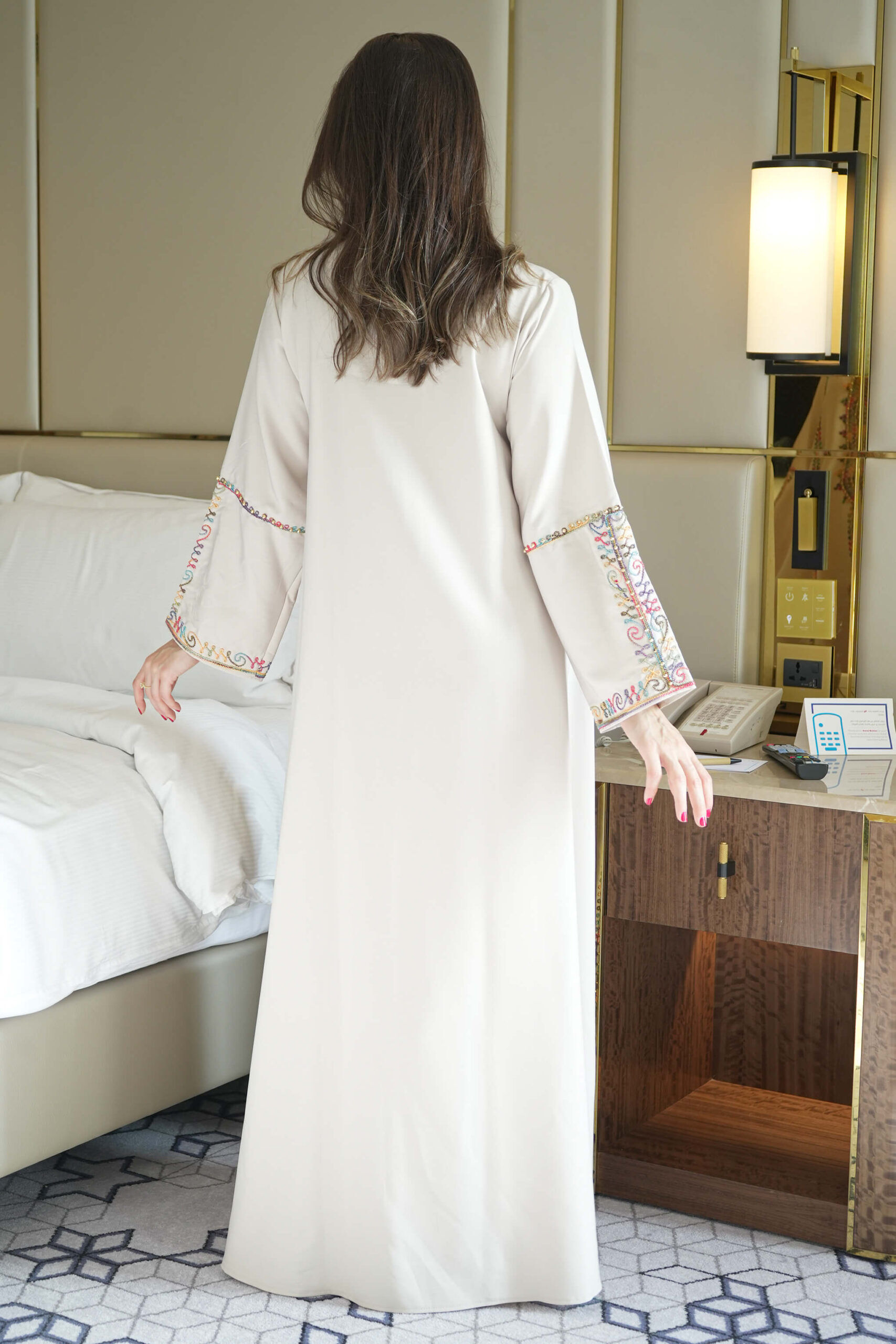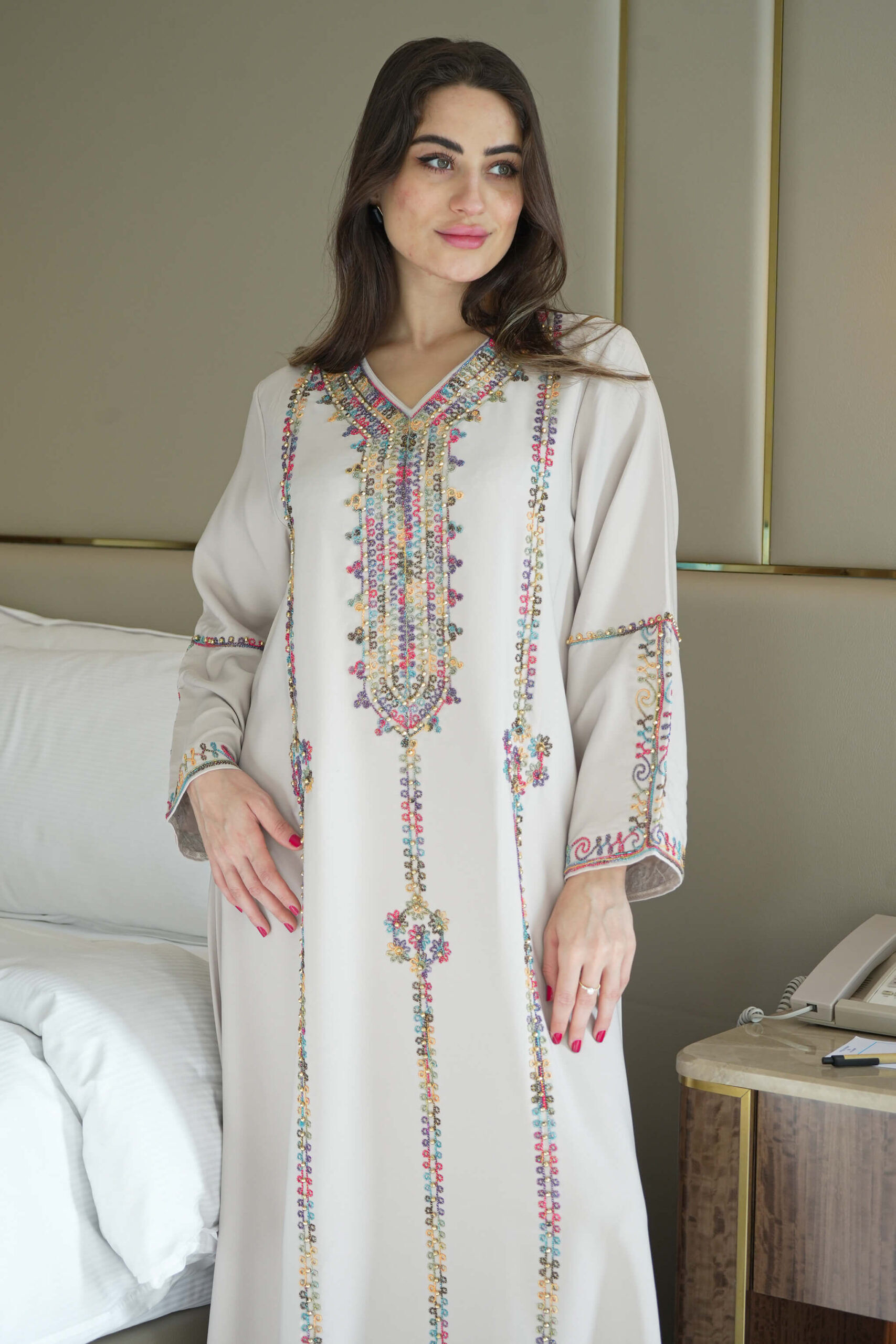 جلابية بلون بيج ساترة و محتشمة بتطريز على الصدر بدقات ملونه و فصوص وعلى الاكمام عندك مناسبة مهمة !
