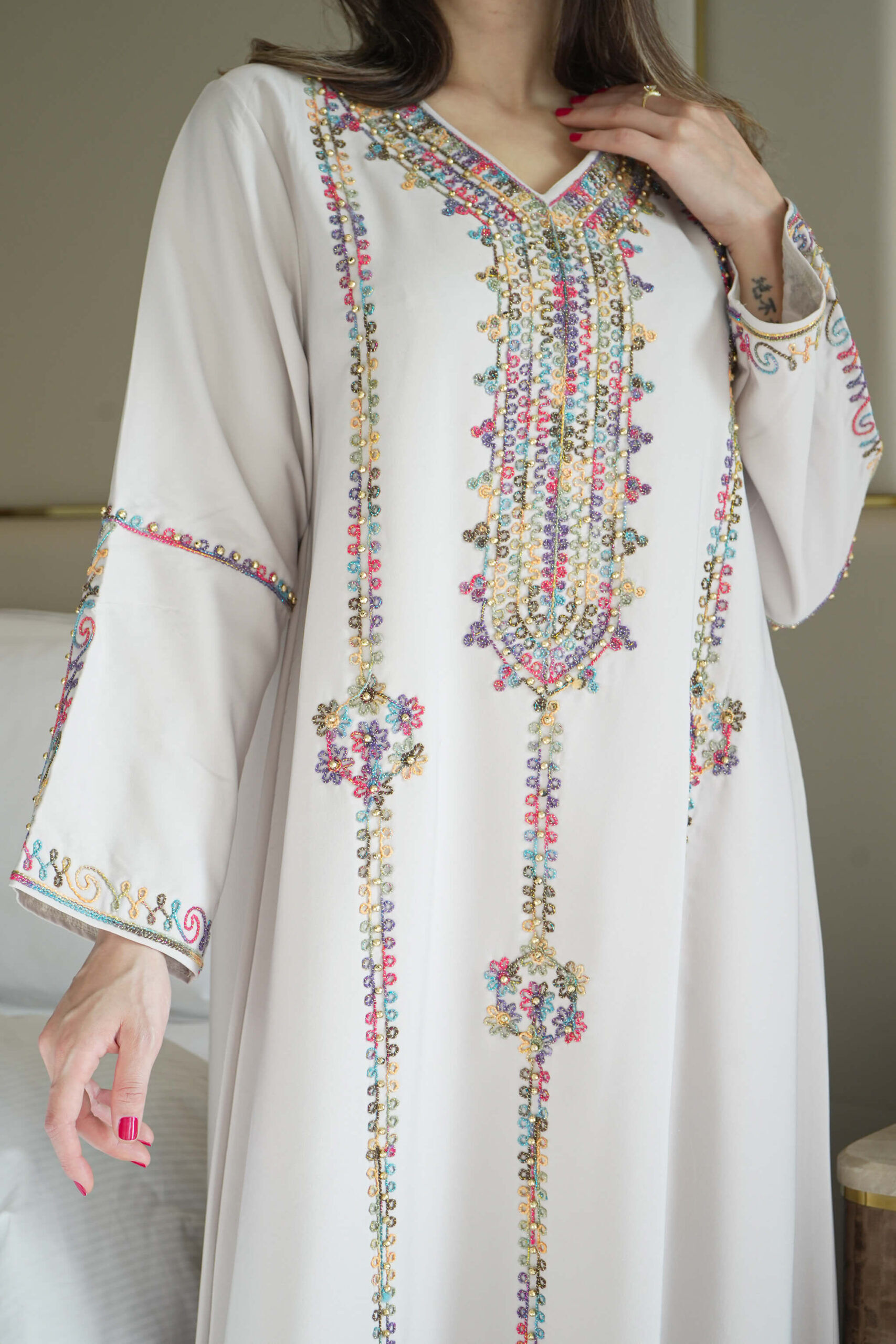 مـمـيـزات جلابية بلون بيج بتطريز :