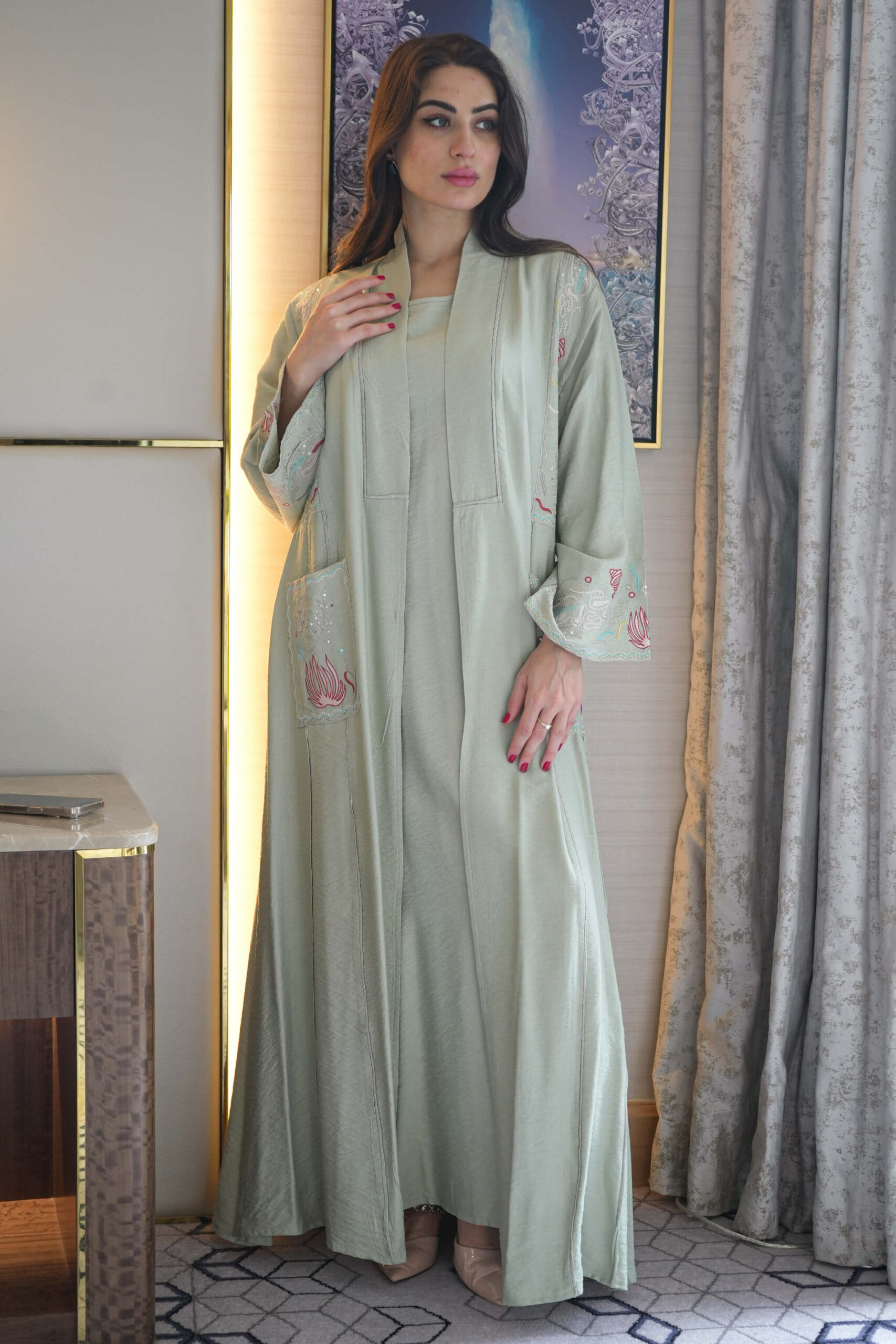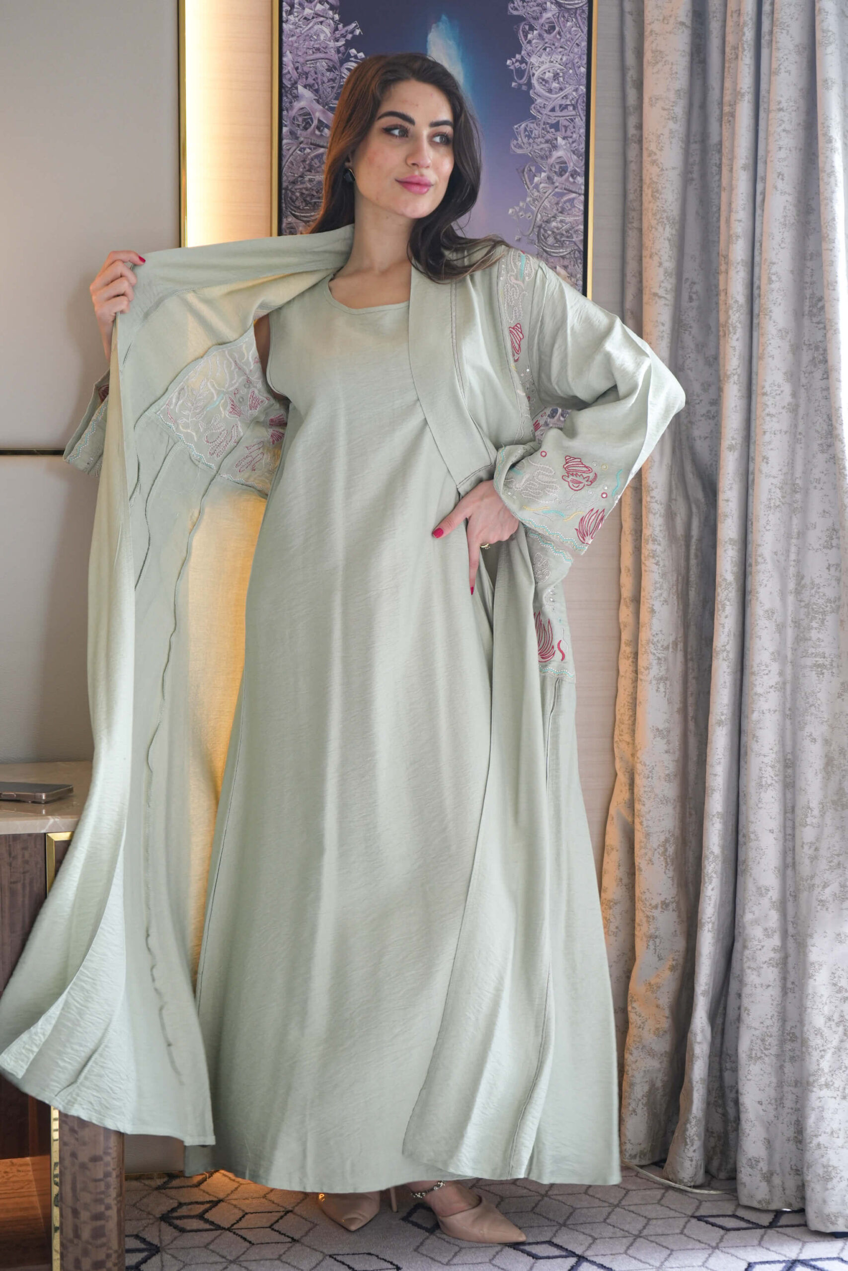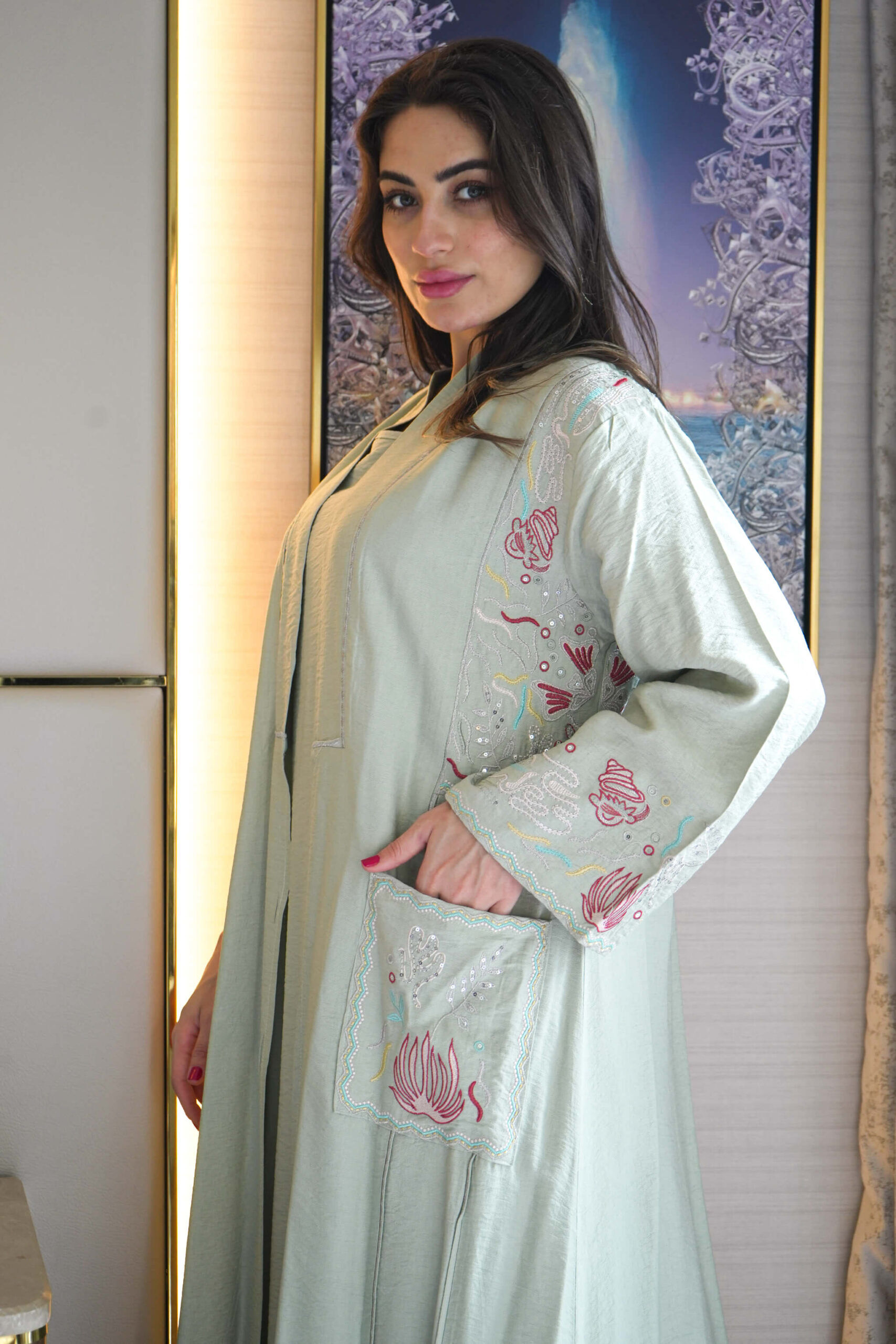 جلابيه اخضر بطبقه داخليه و تطريز من الصدر ممتده على اكتاف