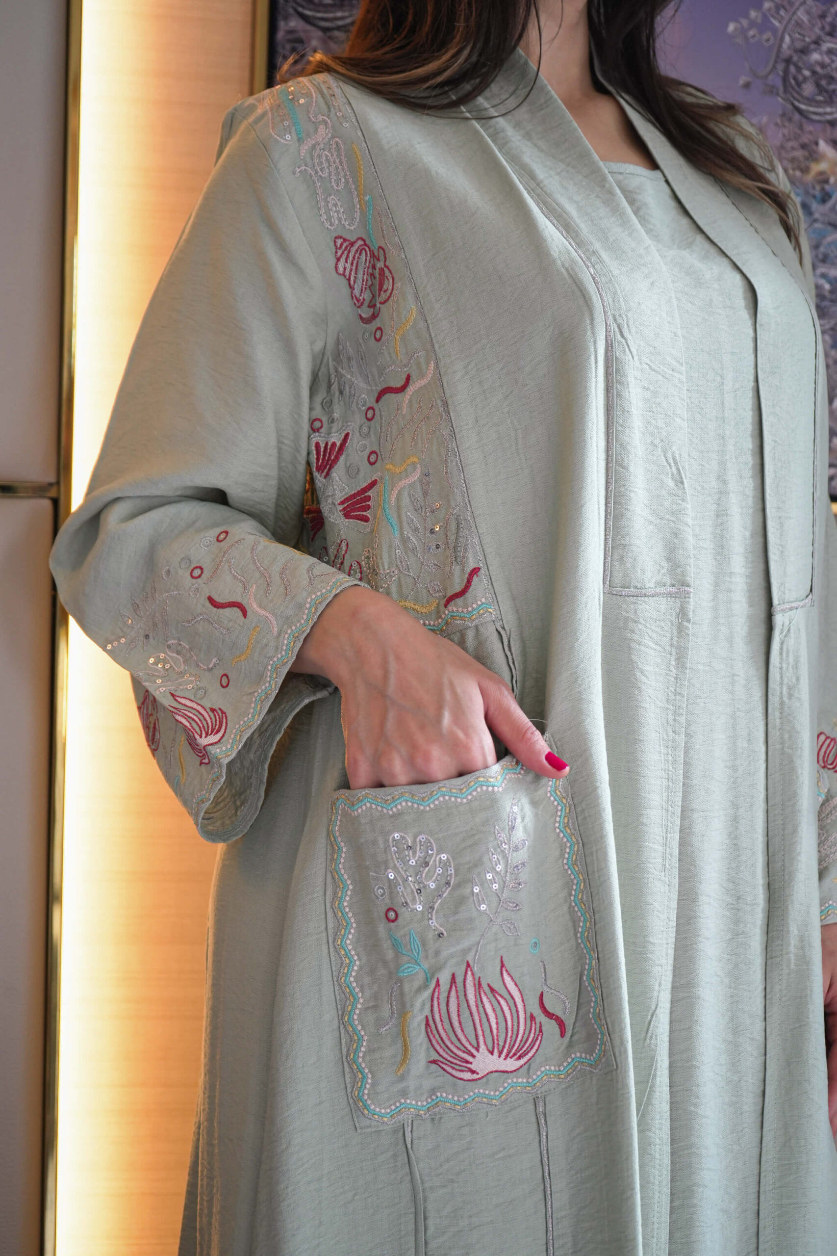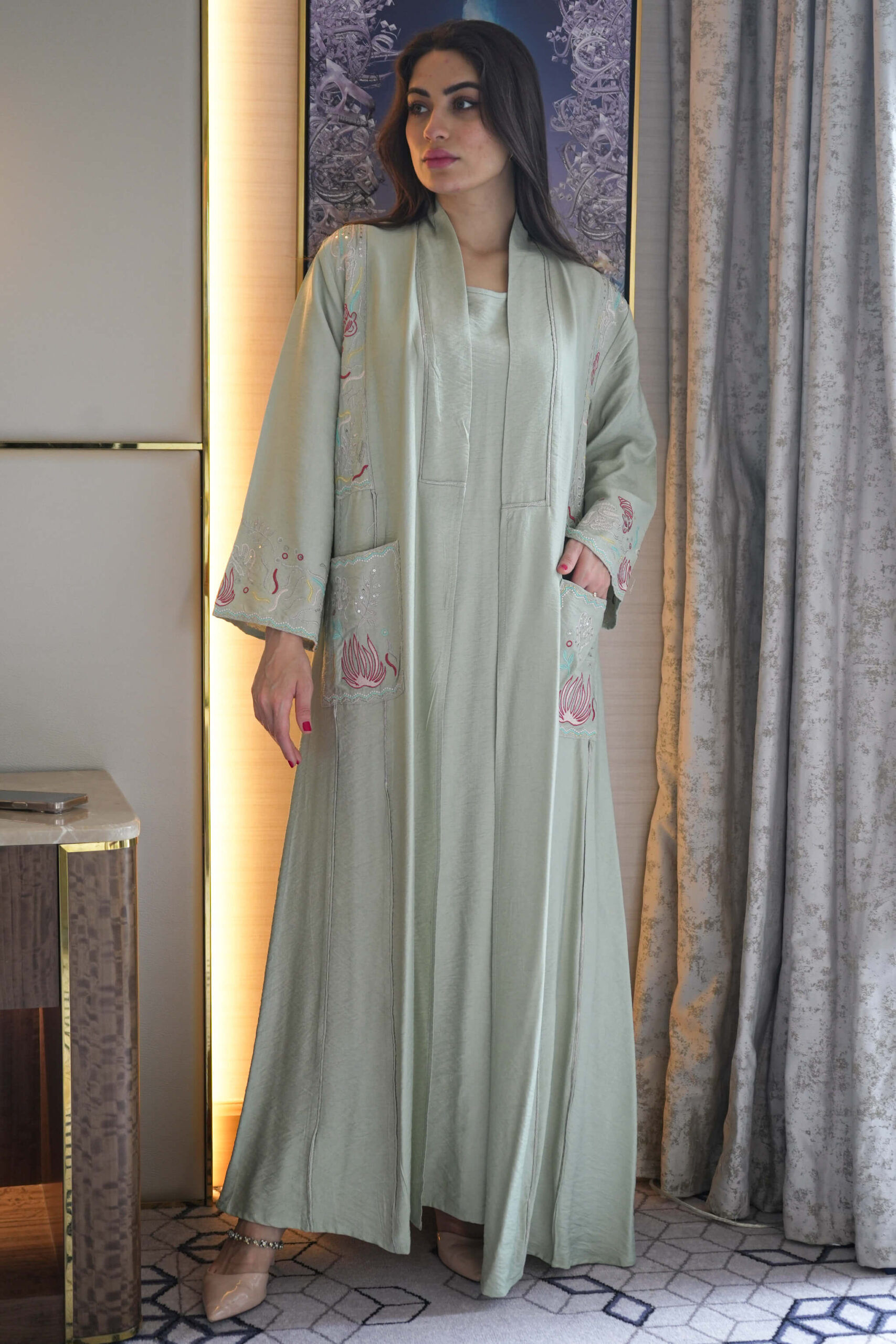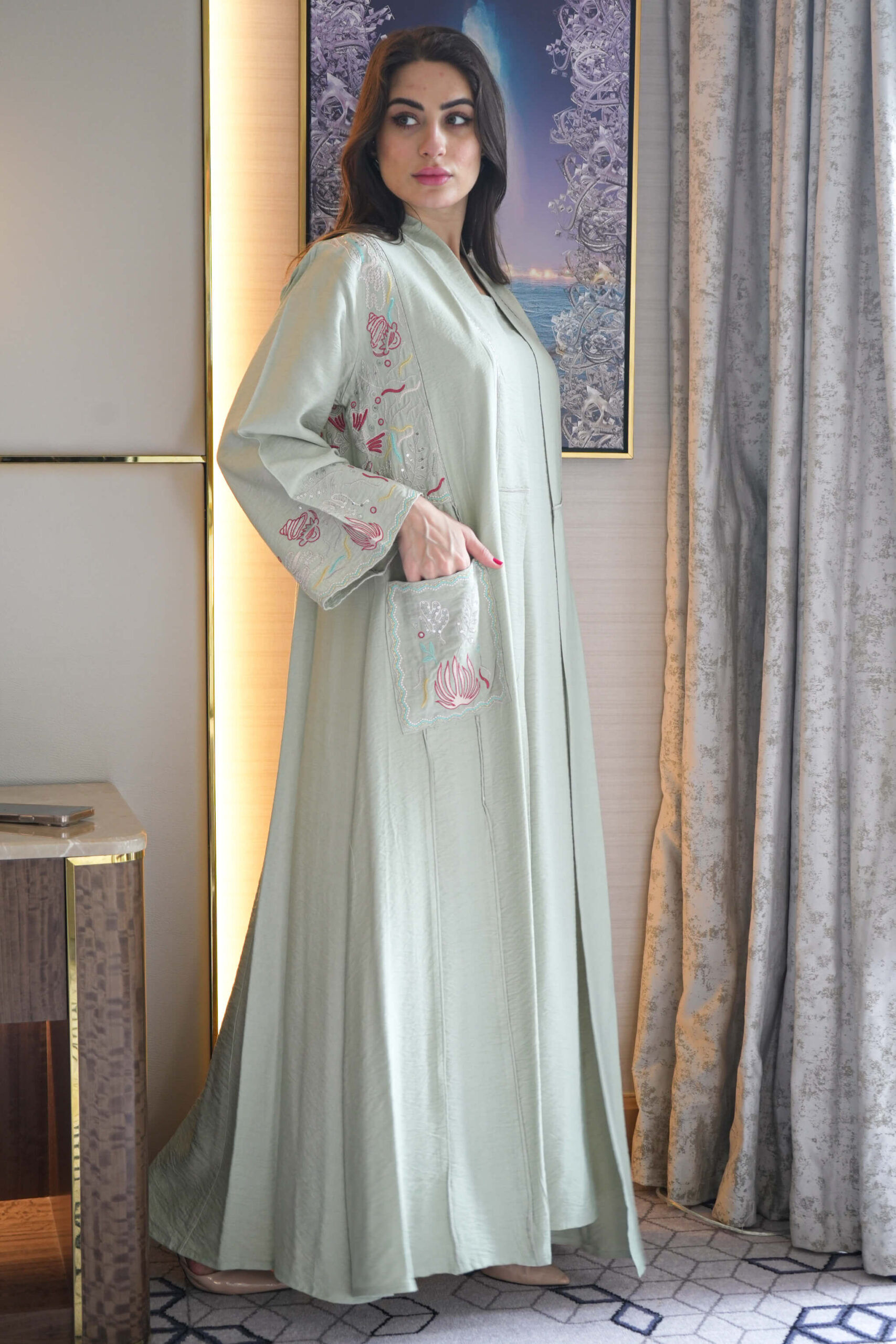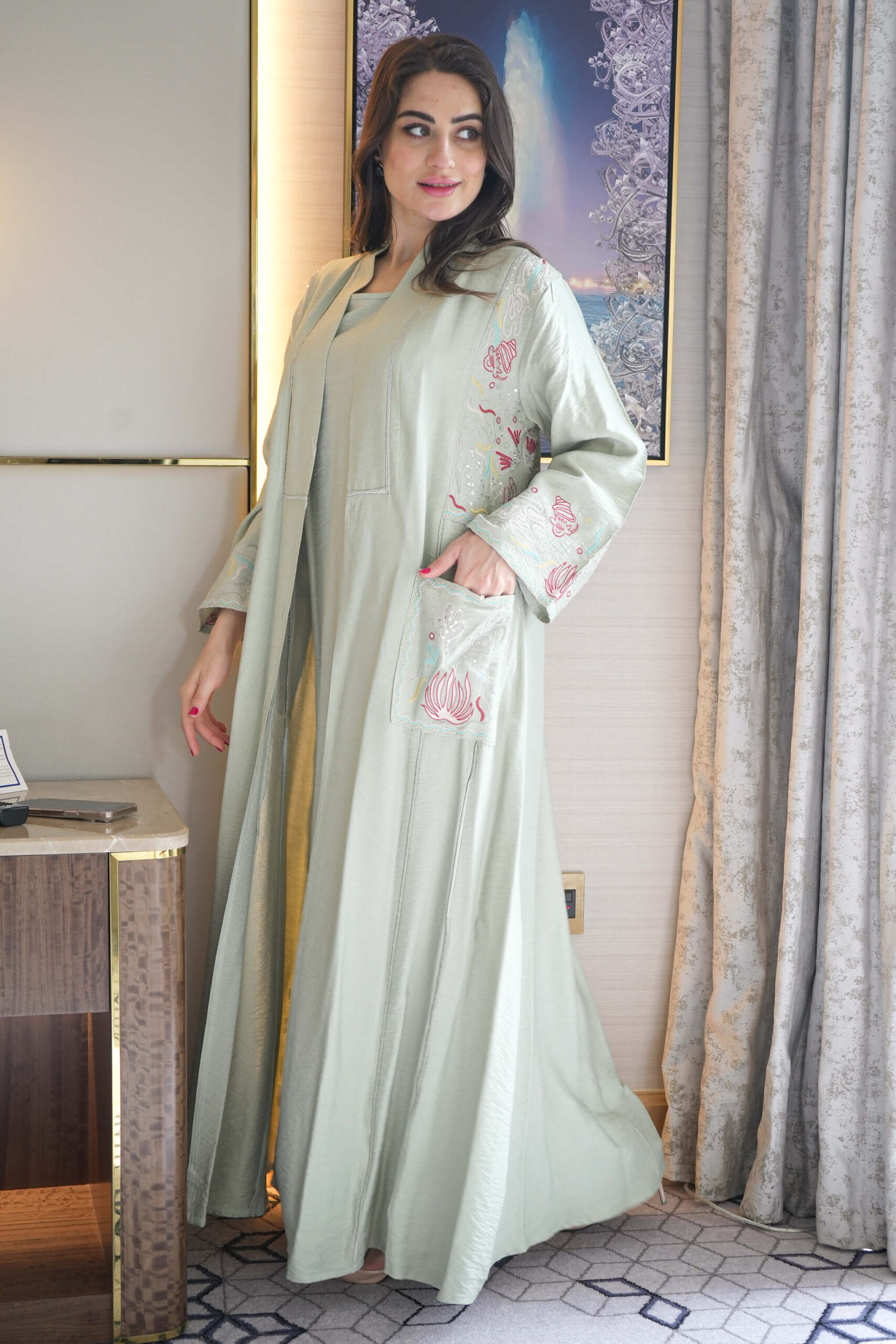 جلابيه اخضر بطبقه داخليه و تطريز من الصدر ممتده على اكتاف