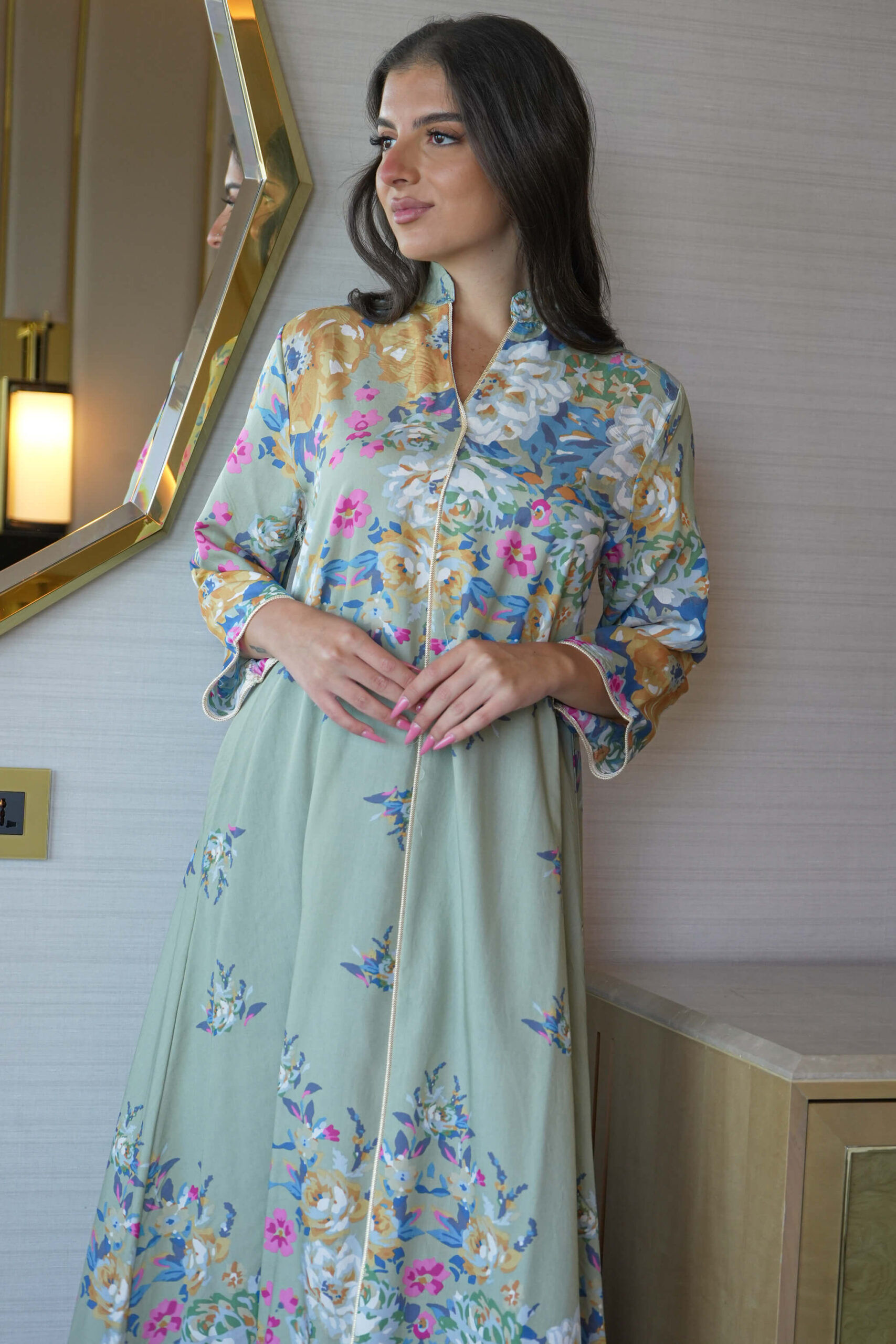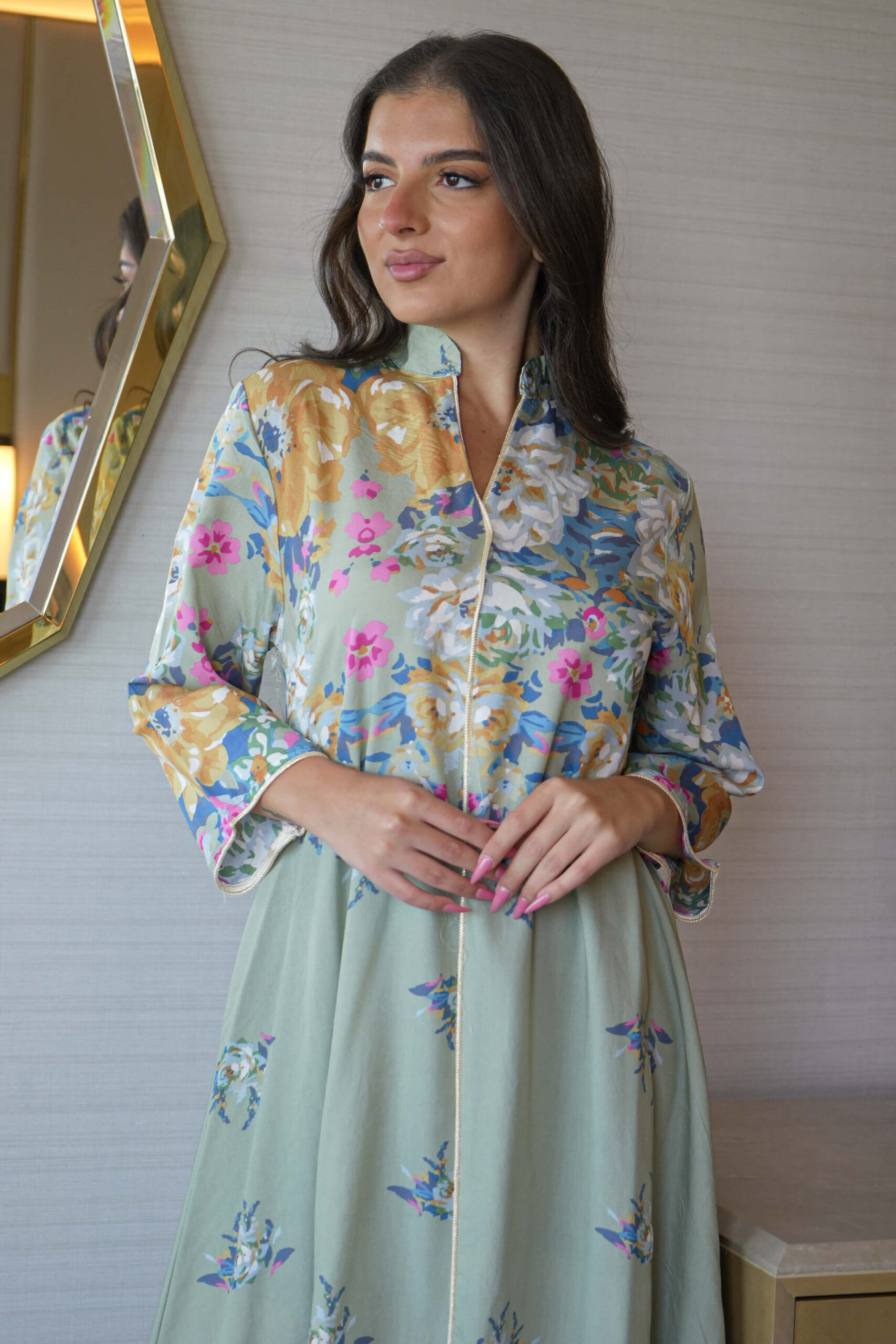 جلابية تيفاني مطرزة بوردي و اخضر بدقاق مخفية