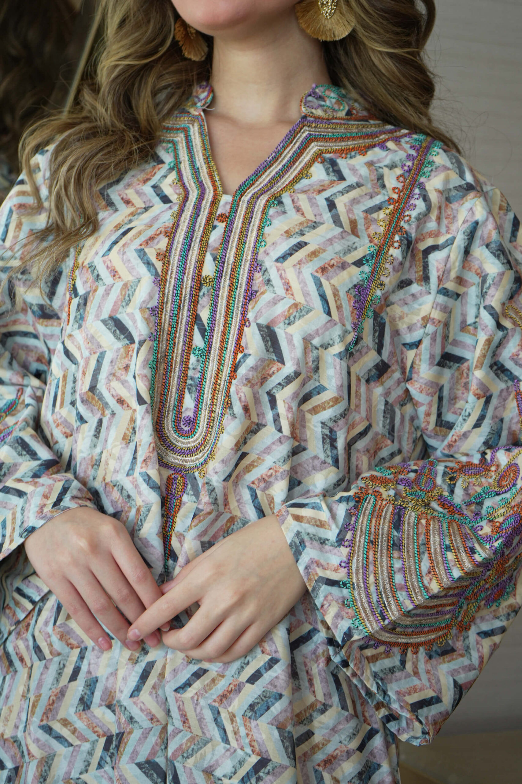 جلابية سماوي بتطريز دقات ملونة من الأمام و اكمام