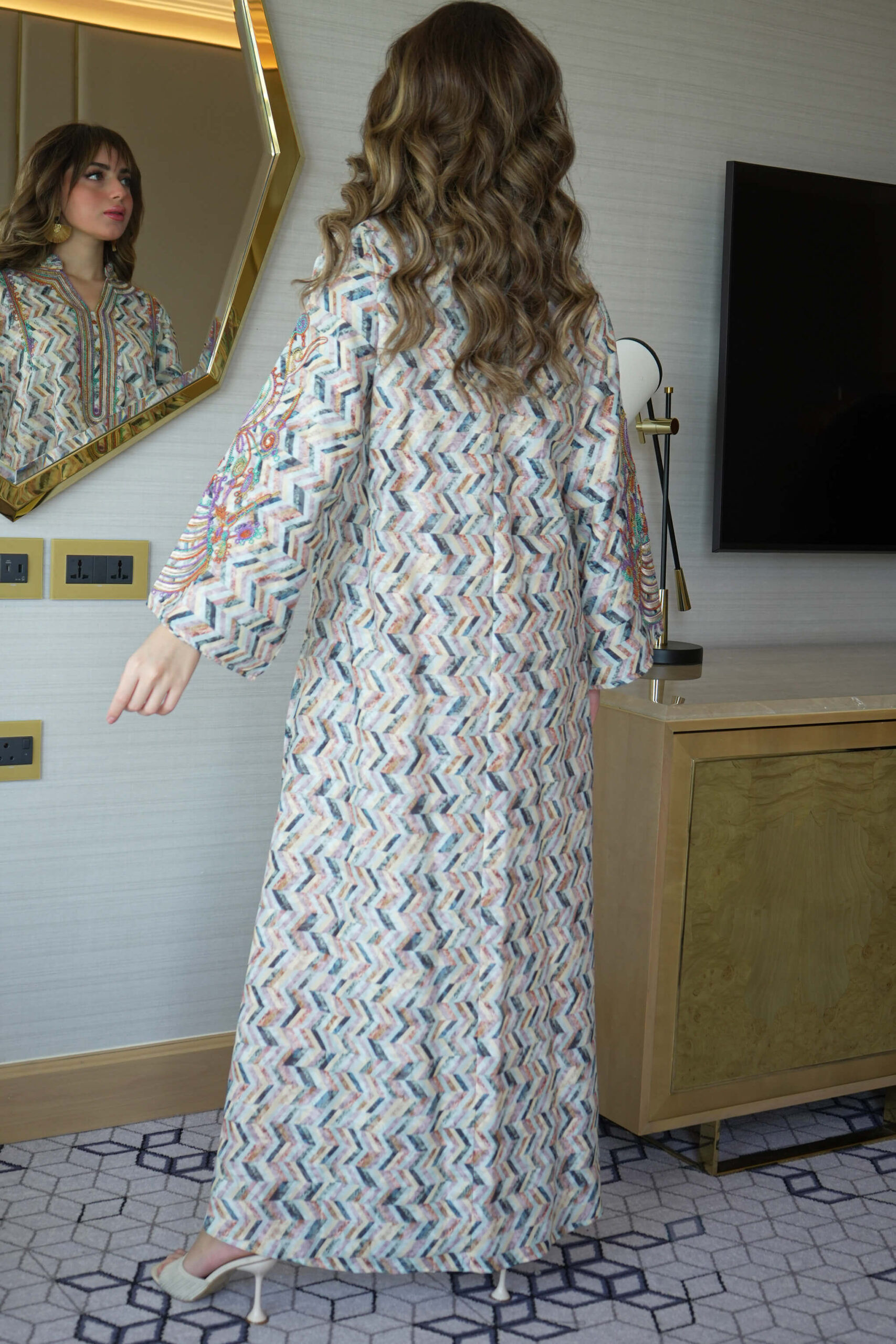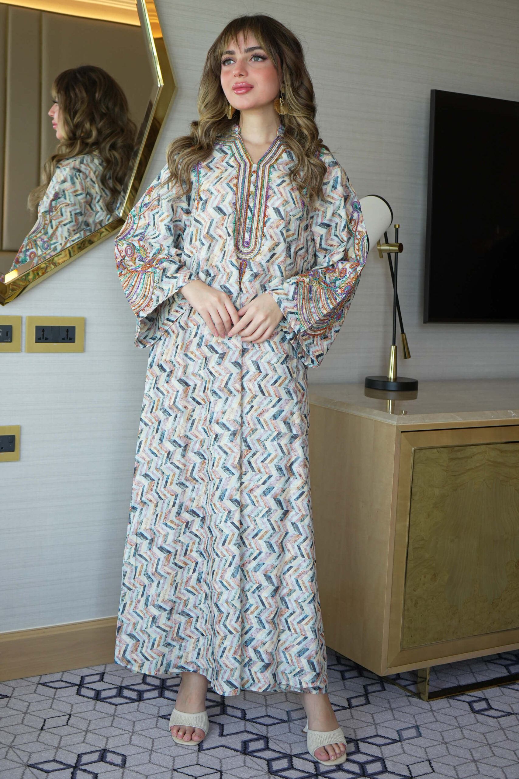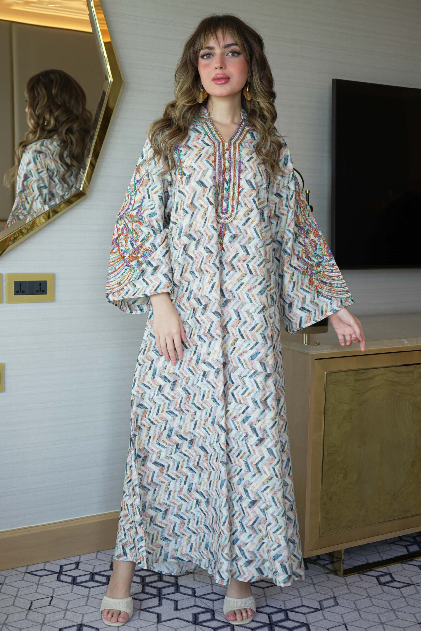 - التصميم : جلابية مطرزة بدقات ملونه من امام وكم
