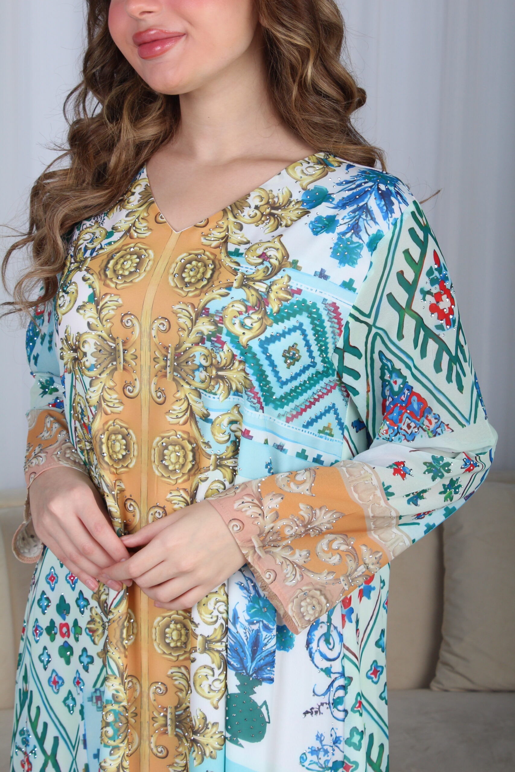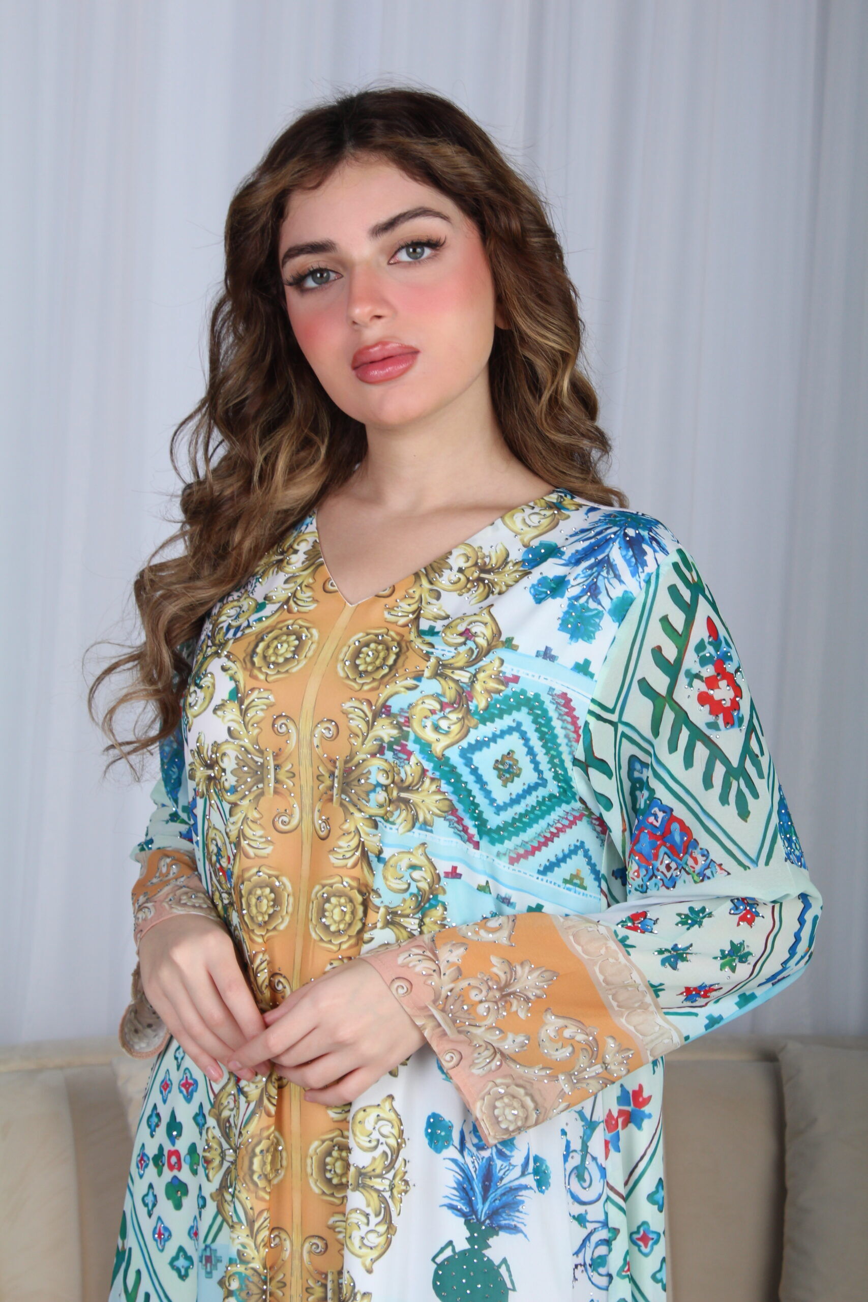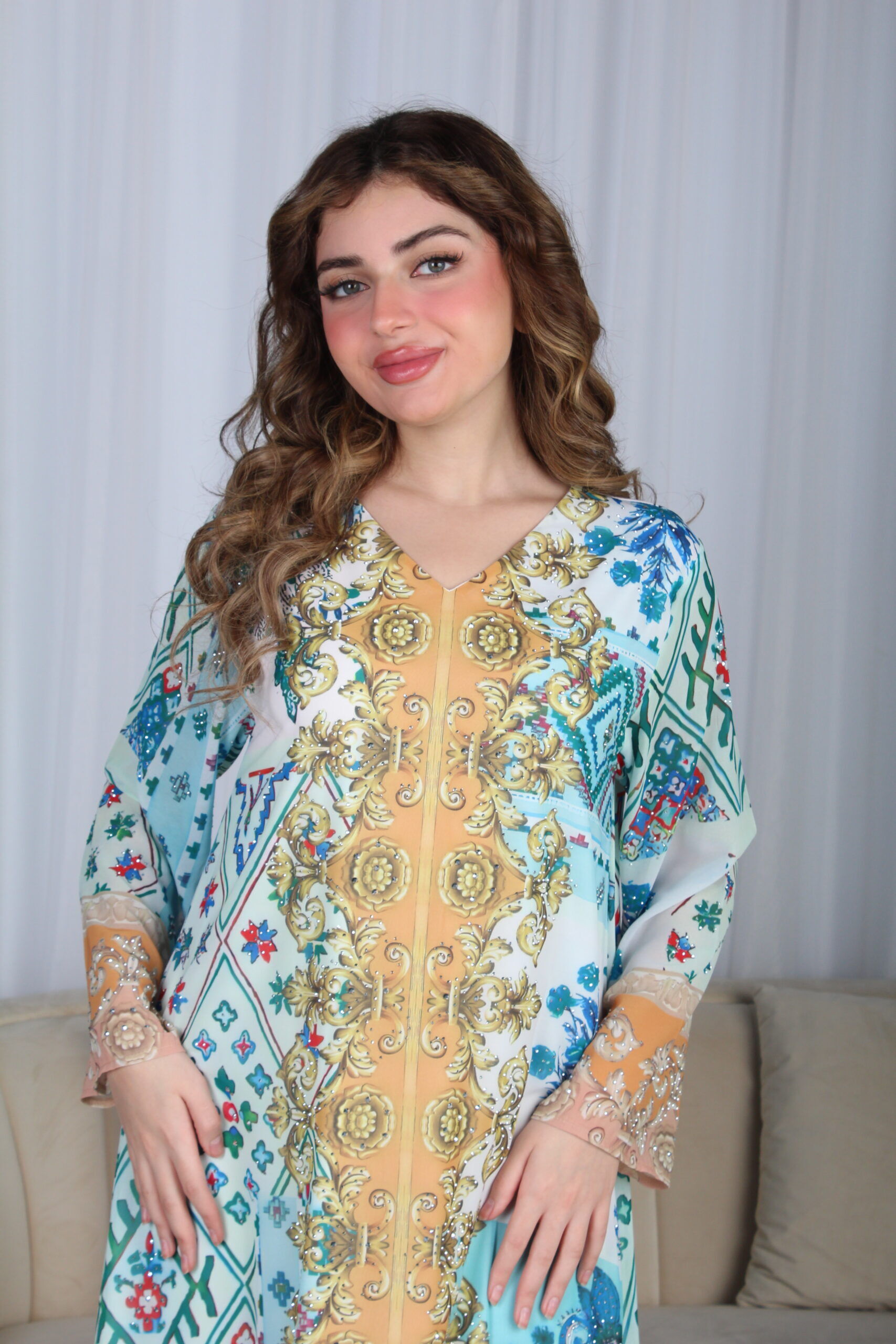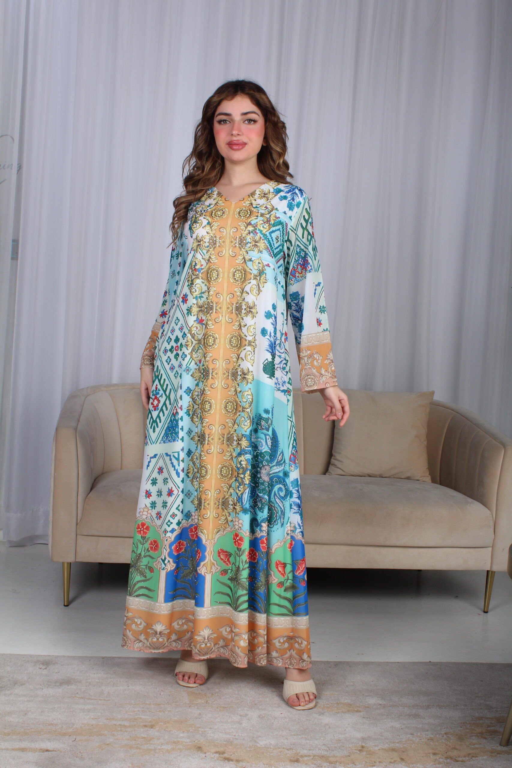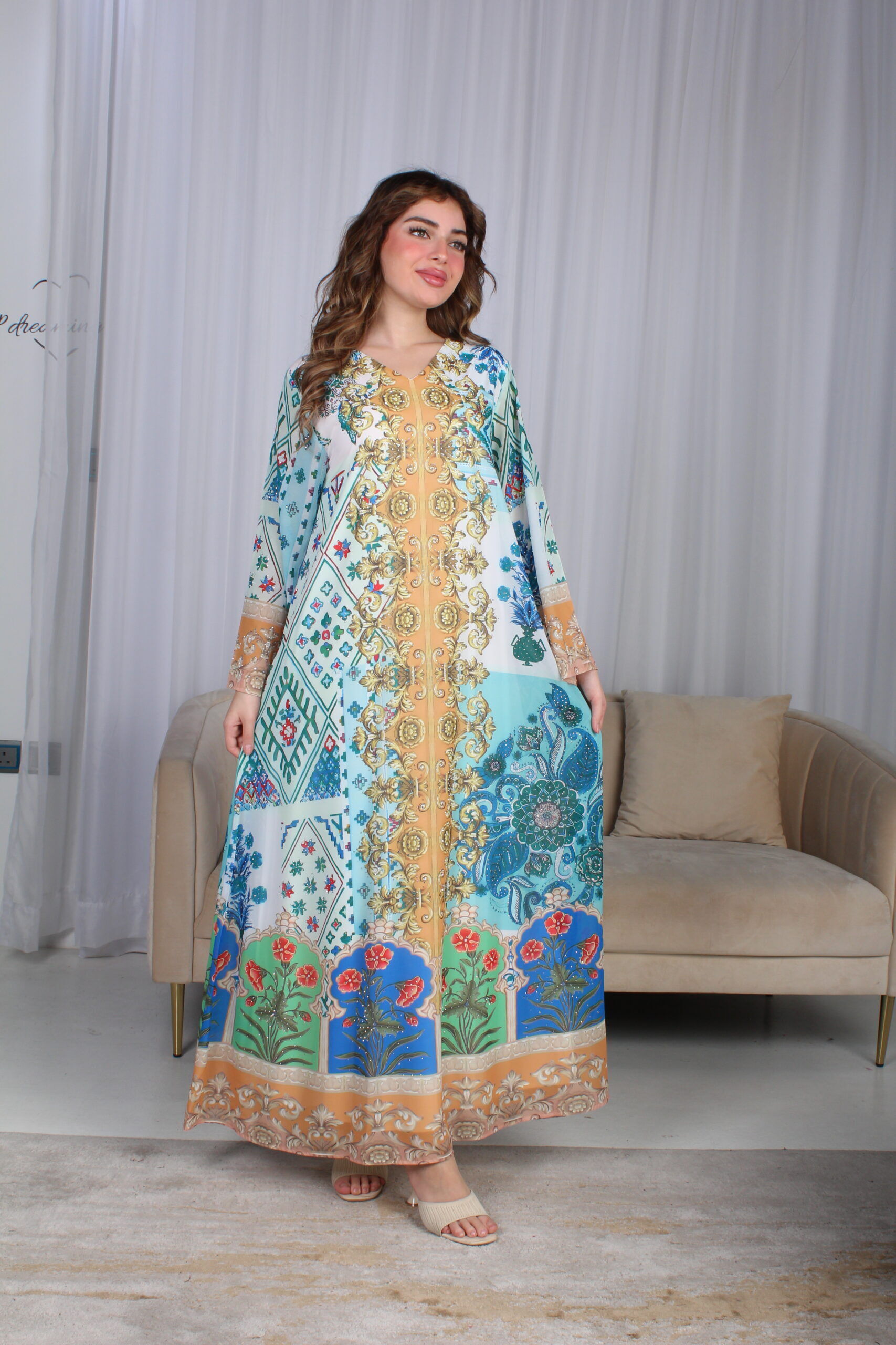 جلابية سماوي حرير بالوان مشجره و فصوص